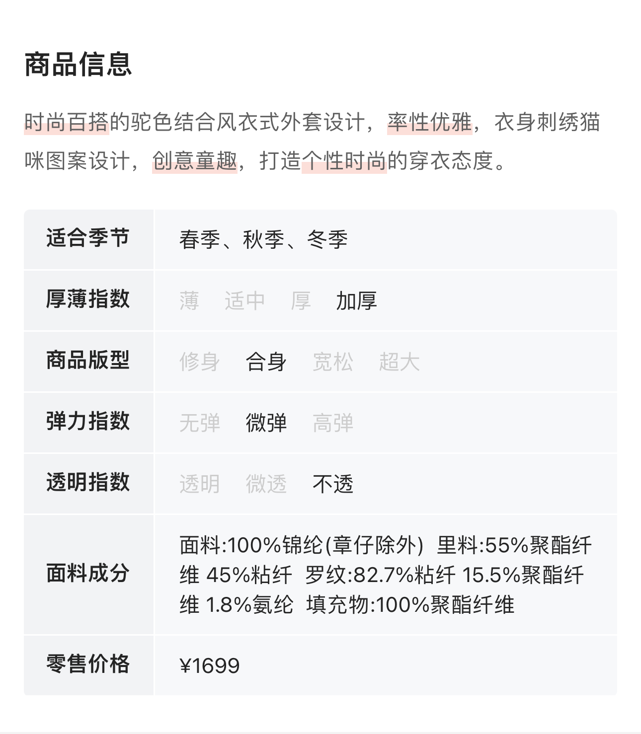 OCHIRLY欧时力 猫咪刺绣长外套 11073