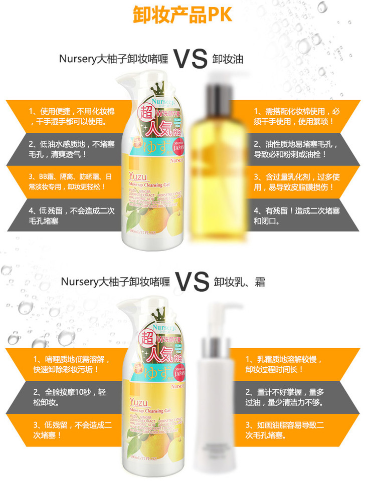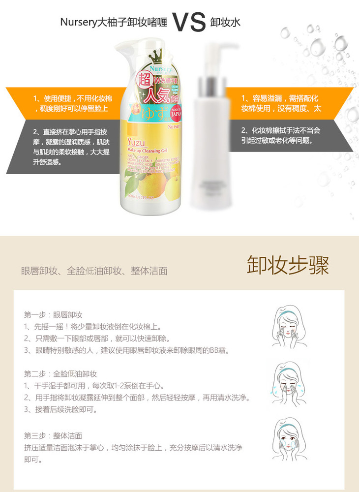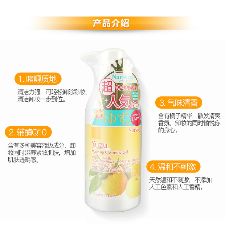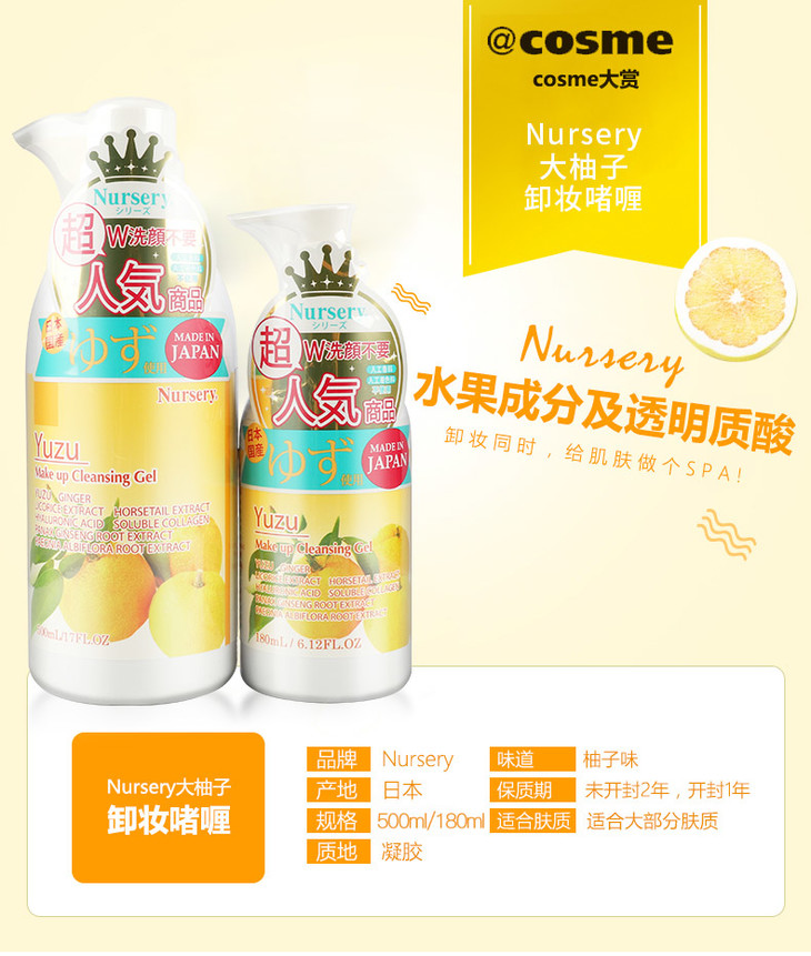 日本Nursery/柚子卸妆清爽温和清洁不刺激柚子味卸妆啫喱乳大小180ml500ml