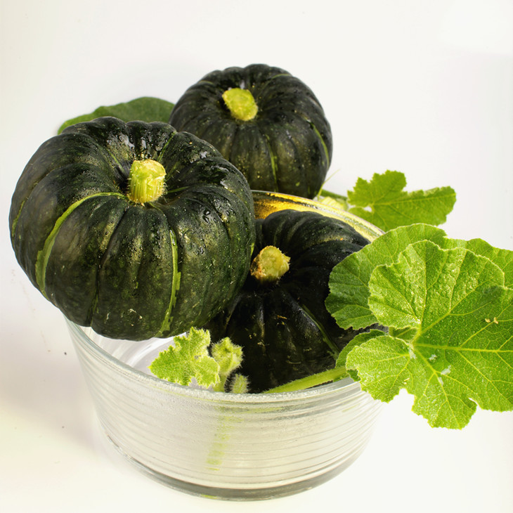 果皮黑绿色带浅绿色条纹,果重约500g的扁圆形强粉质品种。作为迷你南瓜口味特佳,微波炉内整个加热5-8分钟即可食用,品质超群。叶片比大果形品种小,长势旺盛,后期不易早衰,收获期长。单棵植株可以收获10个以上,产量高,雌花每隔3-4个节位着生,开花后35-40天可收获的早熟品种。