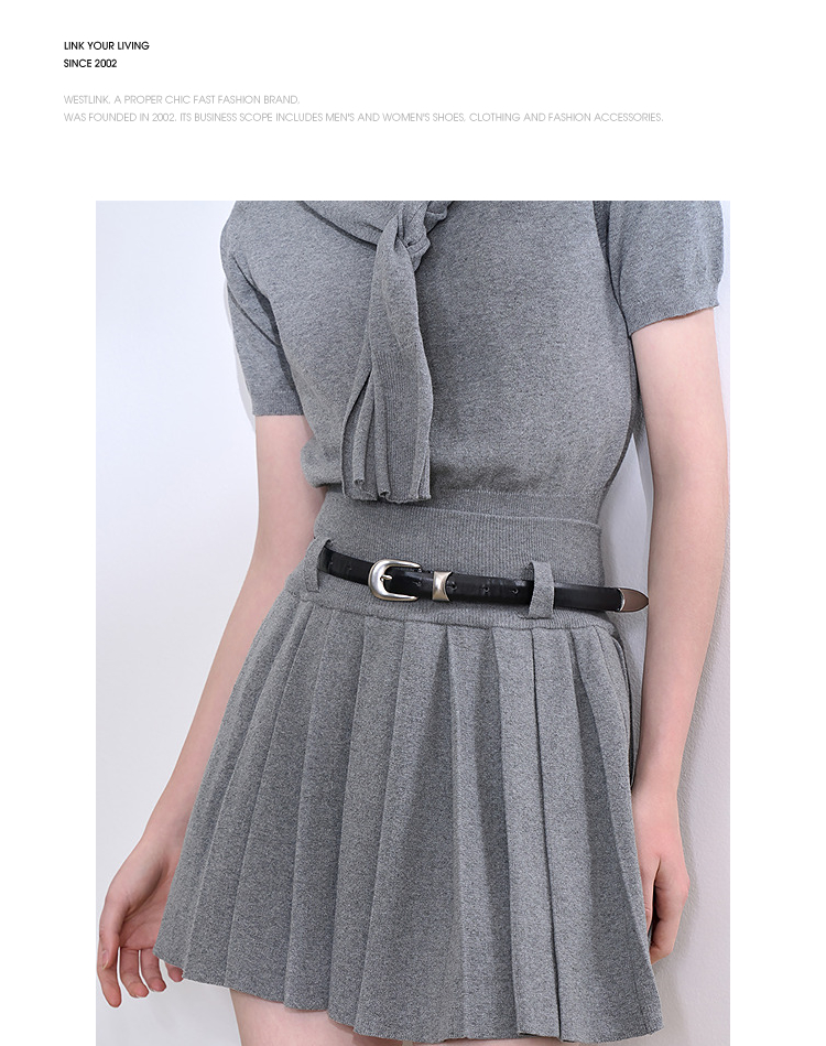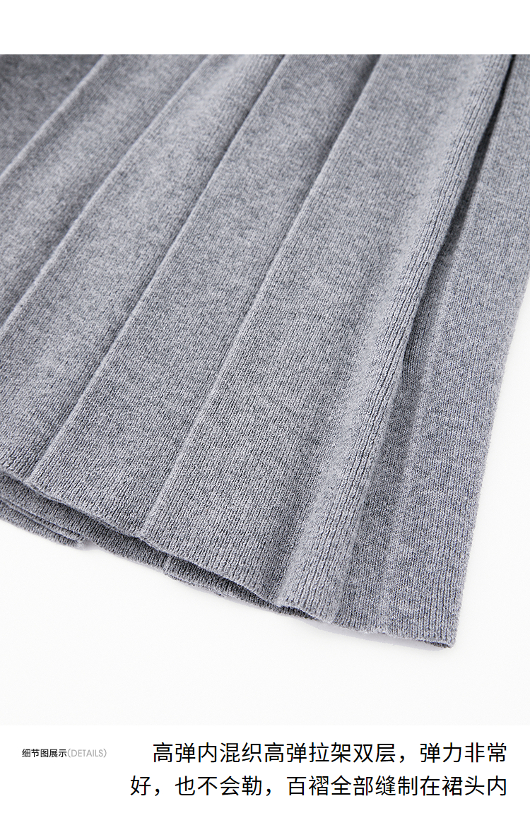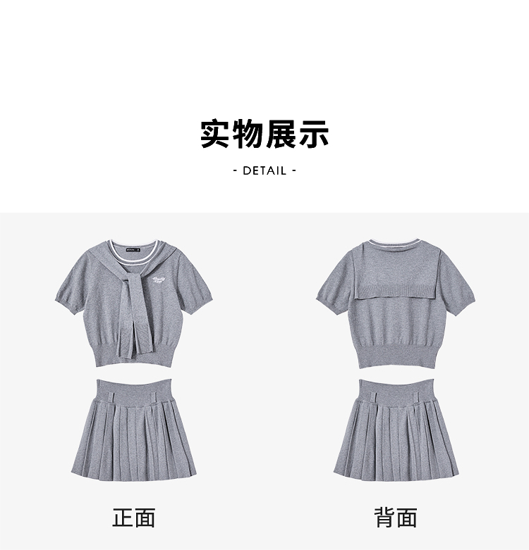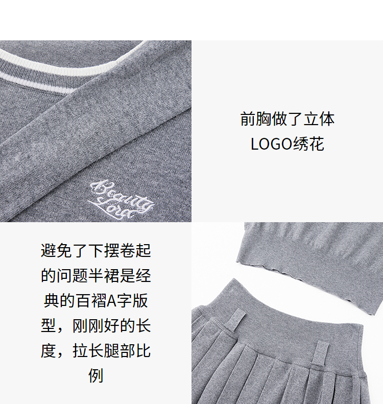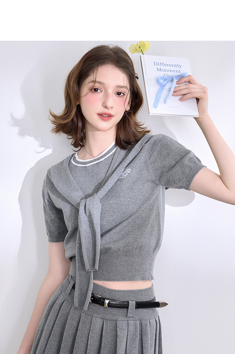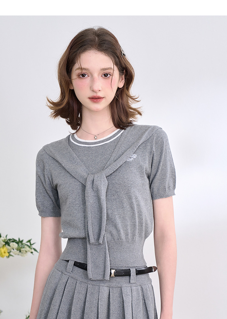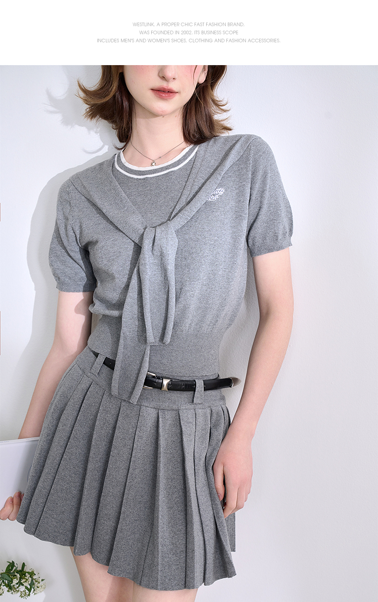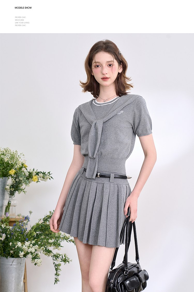 复古学院风针织套装女春夏绣花圆领T恤搭百褶裙搭披肩V0850321