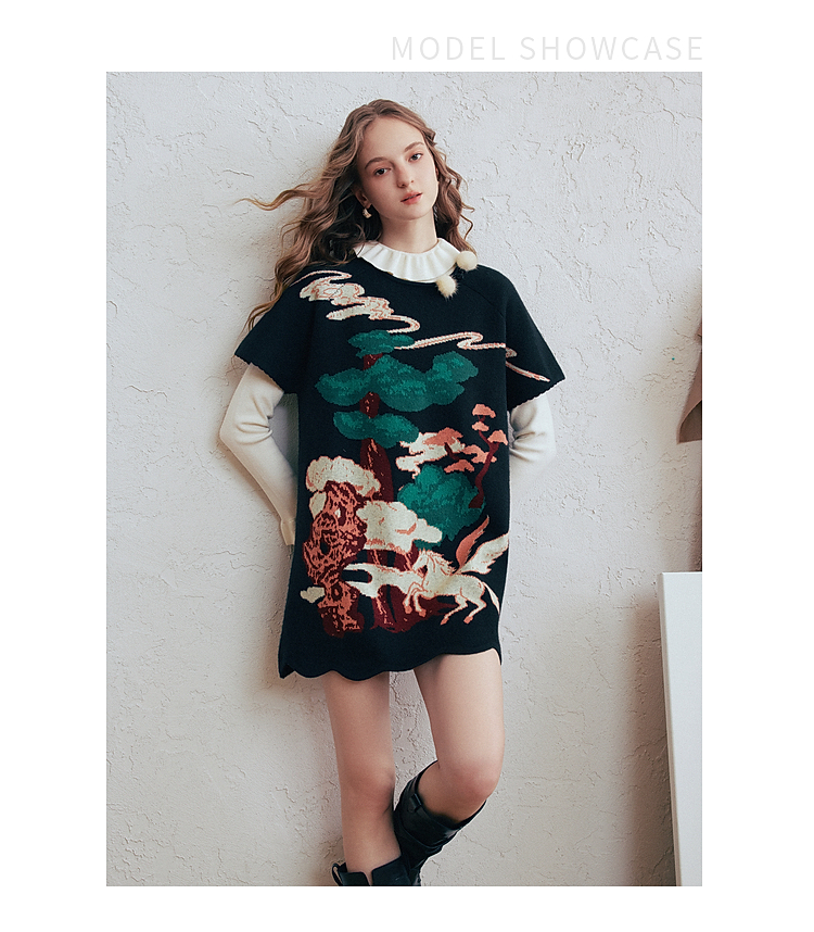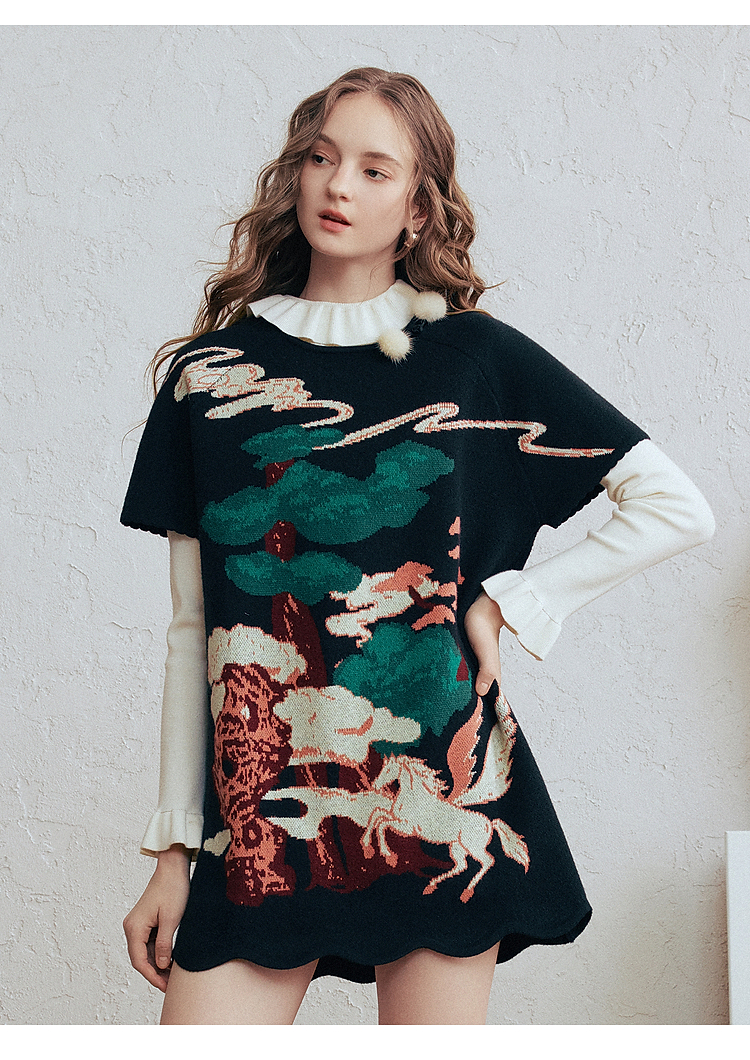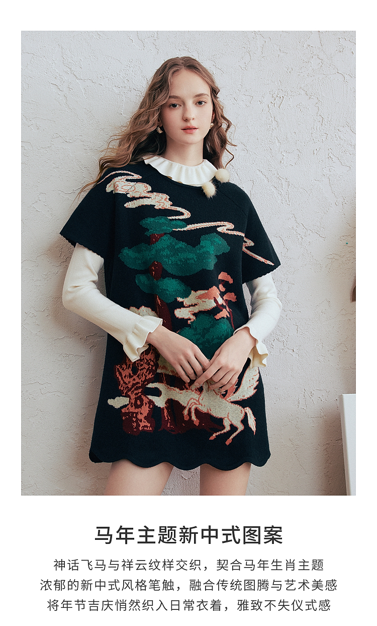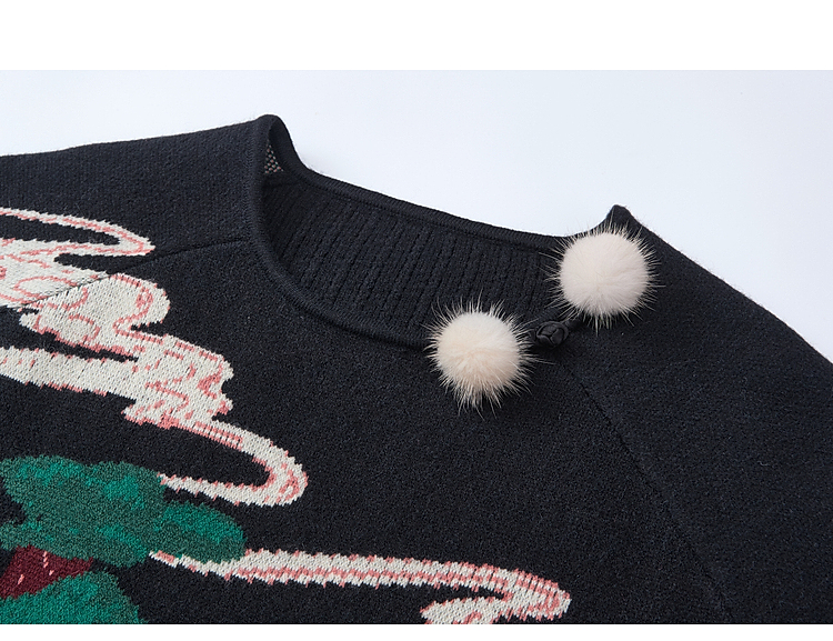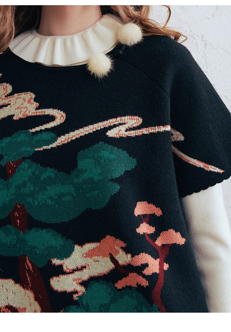 两三事 云驮松青 2026春季新款复古毛球装饰花色套头针织衫女宽松