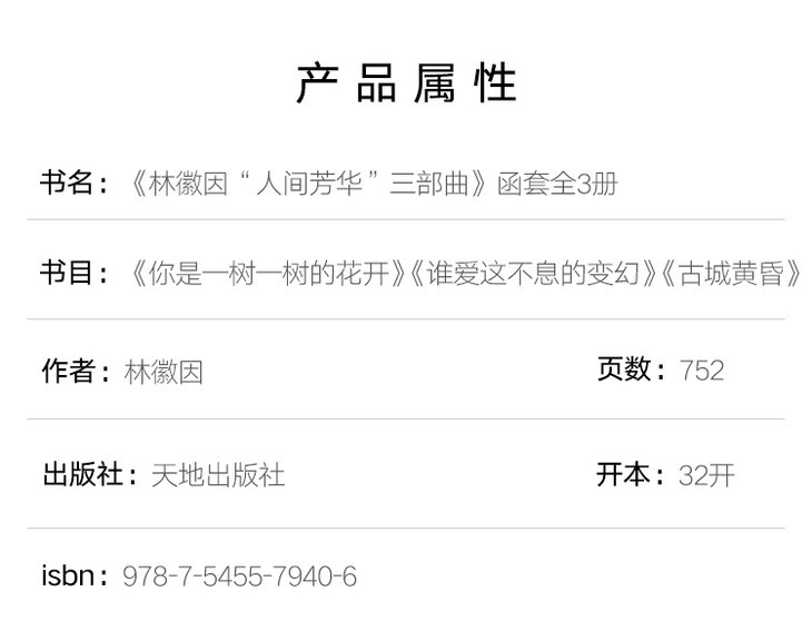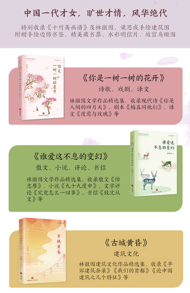 全书共有《你是一树一树的花开》《谁爱这不息的变幻》《古城黄昏》三册,囊括了林徽因一生中绝大部分经典,包含诗歌、戏剧、译文、散文、小说、评论、书信、建筑文化等。
