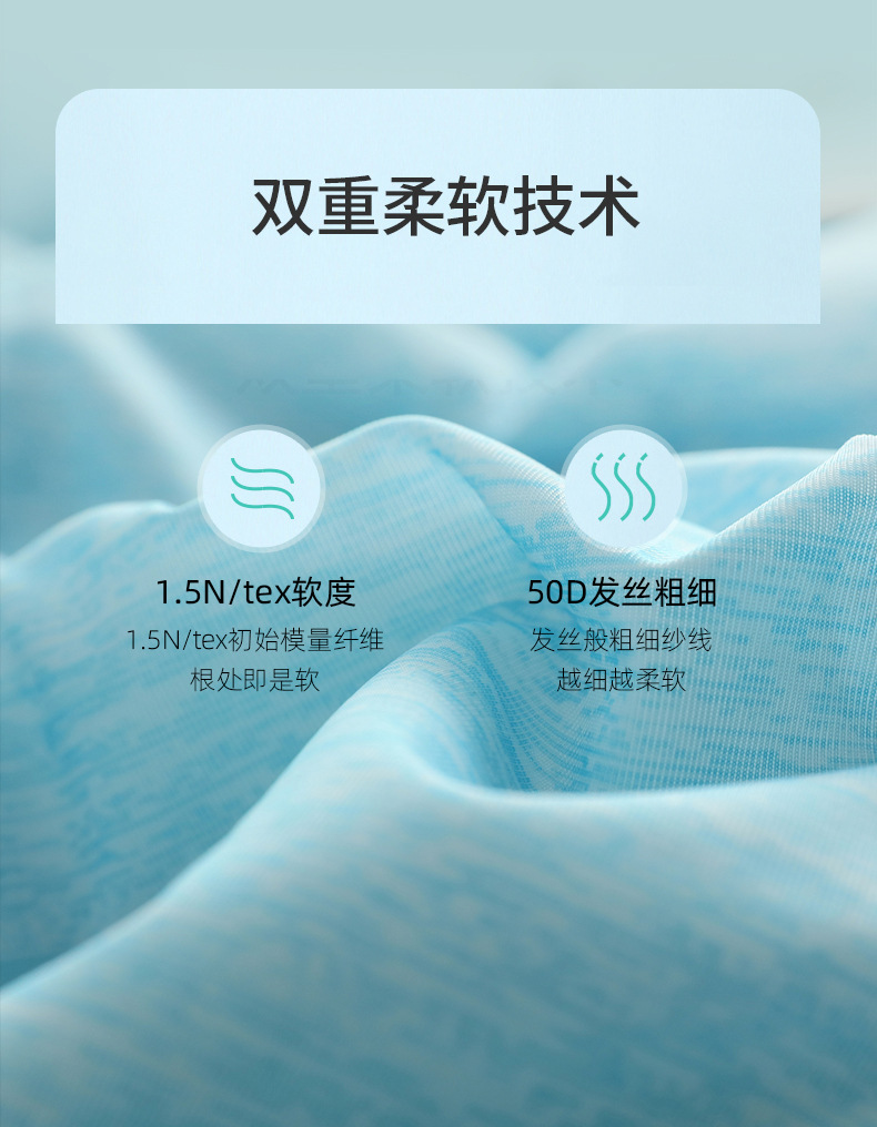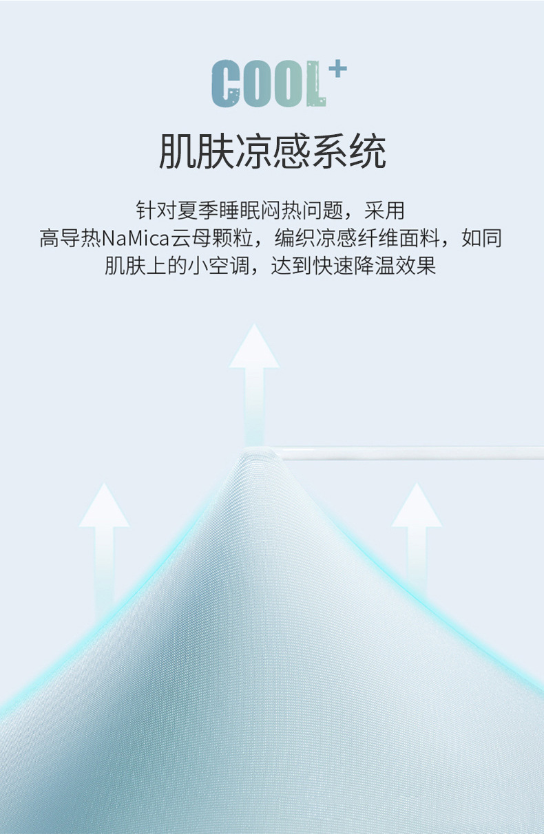 通体采用【凉感纤维100%】,研发团队在纱线里添加了纳米云母,云母矿物具有降温快的特点,使得面料与肌肤接触时,瞬间凉爽