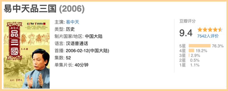 他在央视讲三国,至今都是无人超越的经典,评分苛刻的豆瓣都给出9.4的高分。