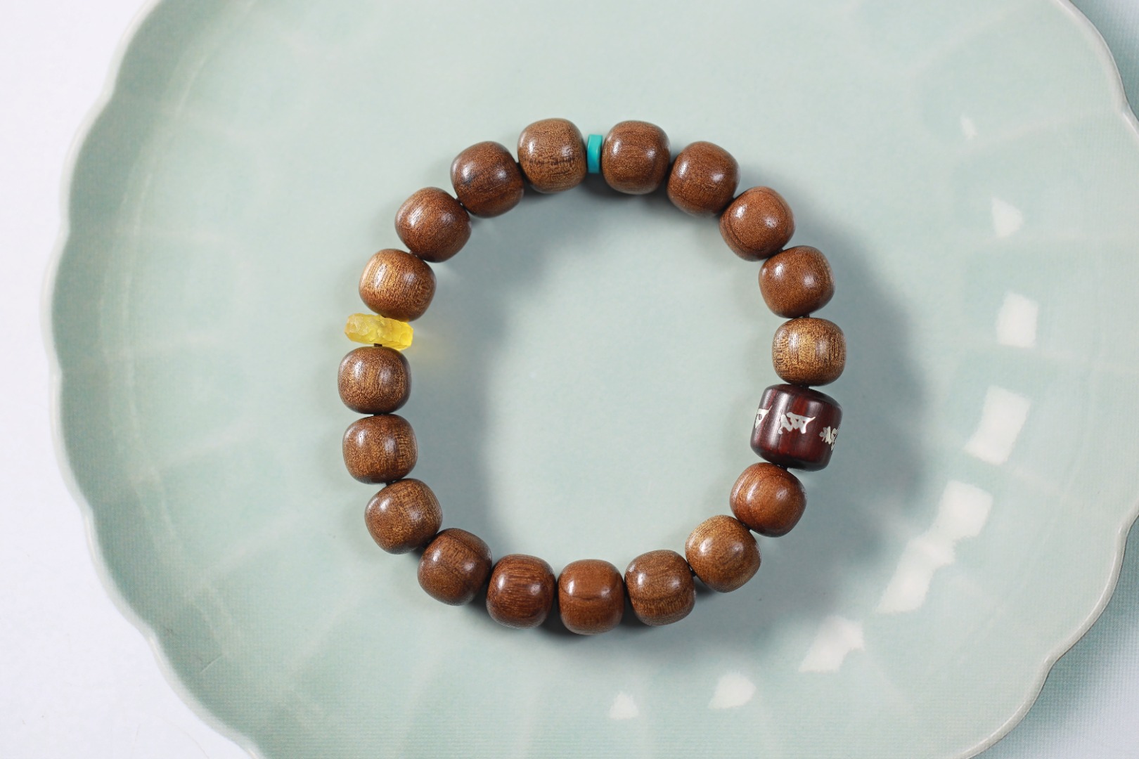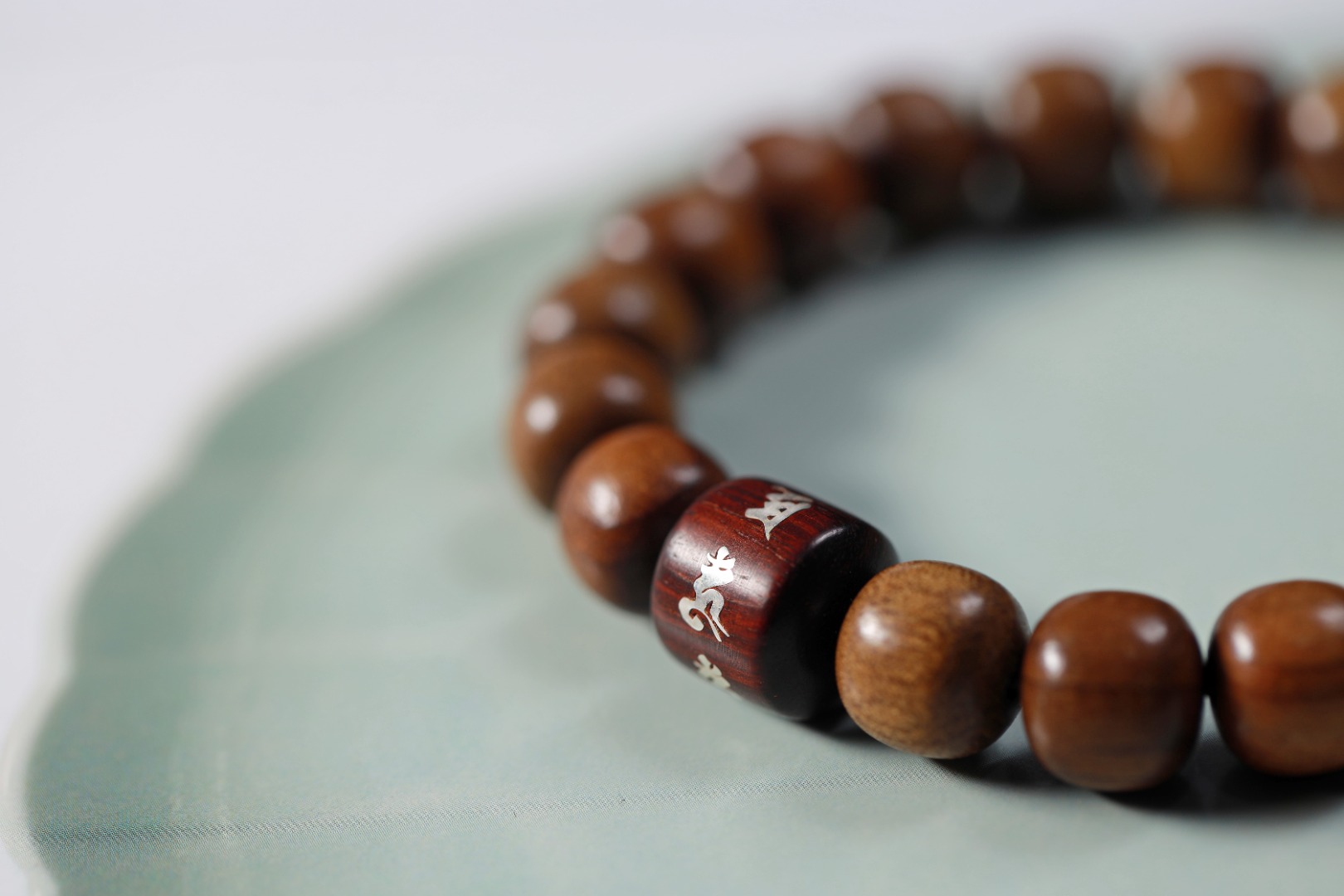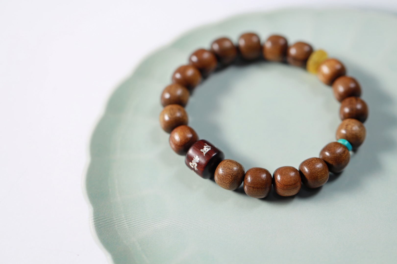 紫檀镶银六字箴言/蜜蜡挖隔片/绿松隔片