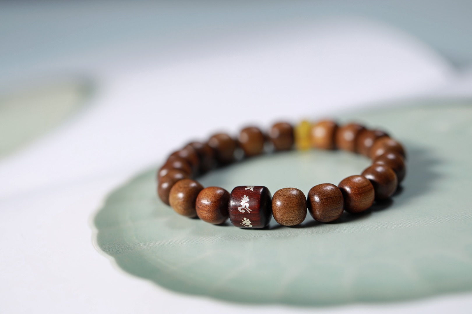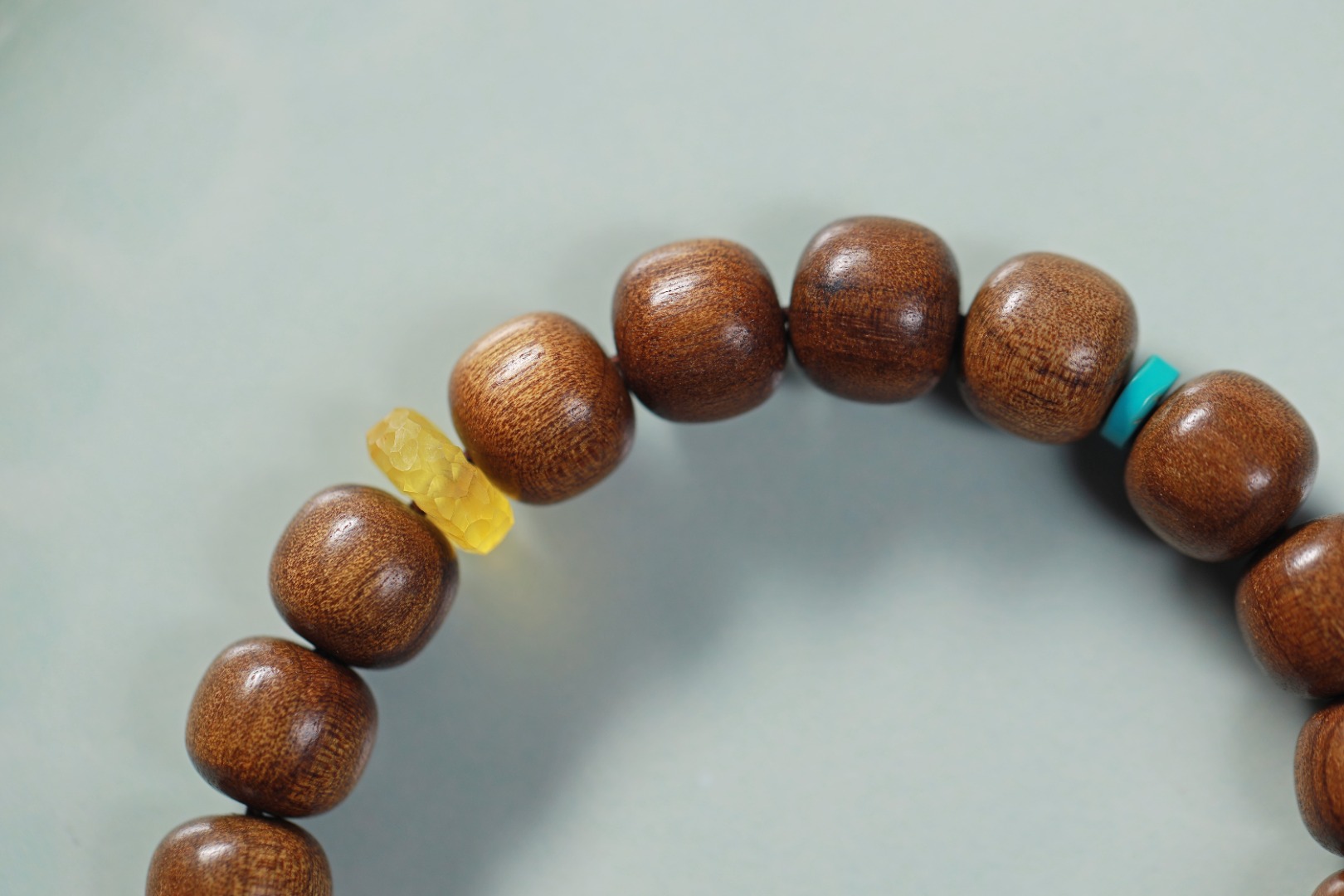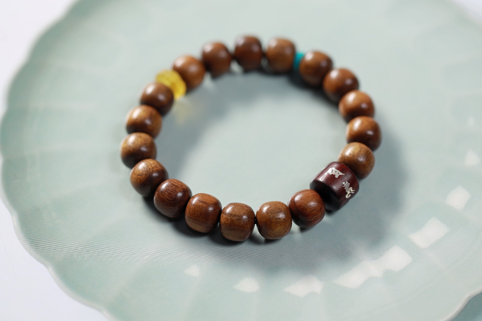 紫檀镶银六字箴言/蜜蜡挖隔片/绿松隔片