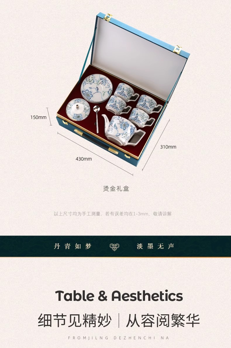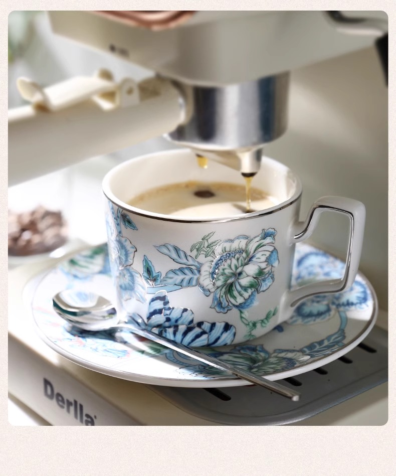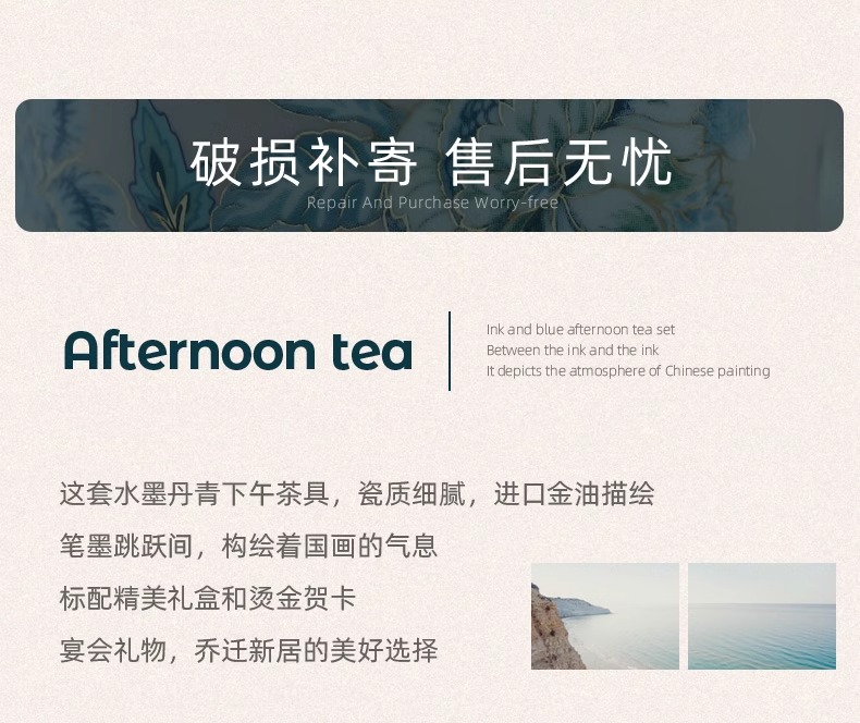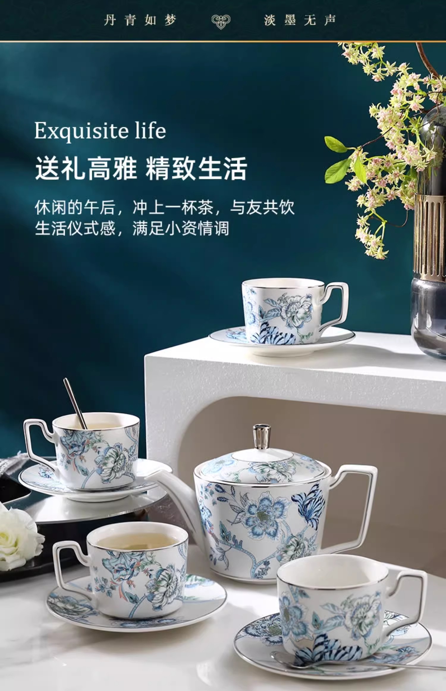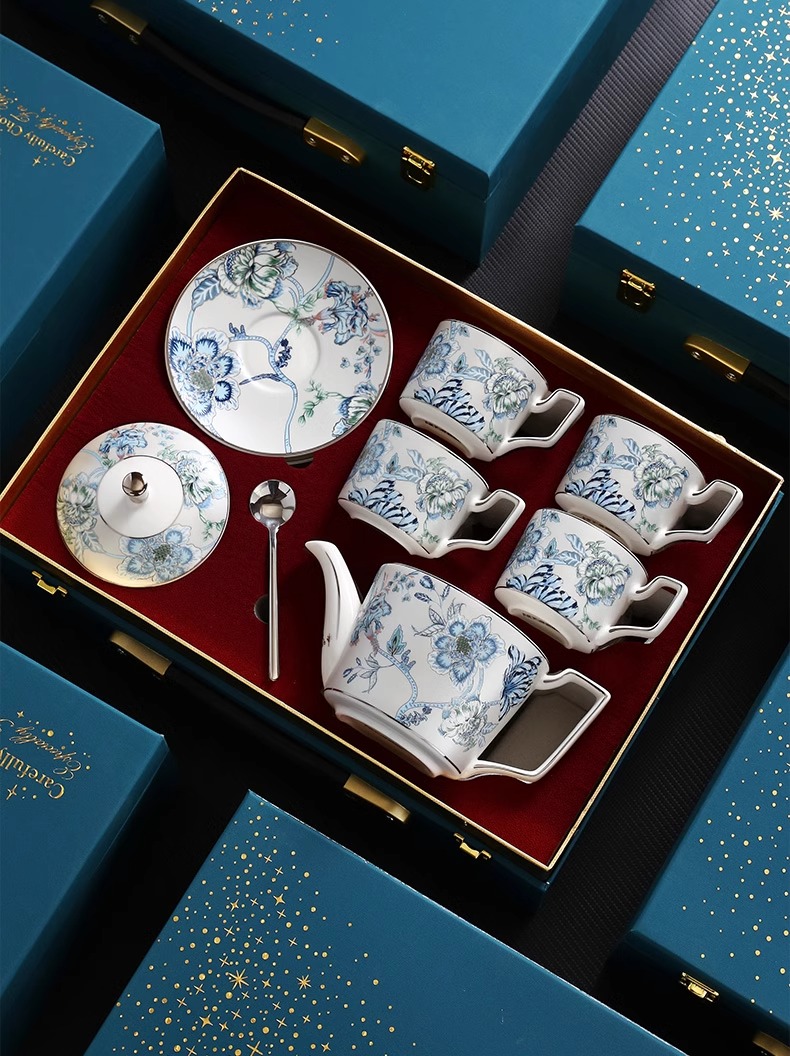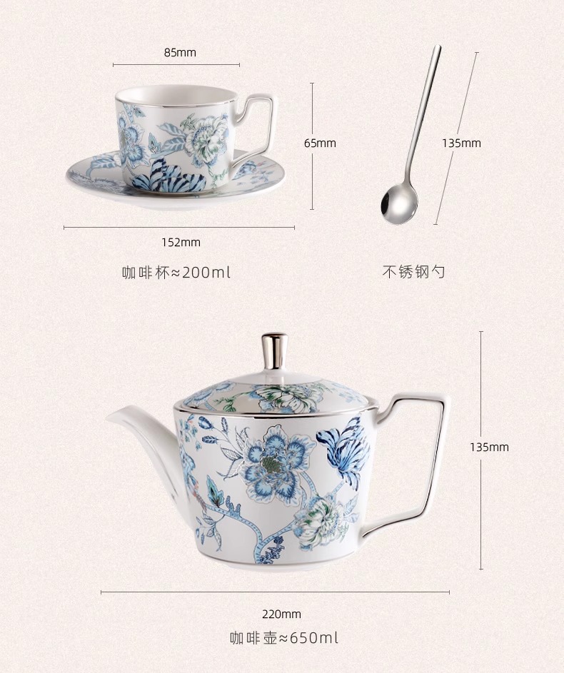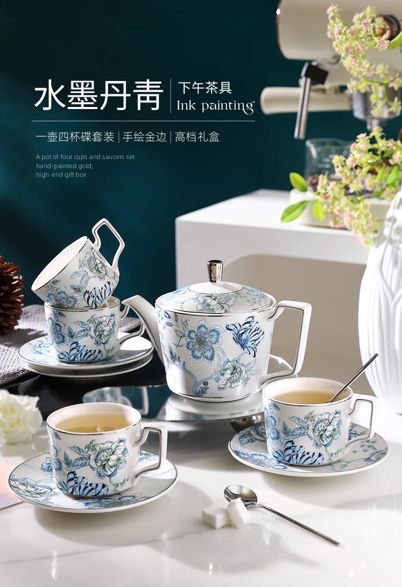 创意家用中式水墨青花下午茶陶瓷茶具套装轻奢整套咖啡具咖啡杯碟诺轩水墨丹青套装4杯碟勺1壶(铂金灰)