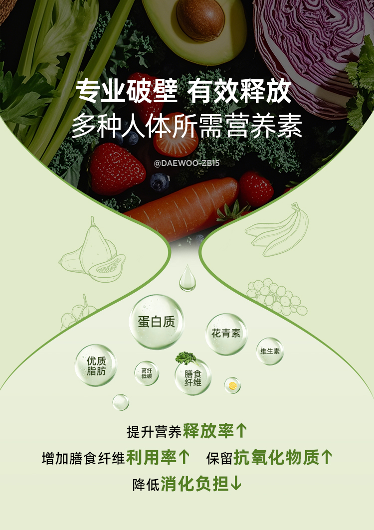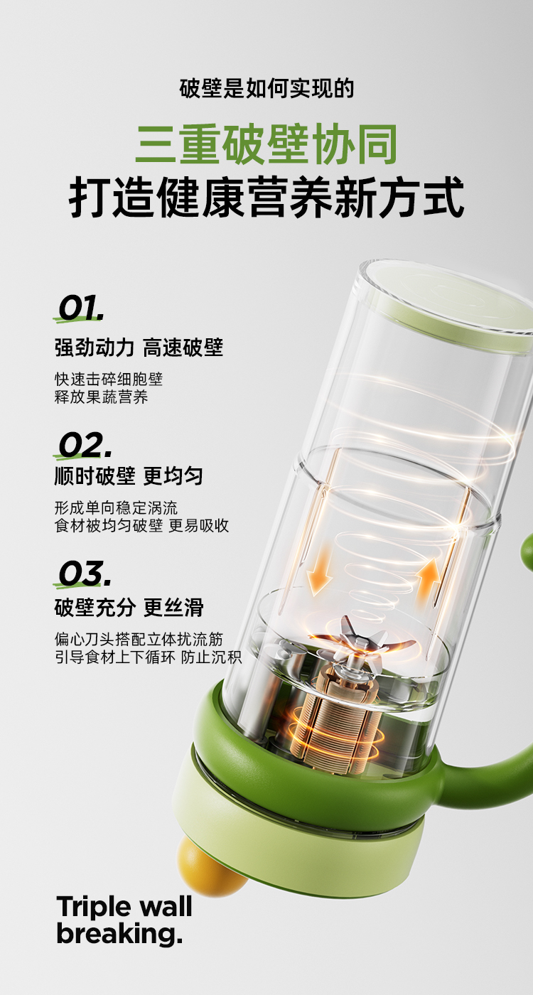 1、【三重破壁】:20000r/min转速强动力+10叶不锈钢刀+立体扰流筋设计,击碎植物坚果细胞壁,释放易吸收营养