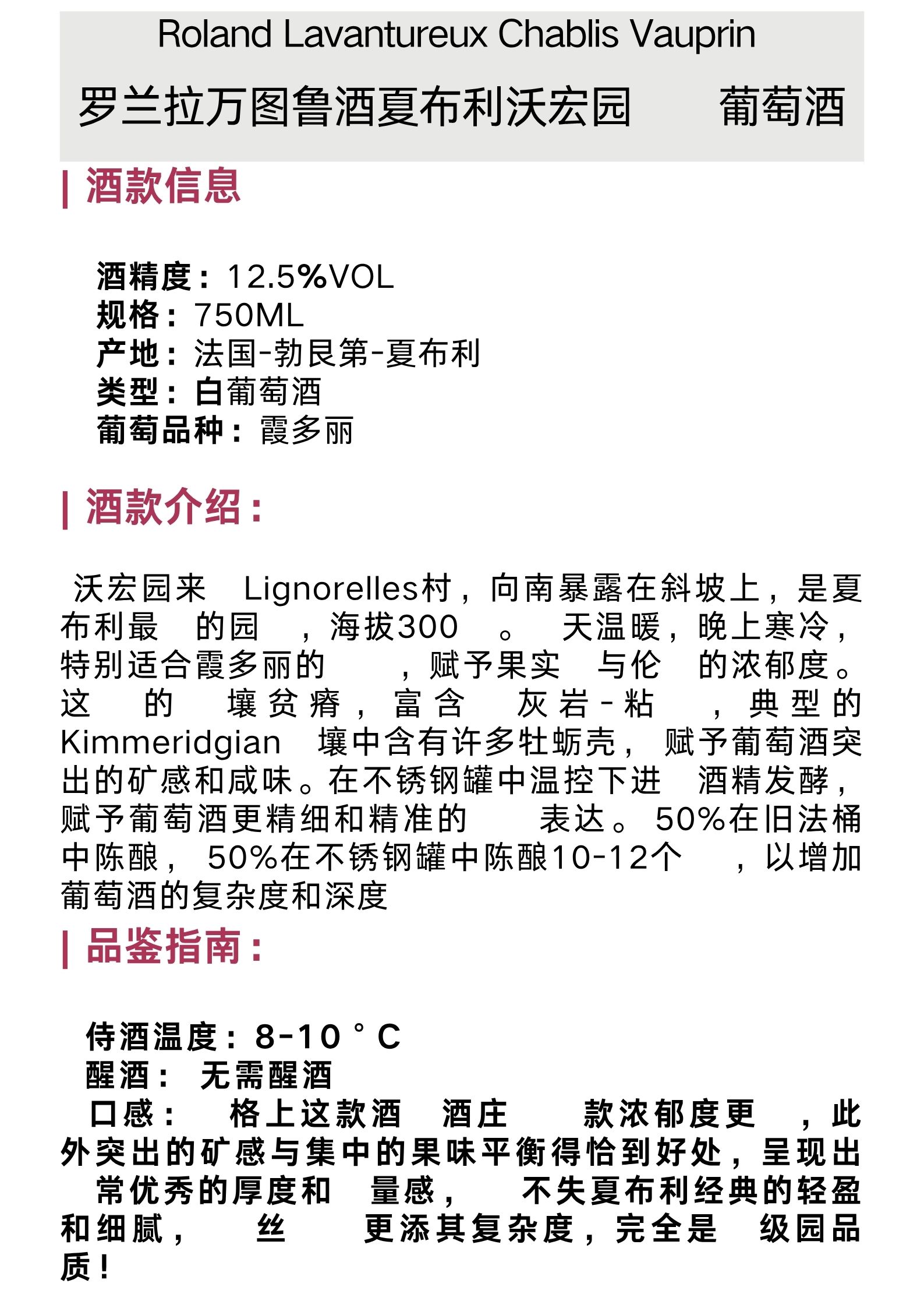 罗兰拉万图鲁酒庄夏布利沃宏园干白葡萄酒 Roland Lavantureux Chablis Blanc Vauprin