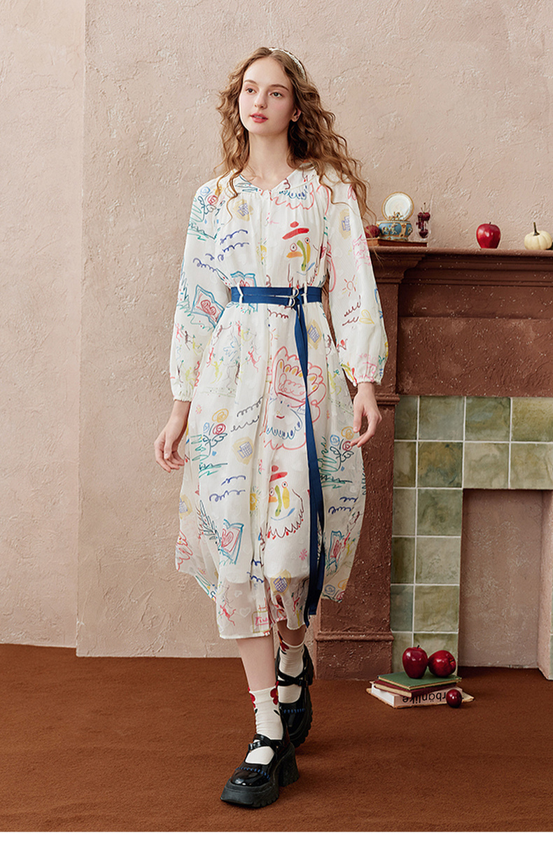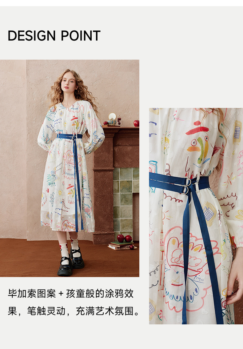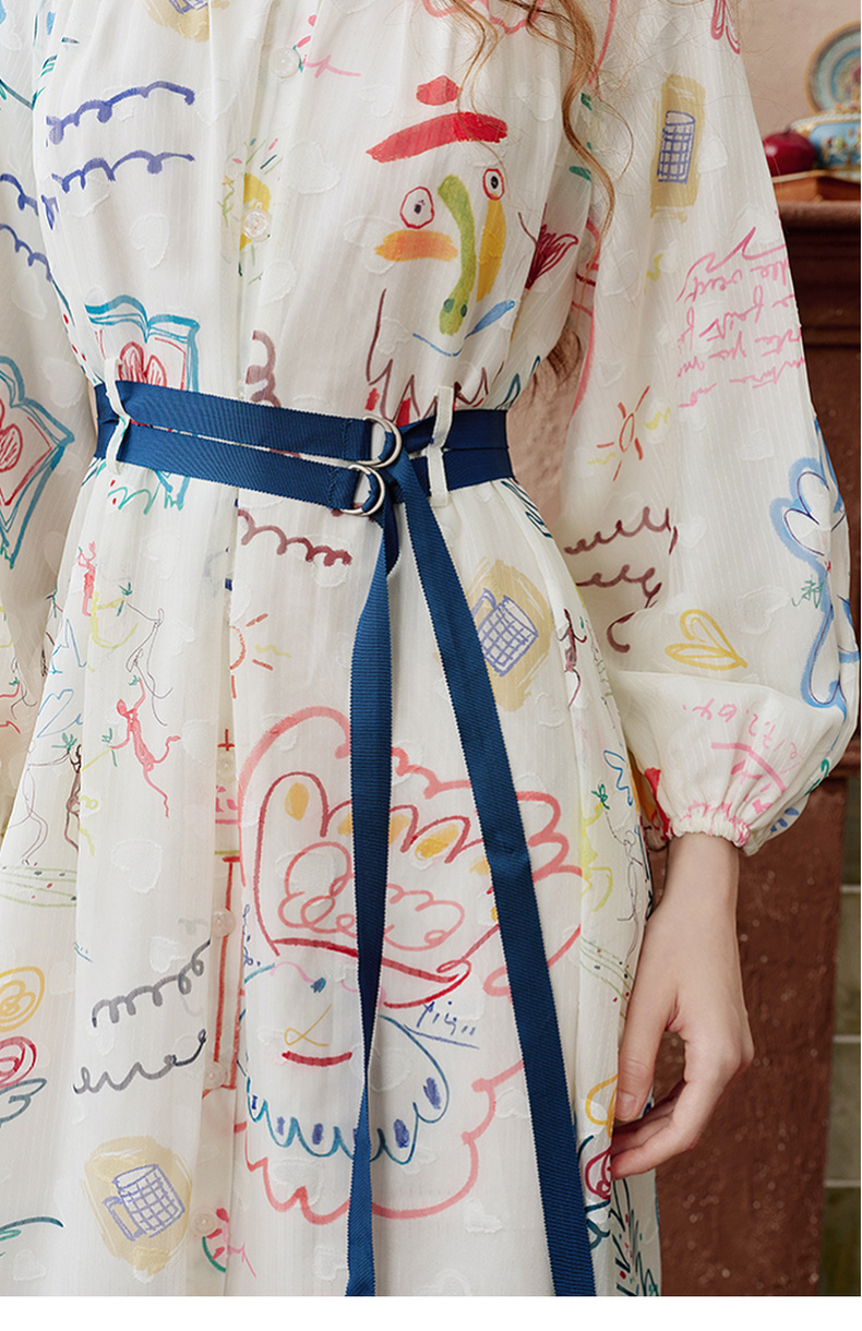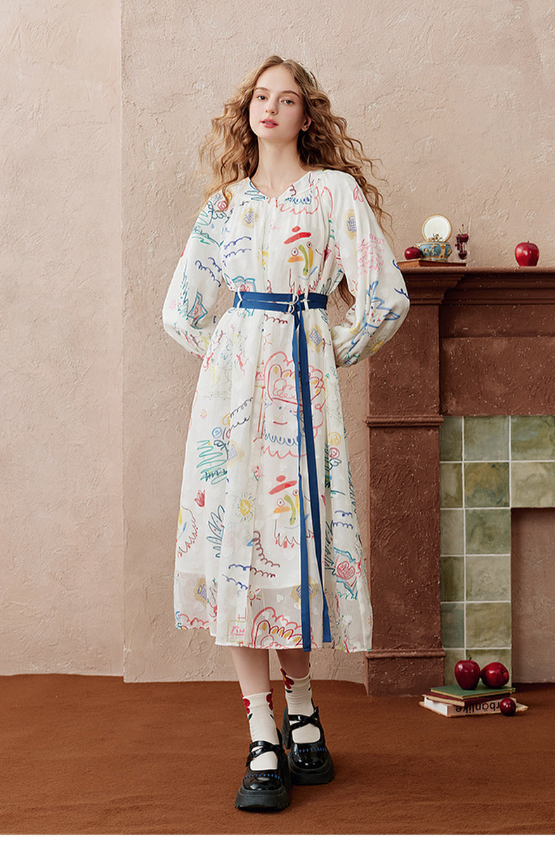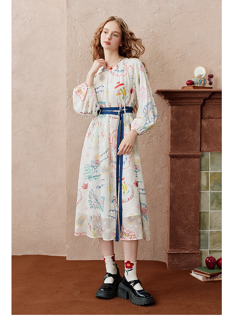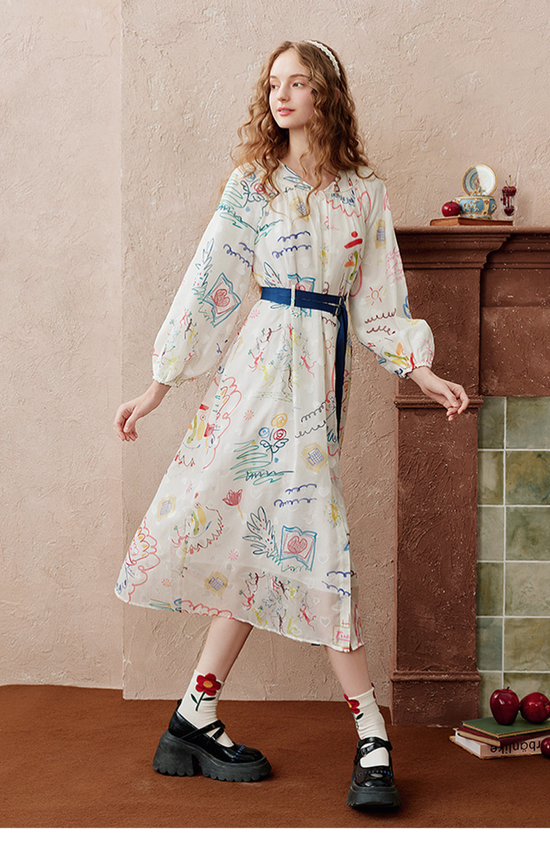 两三事 硬糖次元 2025秋季新款法式涂鸦印花系带泡泡袖连衣裙