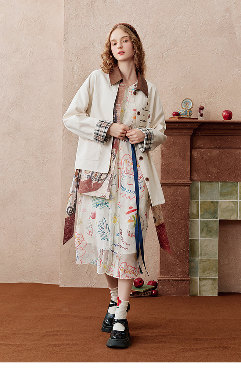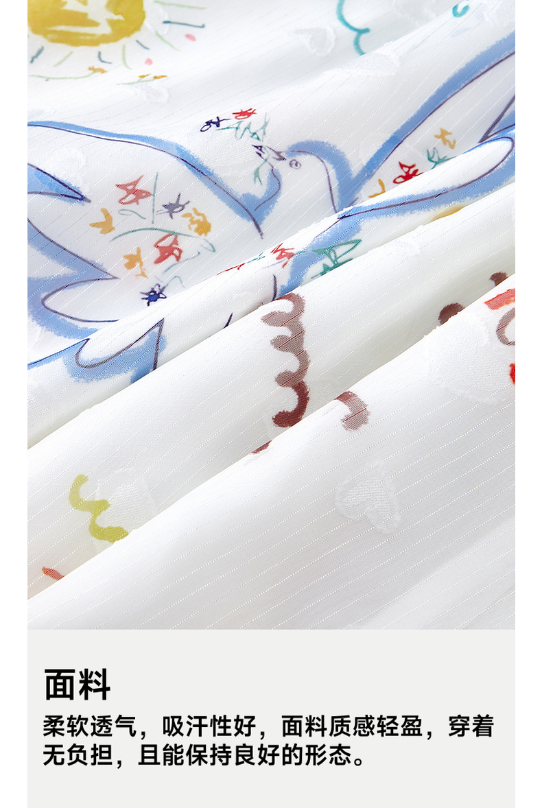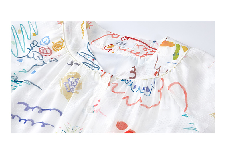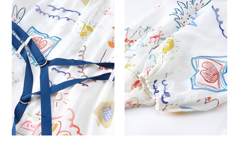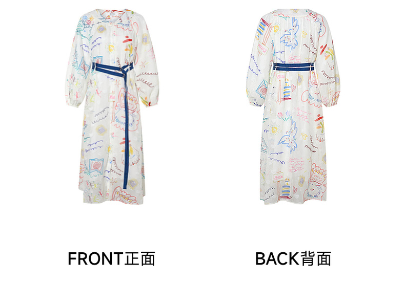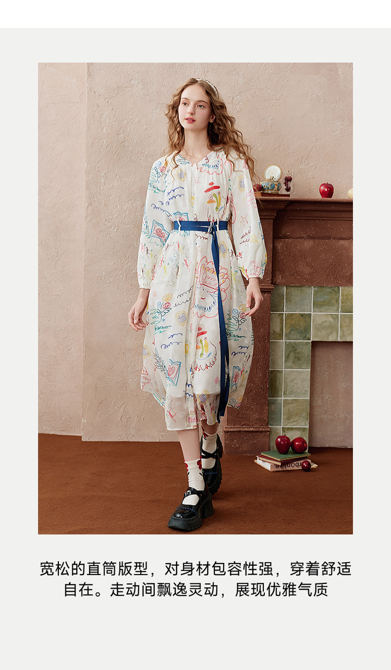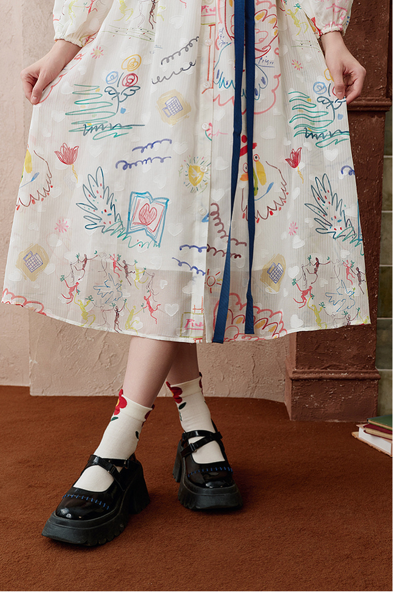 两三事 硬糖次元 2025秋季新款法式涂鸦印花系带泡泡袖连衣裙