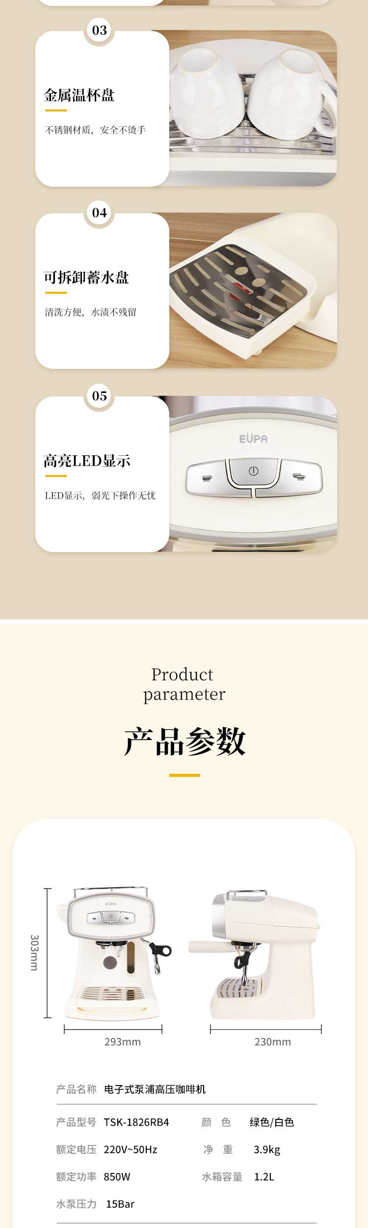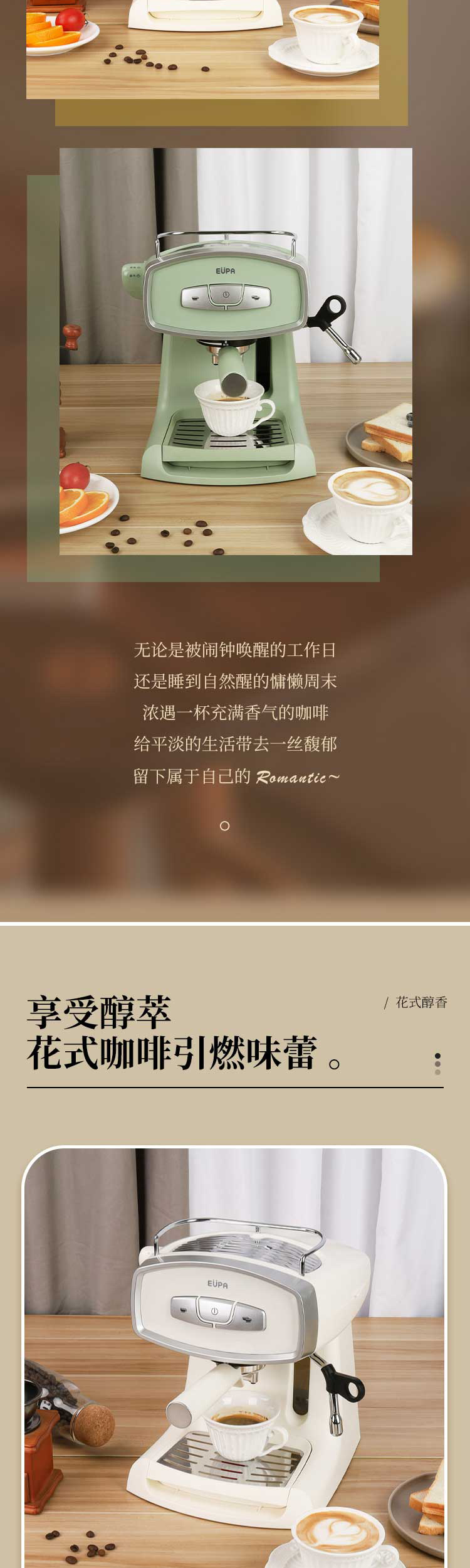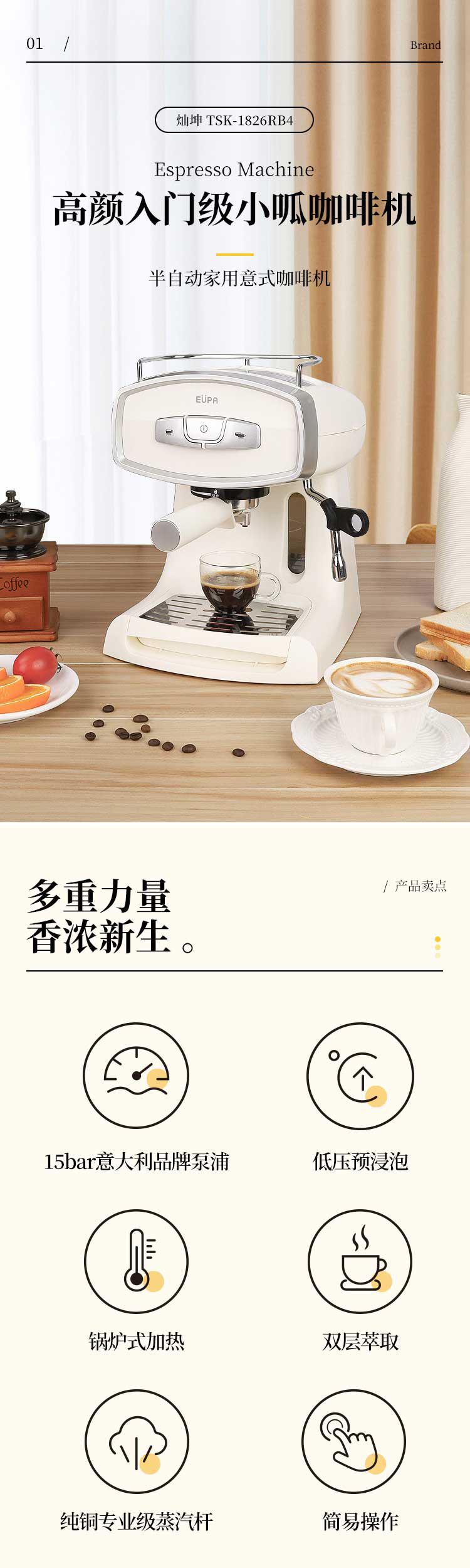 灿坤 咖啡机TSK-1826RB4(米白)泵浦式高压咖啡机半自动意式浓缩小呱机EUPA