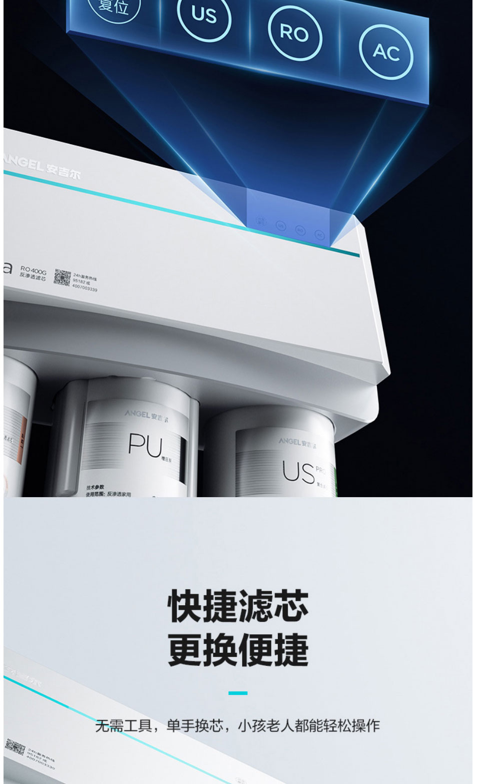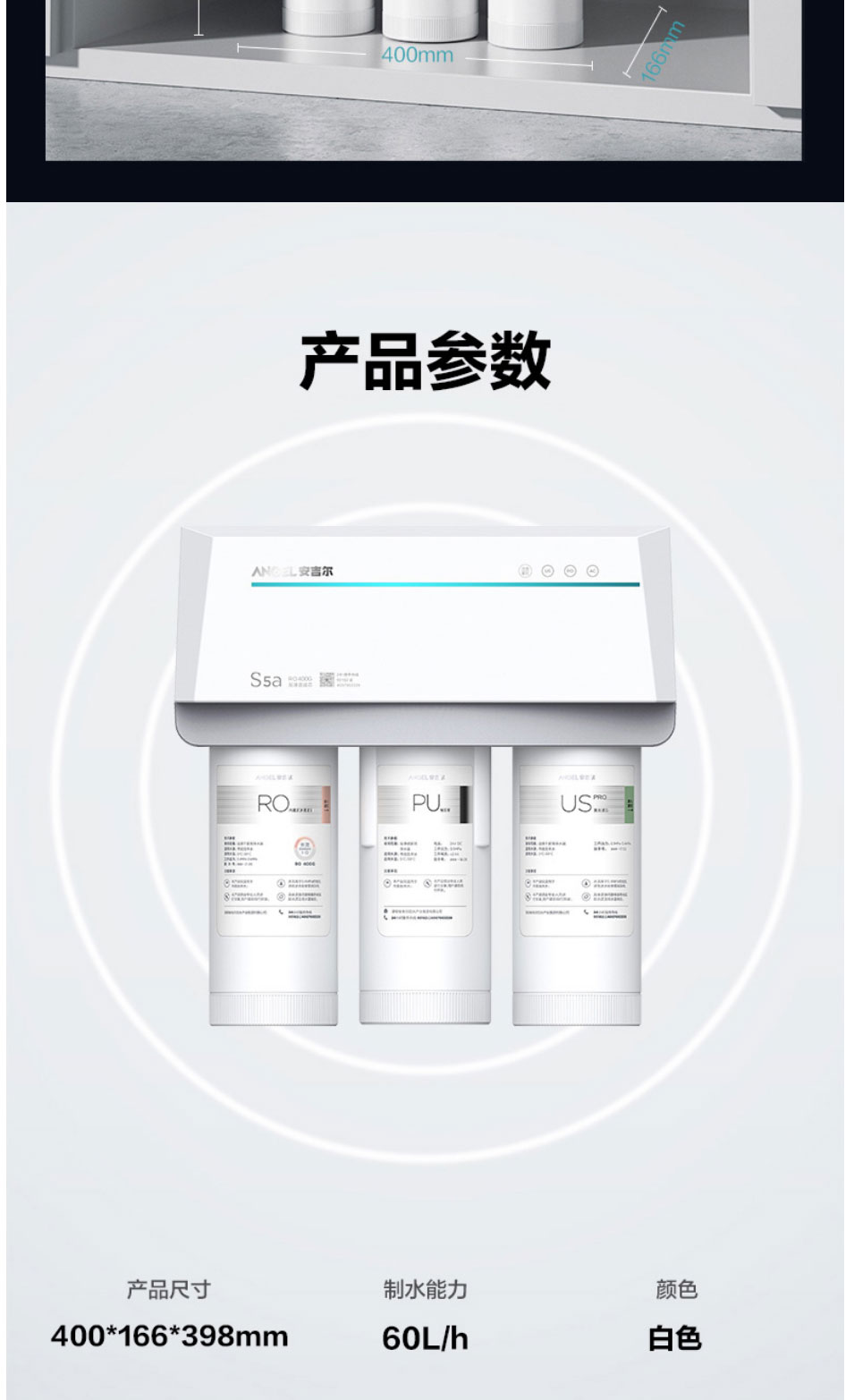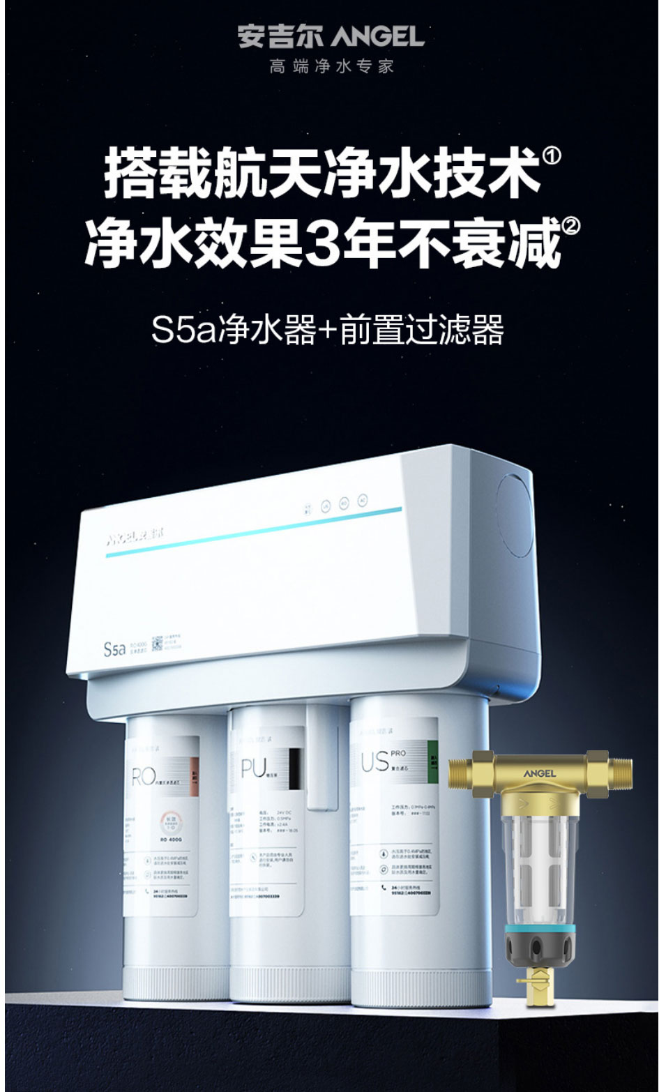 安吉尔(Angel)净水器家用直饮反渗透厨房净水机S5a无桶400G大通量纯水机J2871-ROB60净水器
