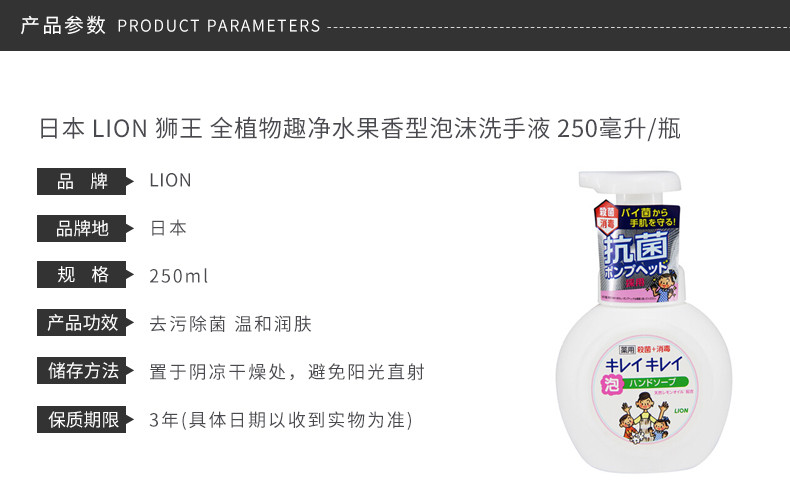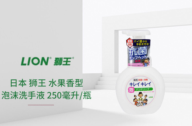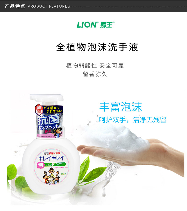 LION狮王 全植物弱酸型除菌洁净泡沫儿童洗手液 250ML 日本
