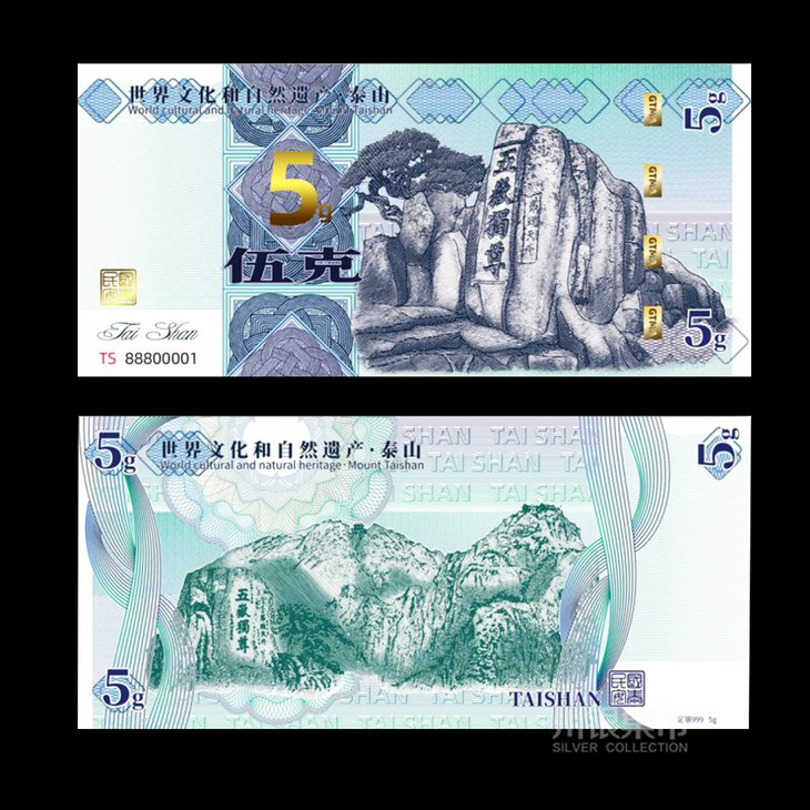 背面图案:为泰山,包括泰山松柏、泰山日出、挑山工、泰山石刻、南天门、十八盘以及玉皇顶等,主景图案下方刊“世界文化和自然遗产—泰山”字样,右侧刊面额“5元”字样。
