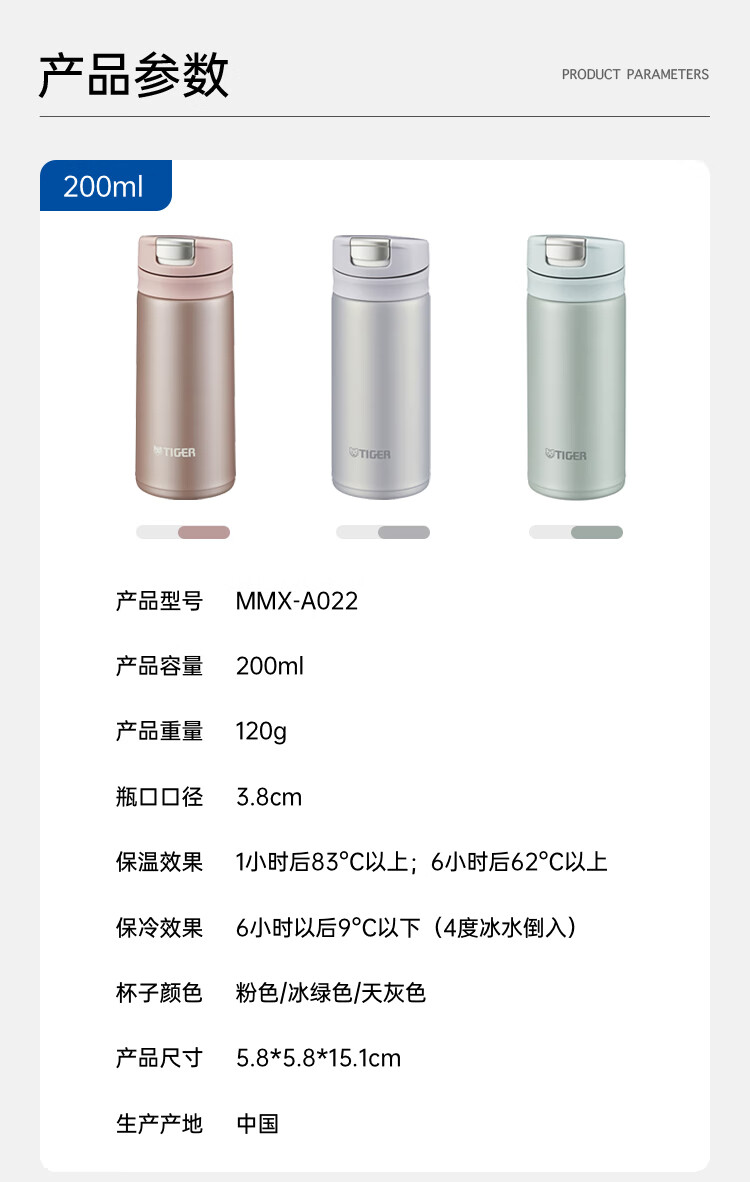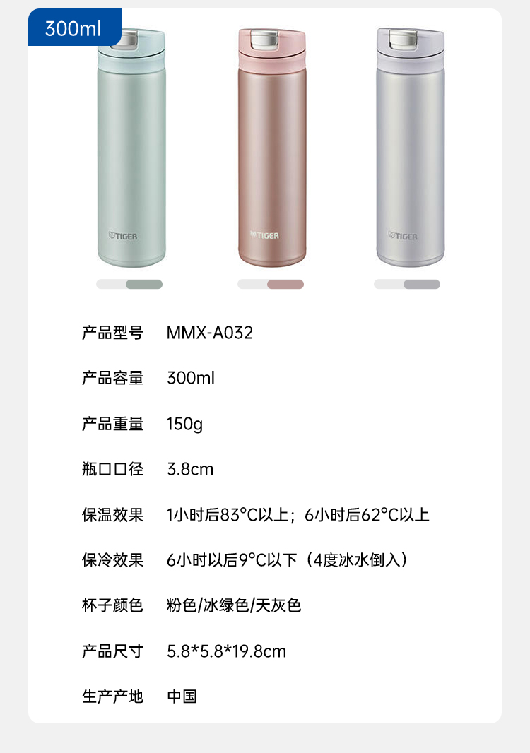 TIGER 虎牌 一键开启式 保温杯 6小时保温保冷 300mL