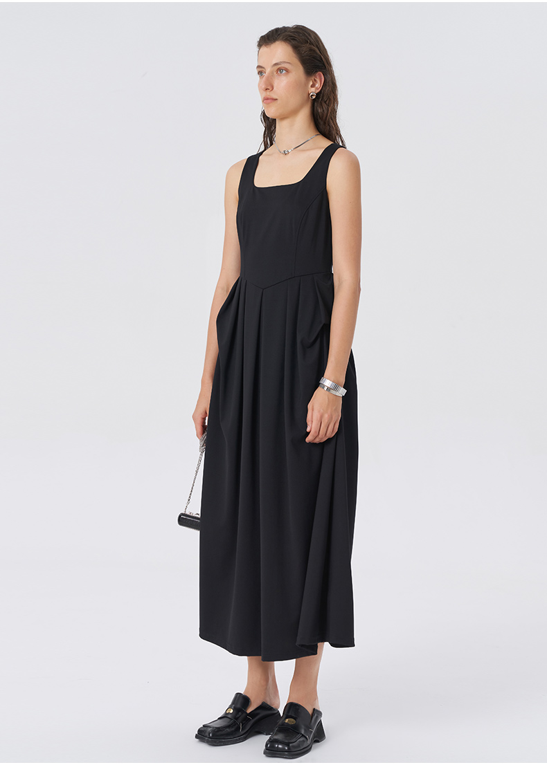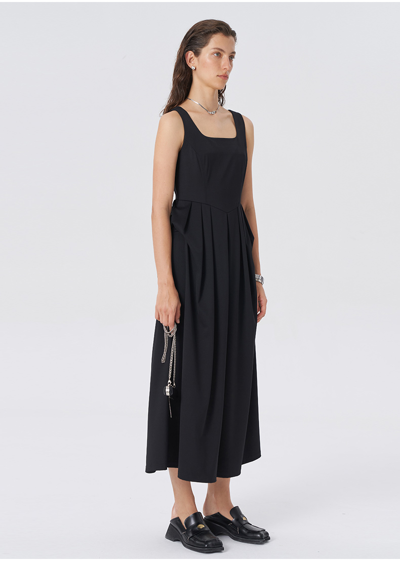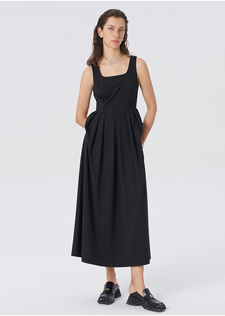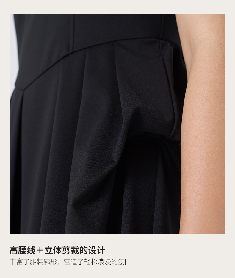 Self Who2023夏季高腰显瘦半身裙气质优雅方领小黑裙百褶连衣裙