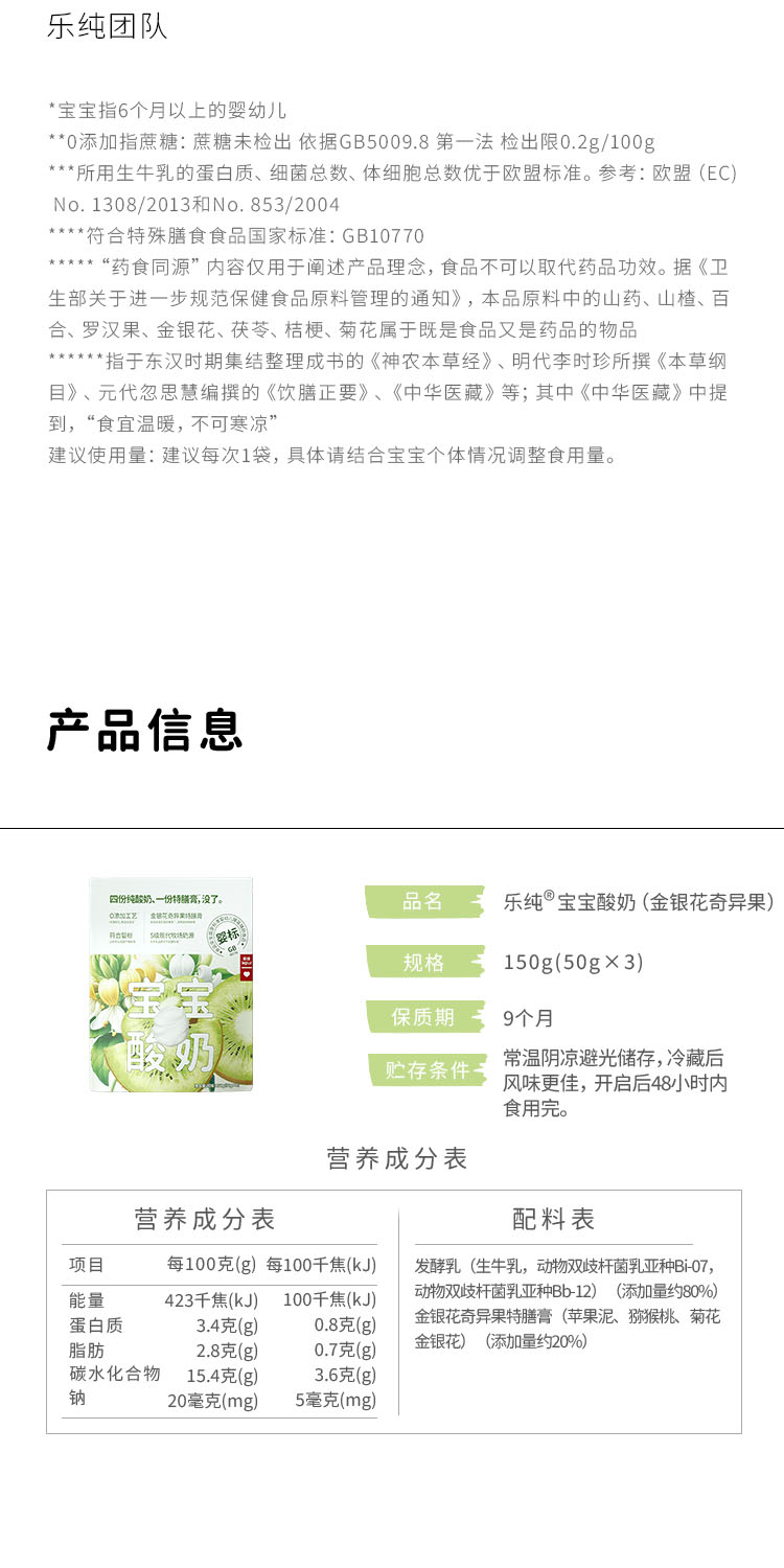 乐纯 宝宝酸奶 金银花奇异果50g*3