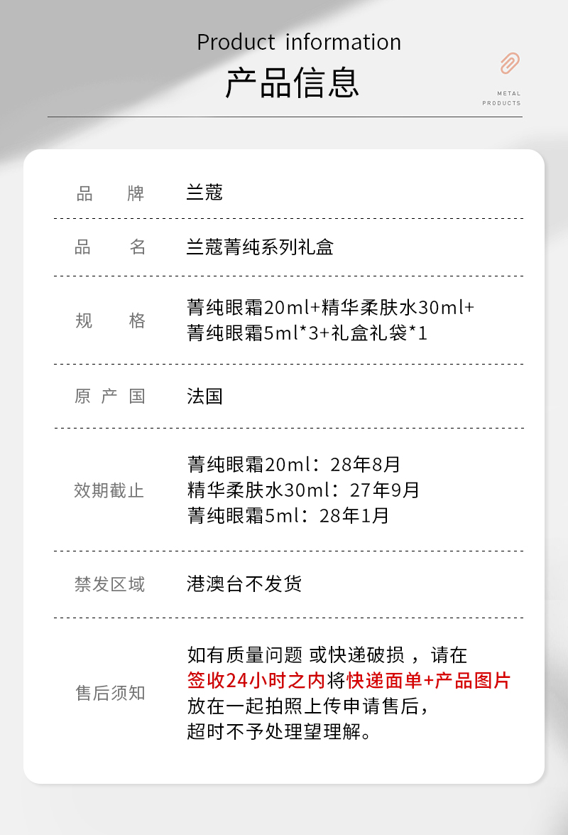 【Lancôme/兰蔻】菁纯系列礼盒(眼霜 20ml + 精华柔肤水 30ml + 菁纯眼霜 5ml*3 )加赠礼盒礼袋