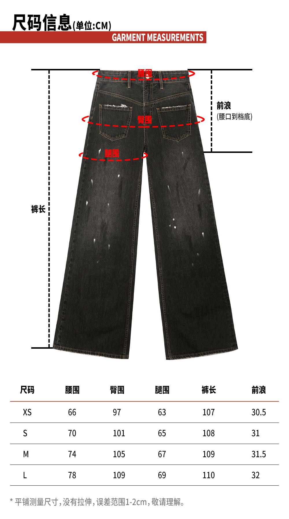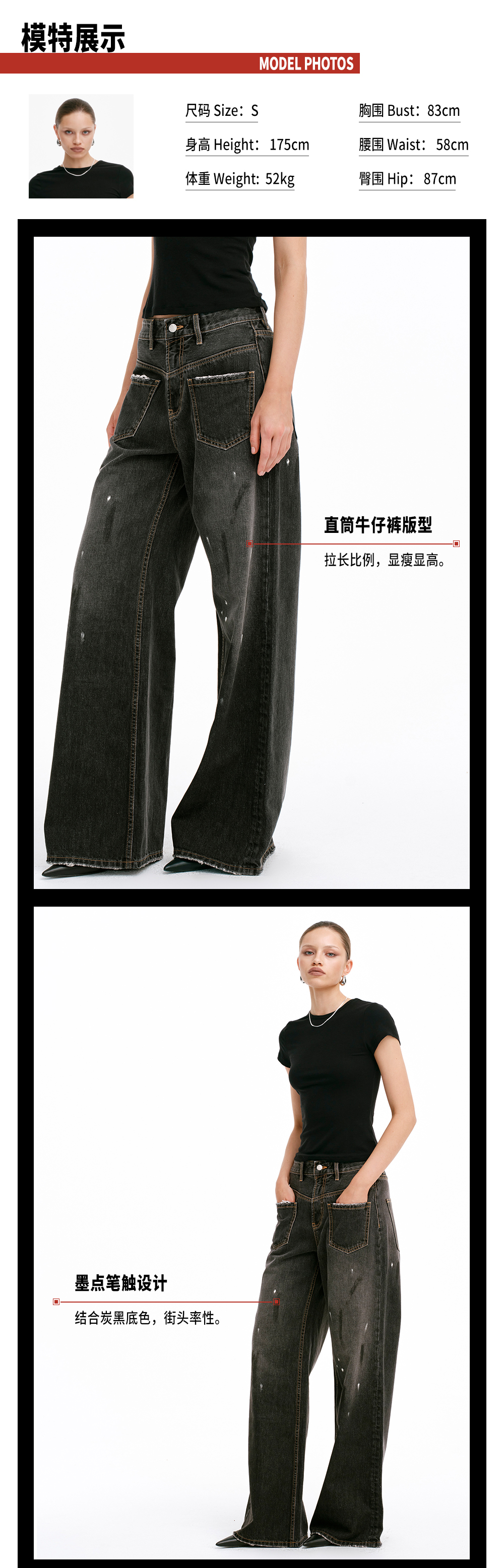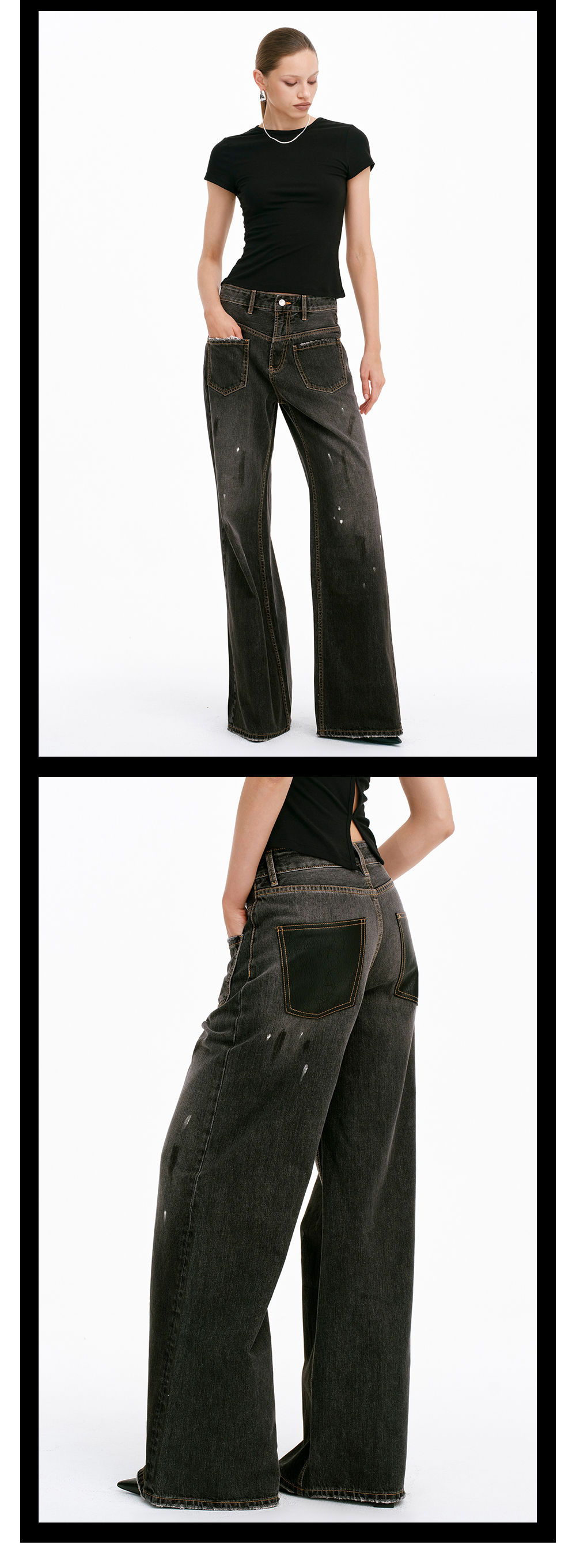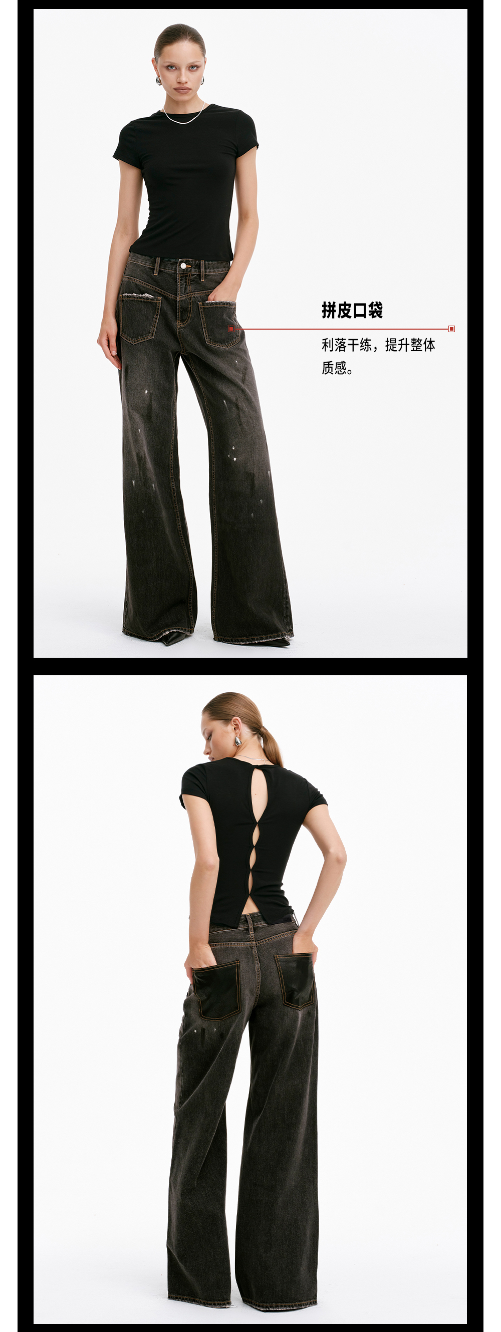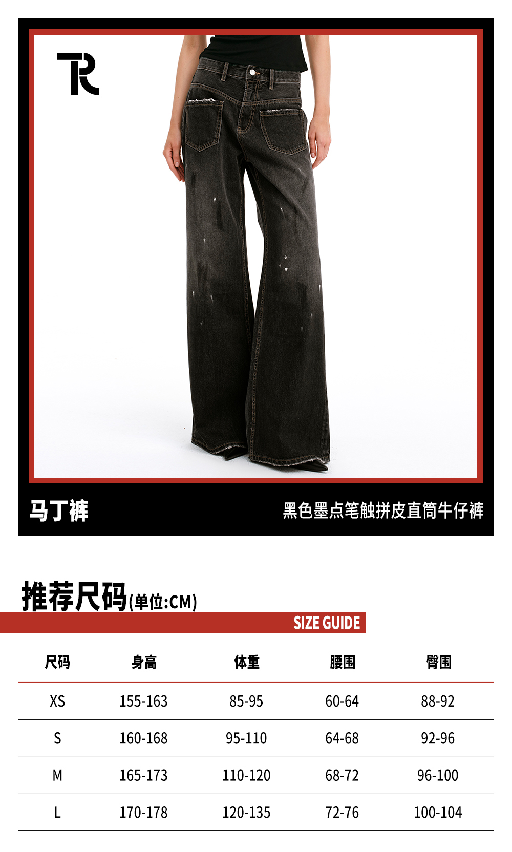 TR她热 马丁裤 黑色泼墨水洗磨白拼皮复古设计感时髦休闲直筒牛仔裤