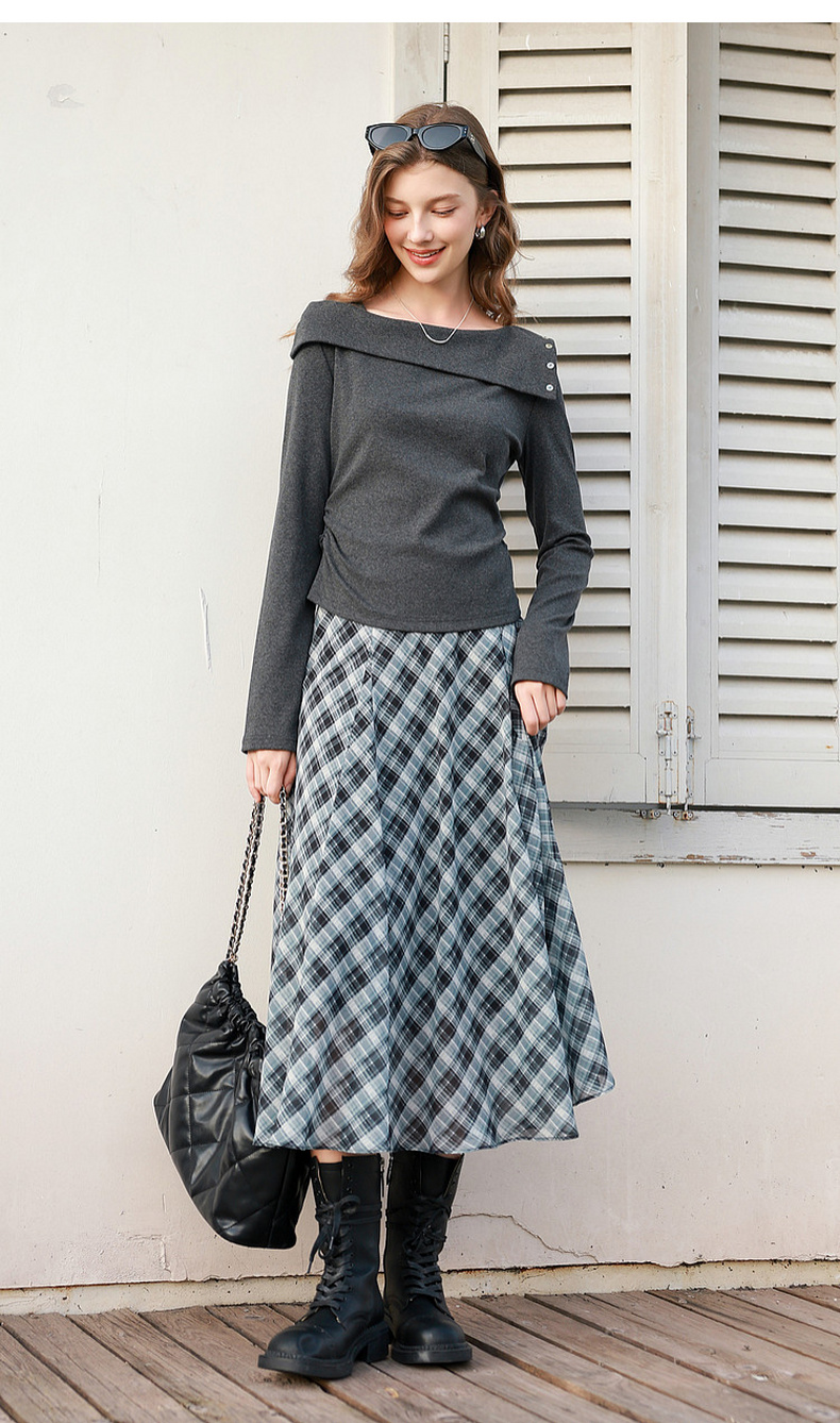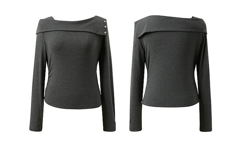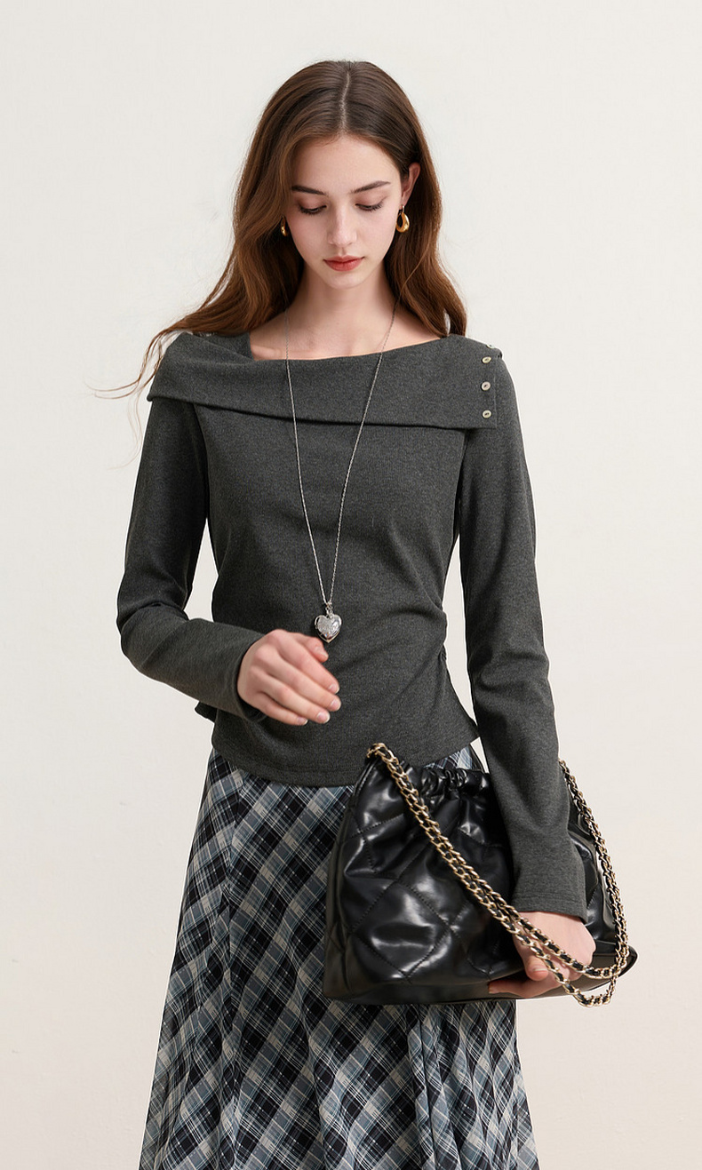 三彩2026春季新款长袖简约T恤套头上衣一字肩修身短款收腰M