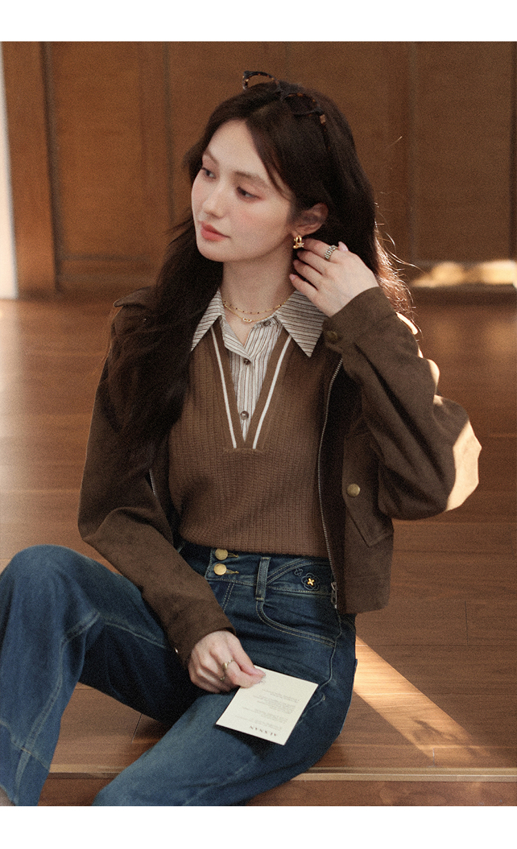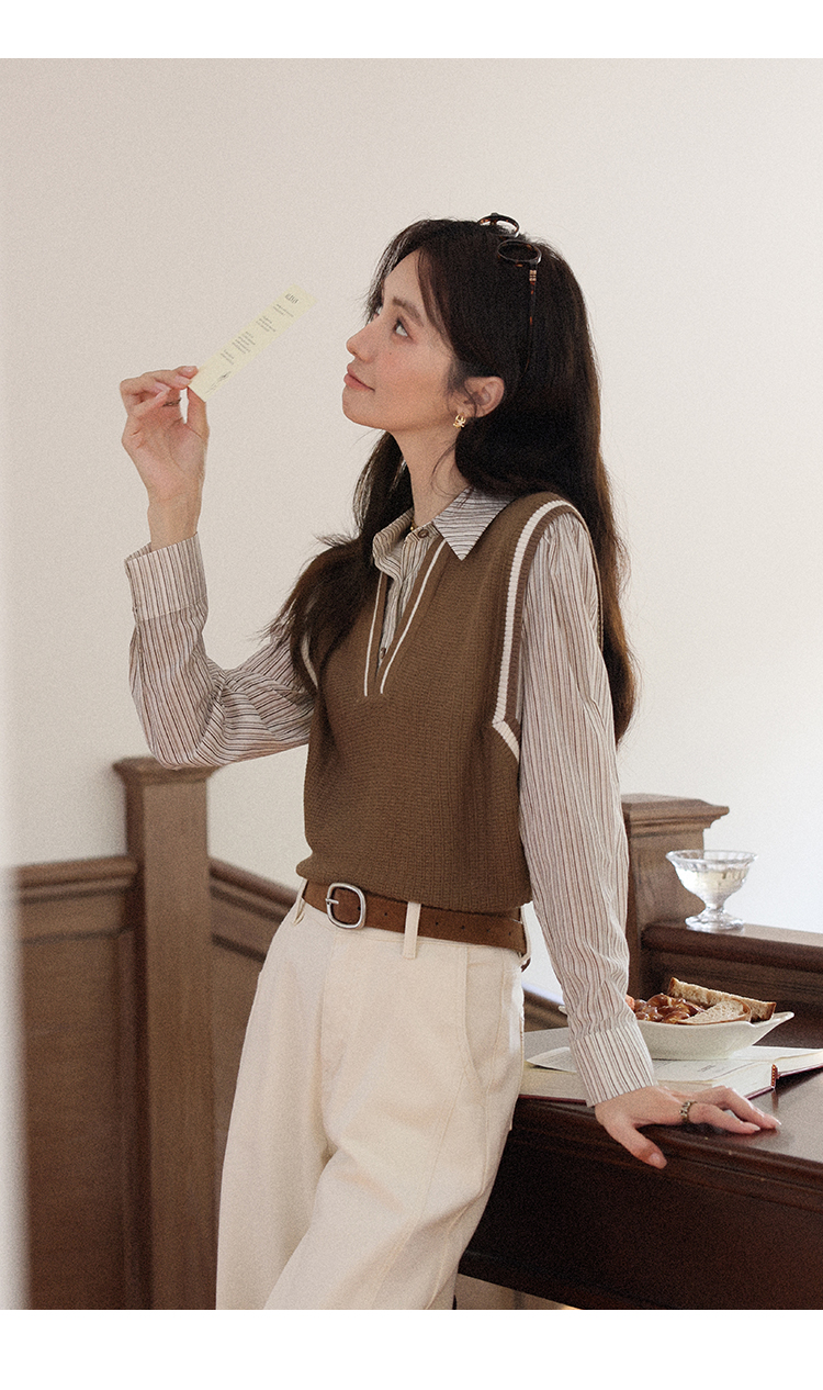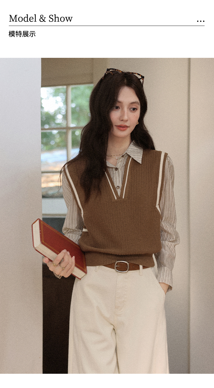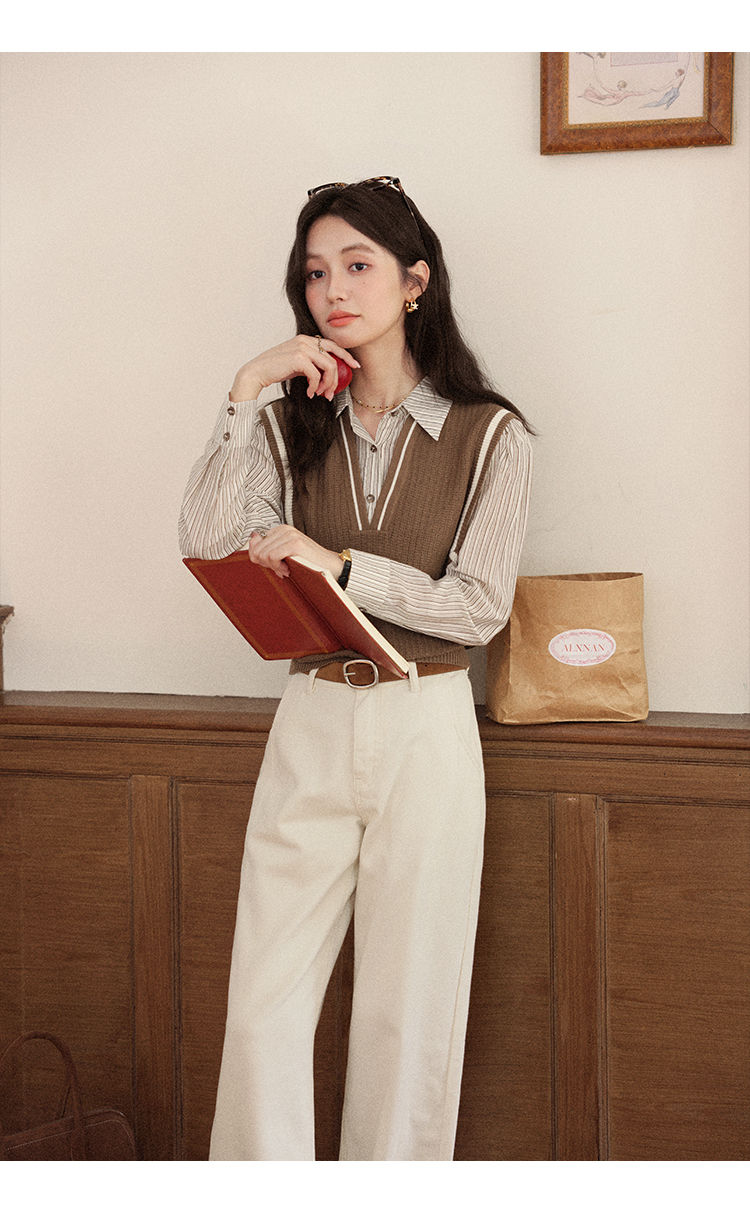 鹿向南「朗姆热可」复古咖色假俩件衬衫女秋季新款设计感长袖上衣