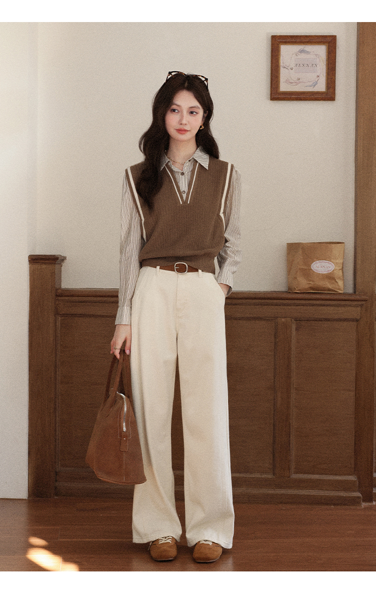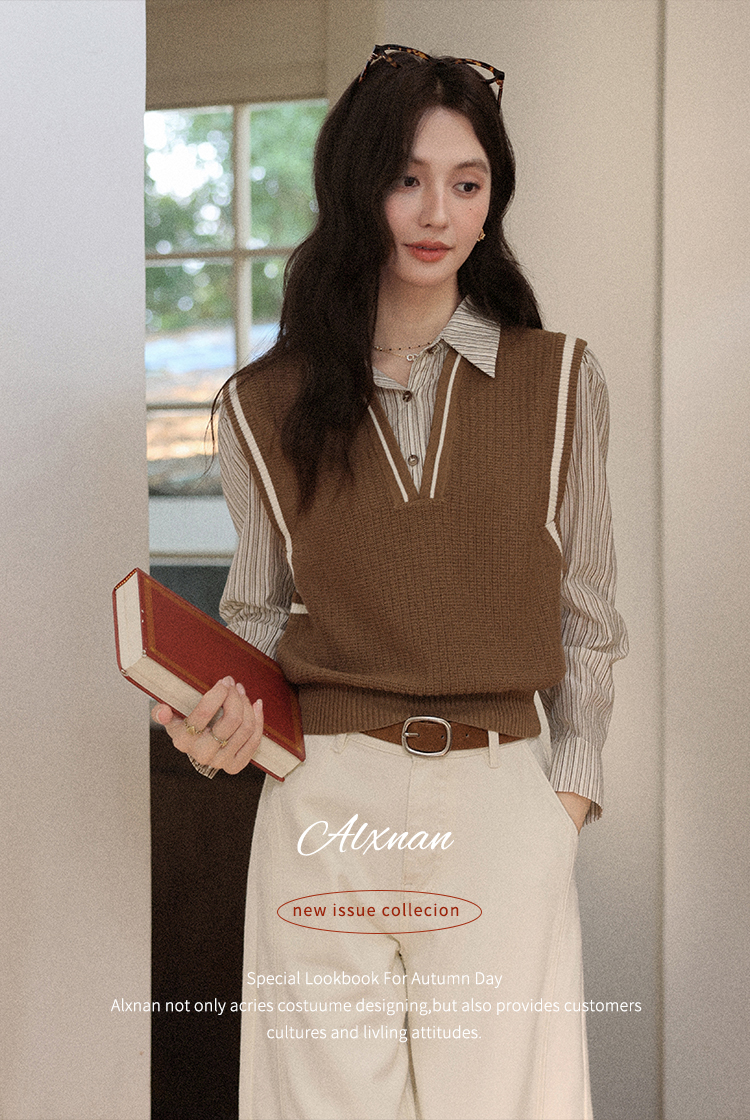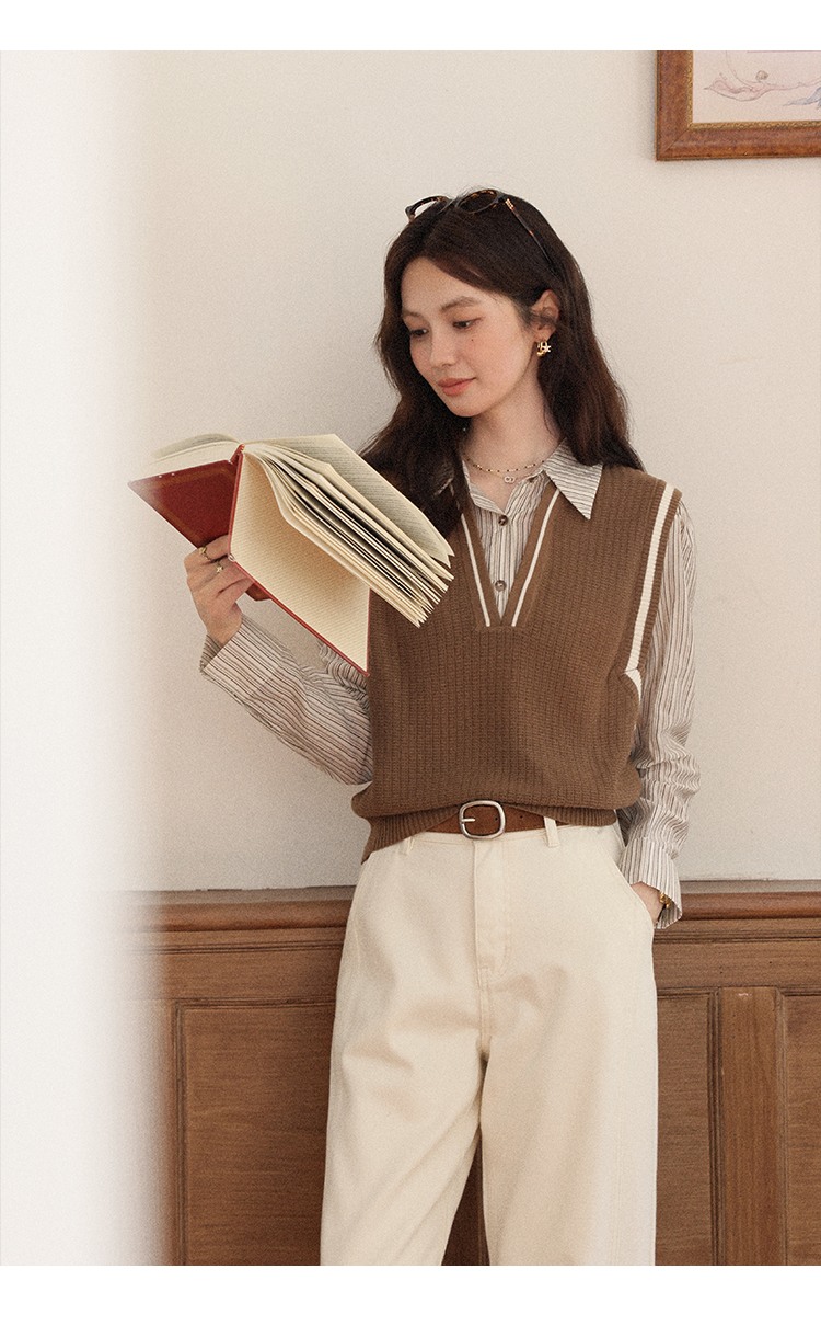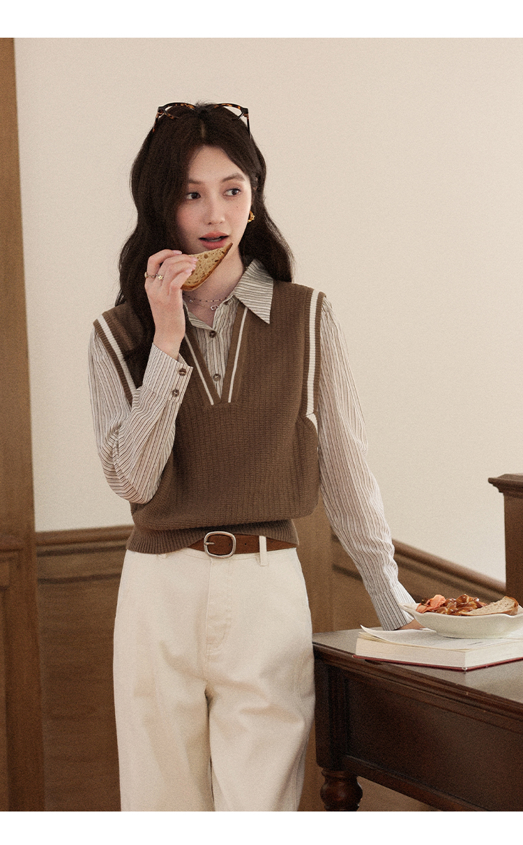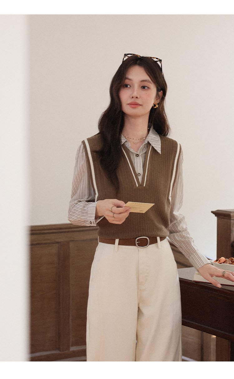 鹿向南「朗姆热可」复古咖色假俩件衬衫女秋季新款设计感长袖上衣
