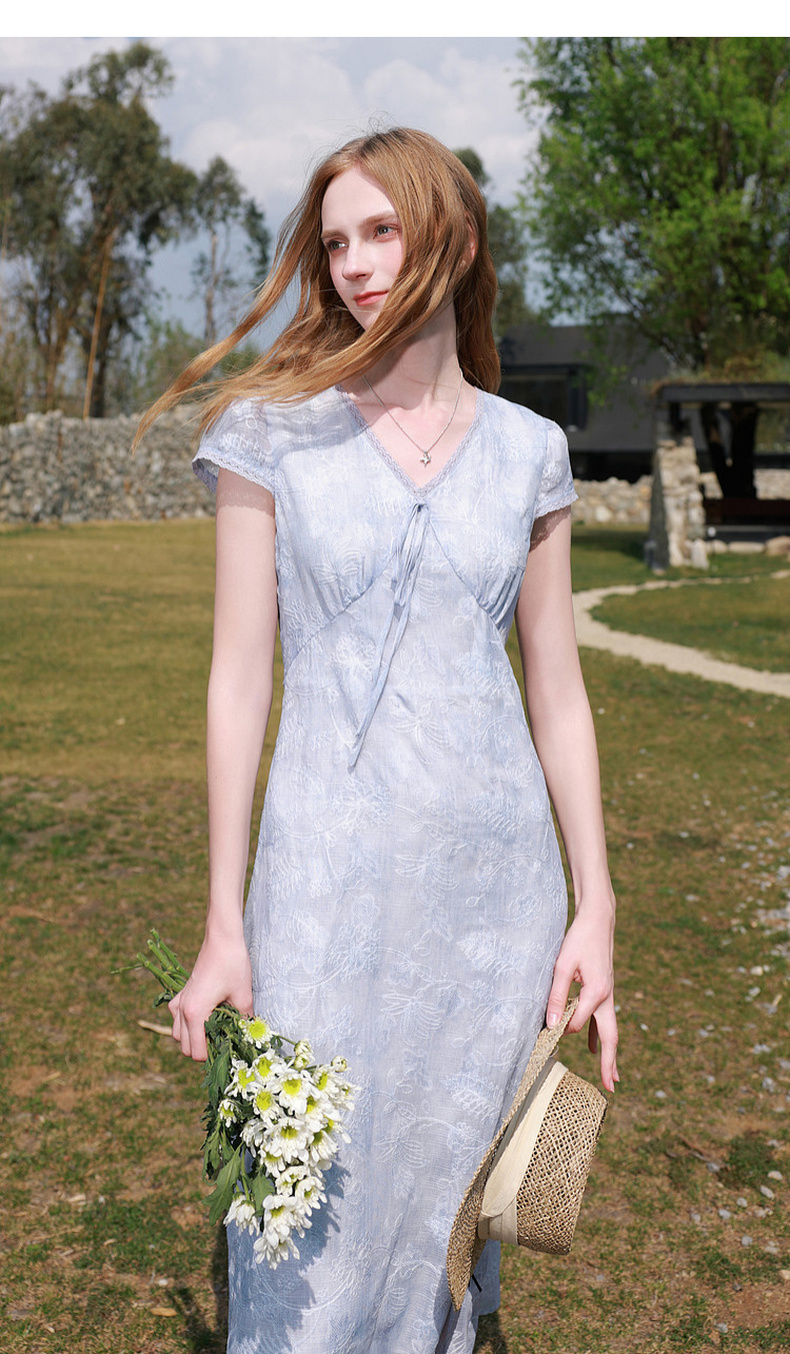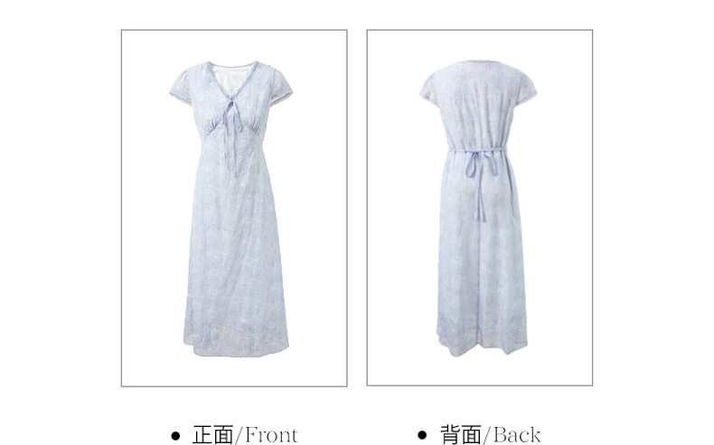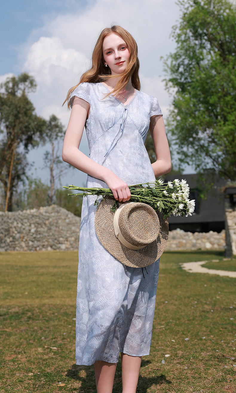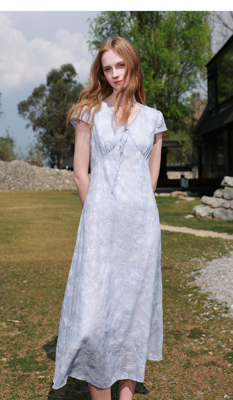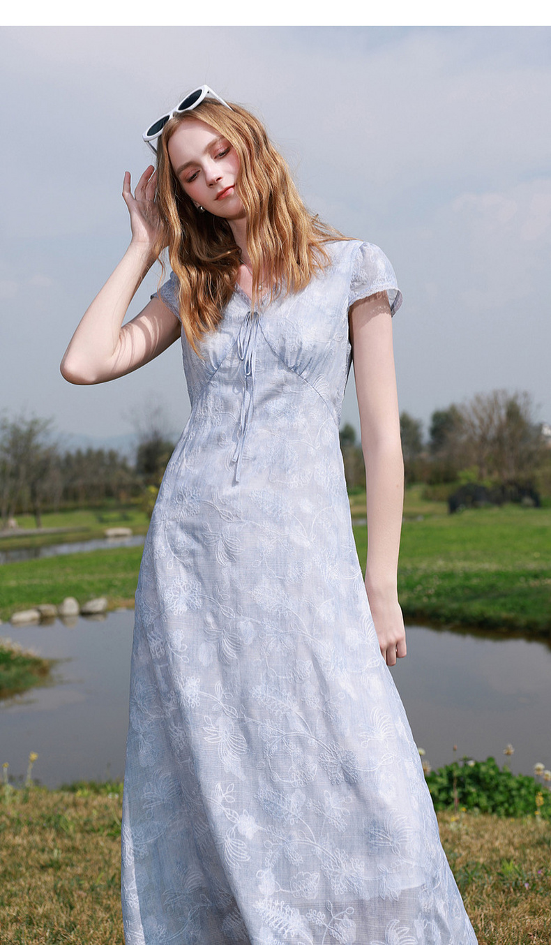 三彩2026夏季新款绣花印花连衣裙法式V领A字裙长裙M