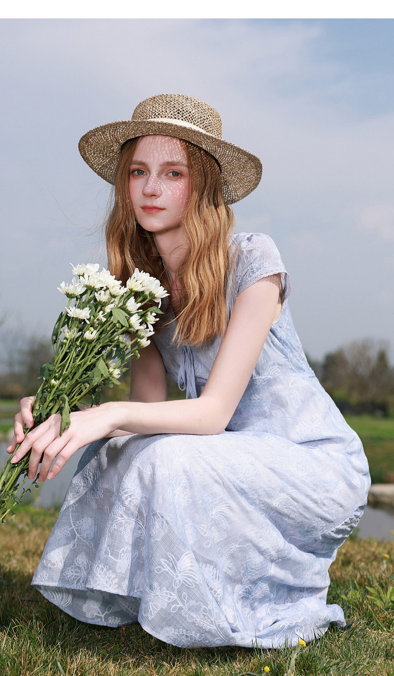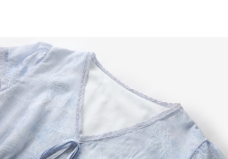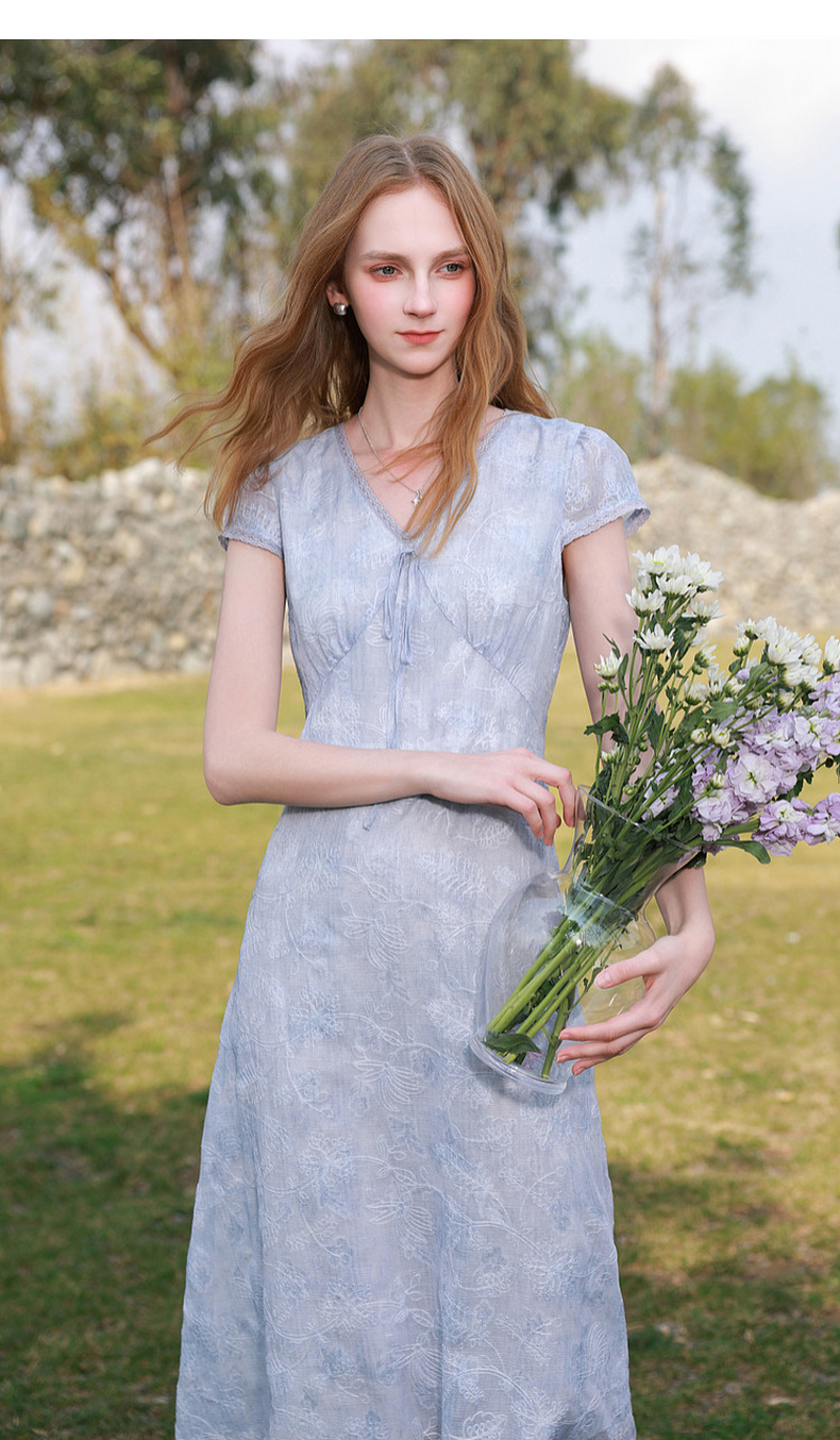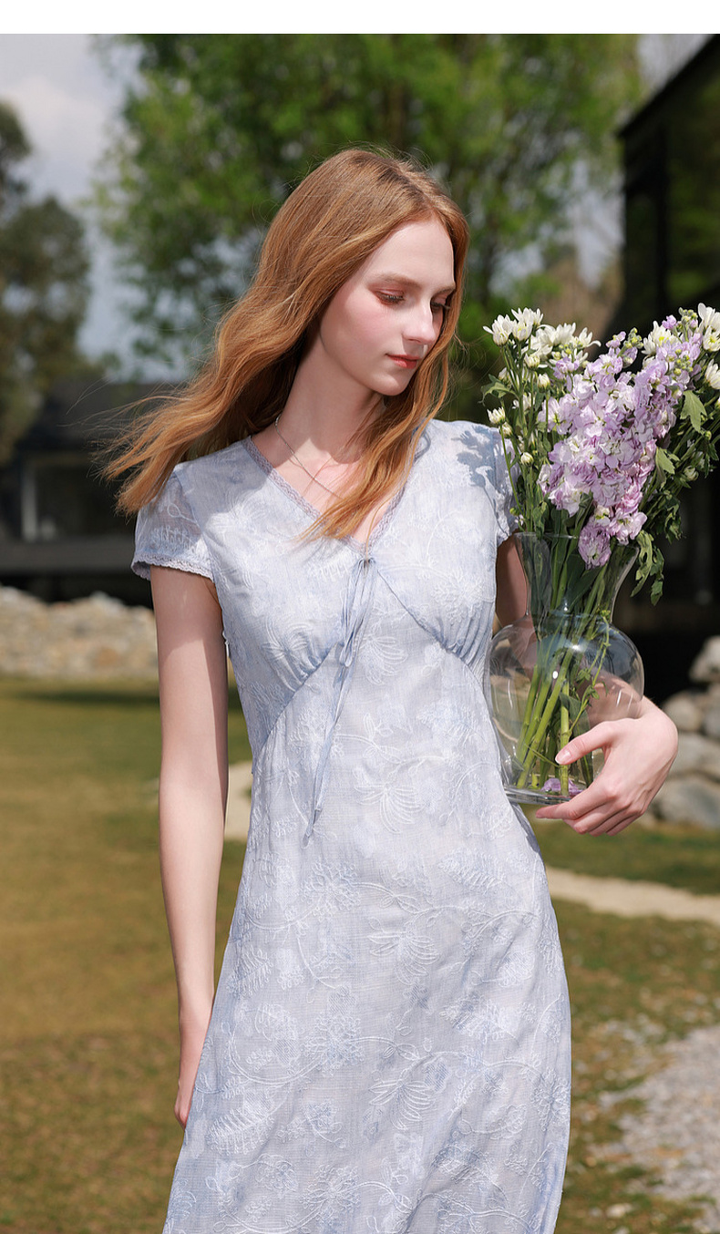 三彩2026夏季新款绣花印花连衣裙法式V领A字裙长裙M