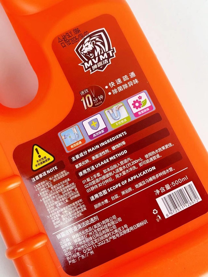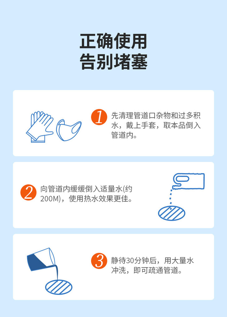 而且使用方法非常非常非常简单✨用它女孩子也能轻松疏通管道! Step 1:戴上手套(不可接触皮肤),将狮露洁管道清洁疏通剂倒入管道内 Step 2:向管道内缓缓倒入适量水,使用热水效果更佳! Step 3:静待30分钟厚,用大量水冲洗,即可疏通管道~ ⚠注意事项 ①如管道较小,倒入速度应缓慢 ②如水浸出管口,需先清理管道外口再倒入本品 ③若使用后,管道仍未完全疏通,可按照上述使用方法再使用一次 ④使用疏通剂时请勿直接接触皮肤,因皮肤含有水分,当两者触碰时,发生反应,会导致皮肤烧伤,建议使用时戴上手套、口罩 ⑤此类疏通剂随着使用剂量增多和水温增高,分解过程中会产生一些气味,建议在通风环境中使用,使用时,建议人体与疏通处距离60cm,防止反应时产生喷溅!