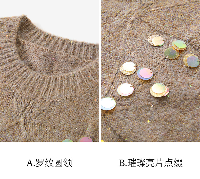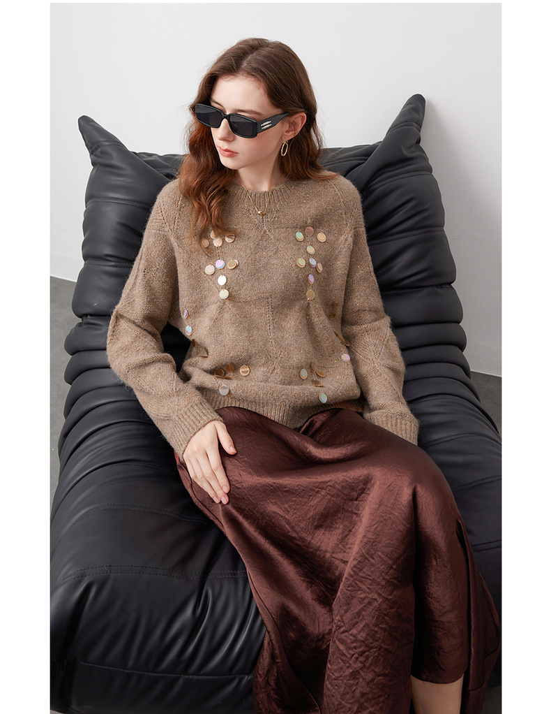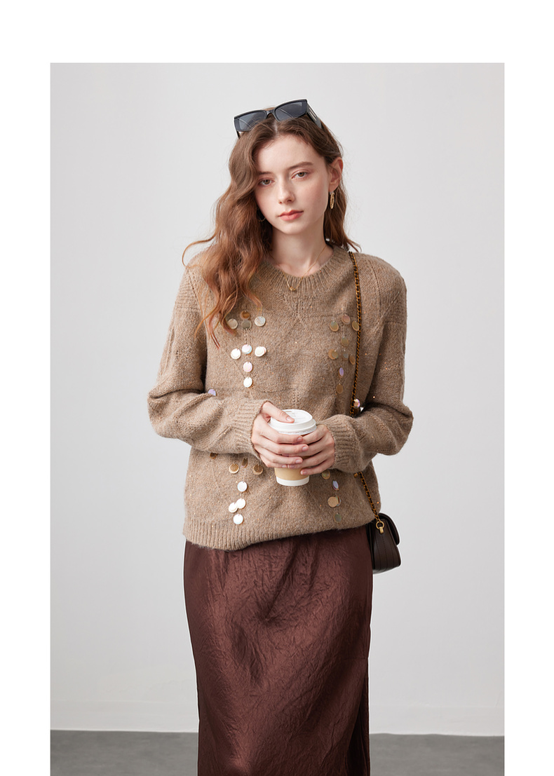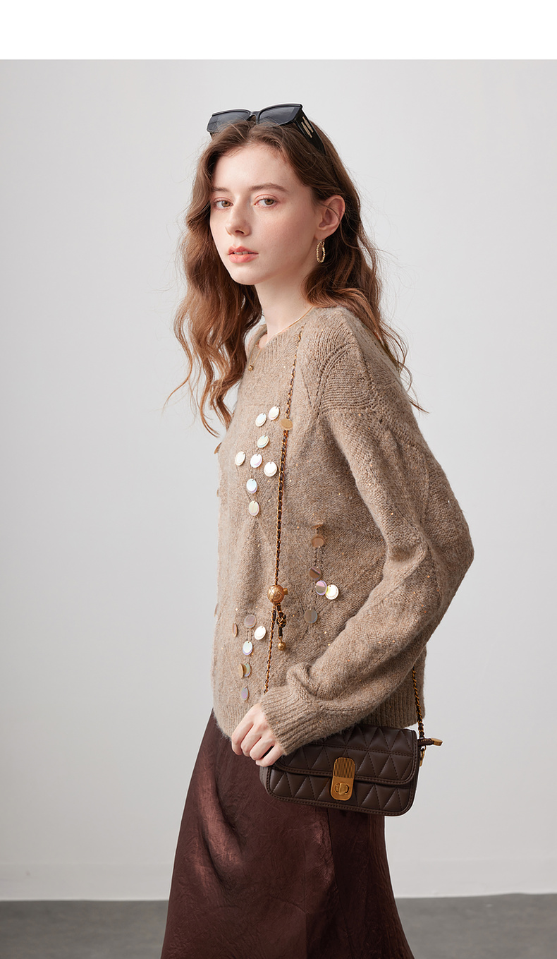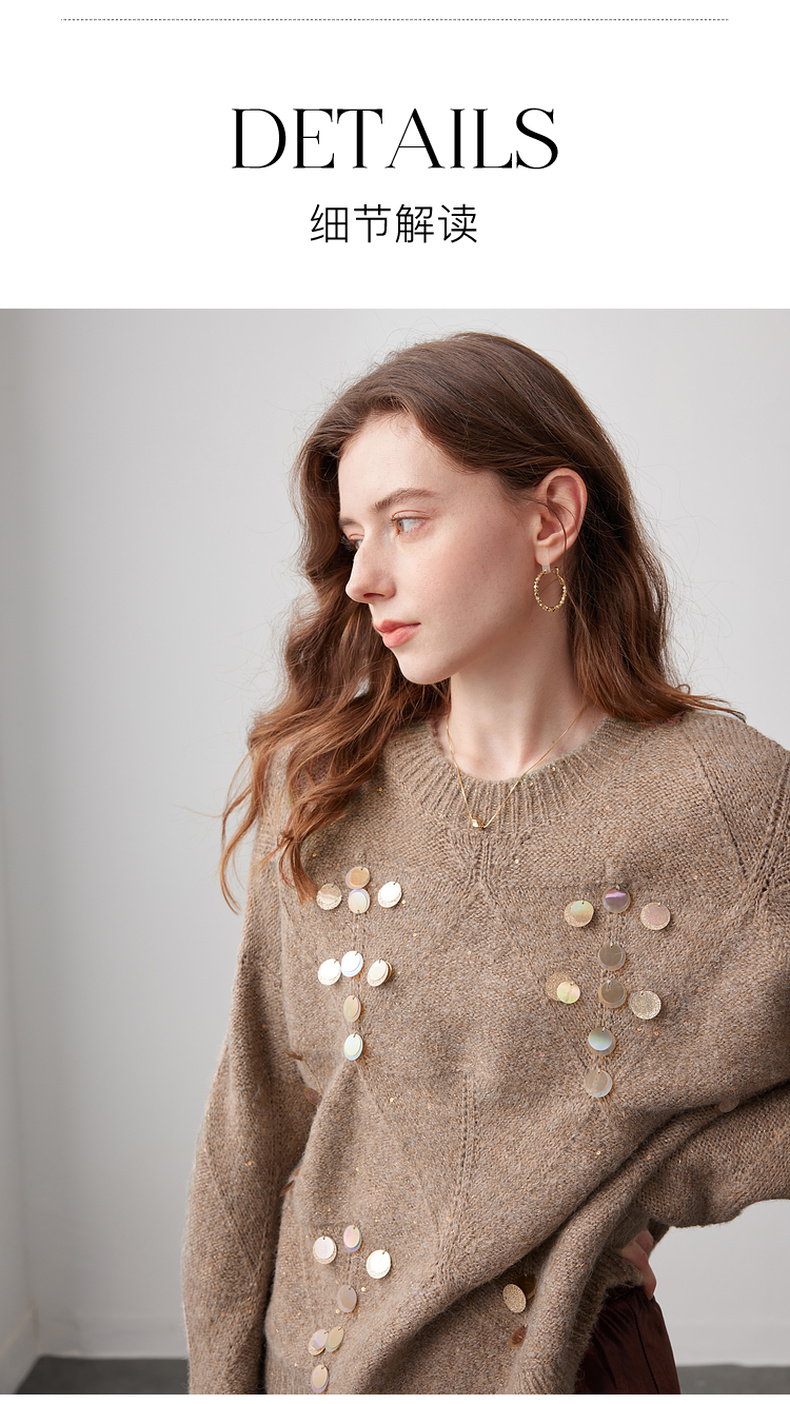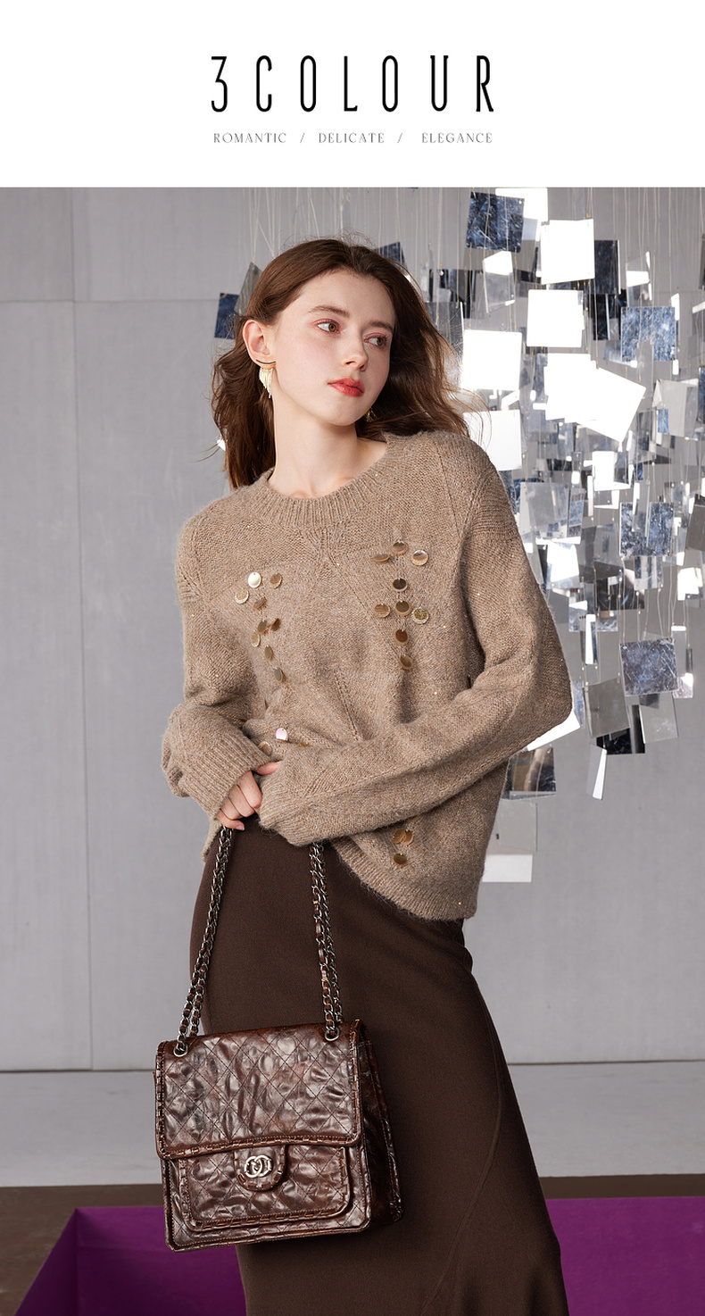 三彩2025冬季新款美拉德亮片针织衫宽松慵懒套头毛衣圆领女
