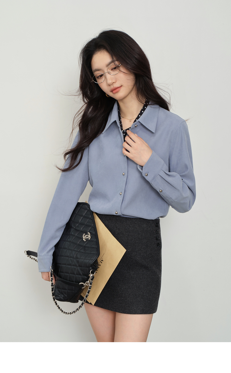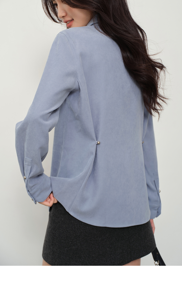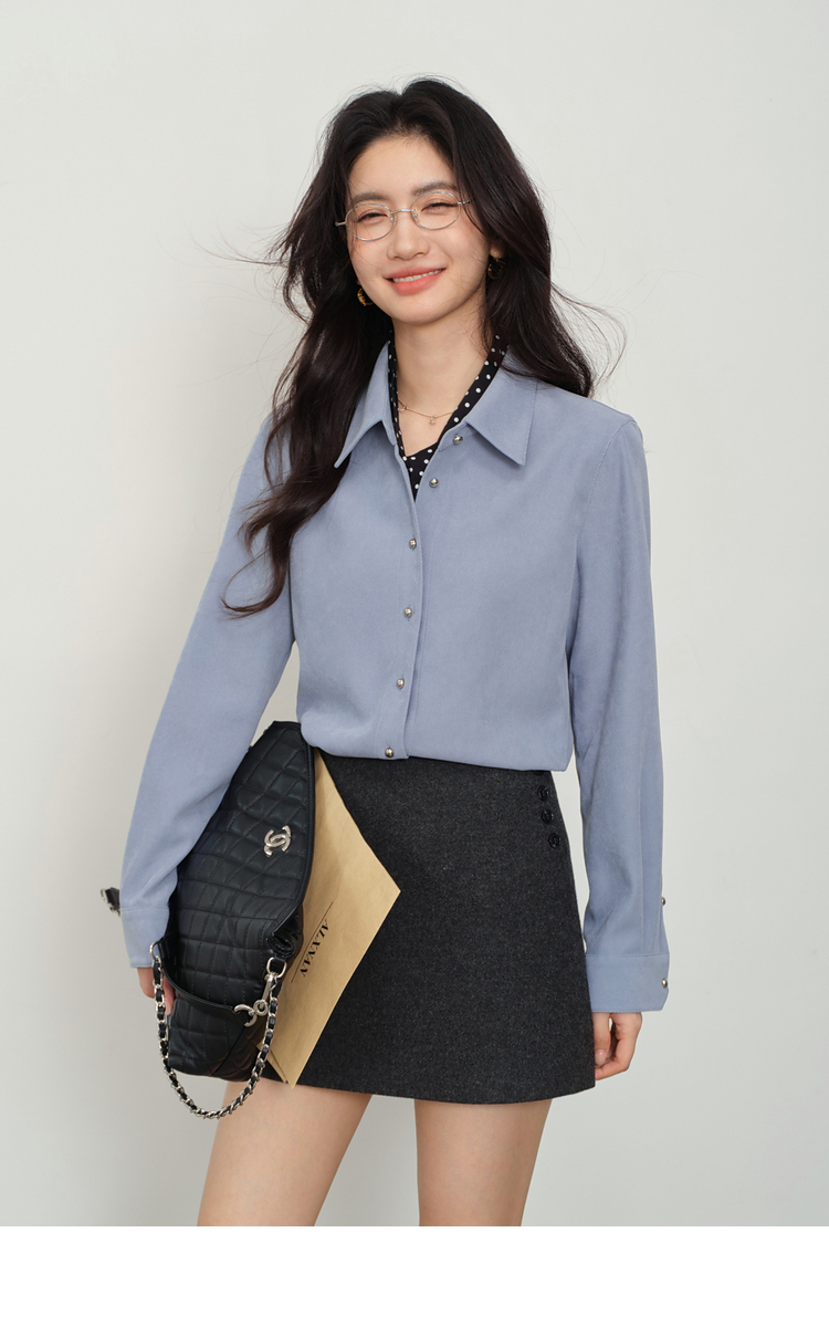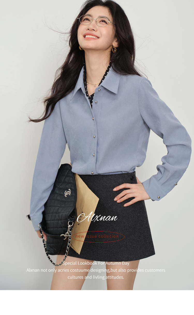 鹿向南「蔚蓝书封」雾霾蓝polo领休闲衬衫女秋季新款气质长袖衬衣