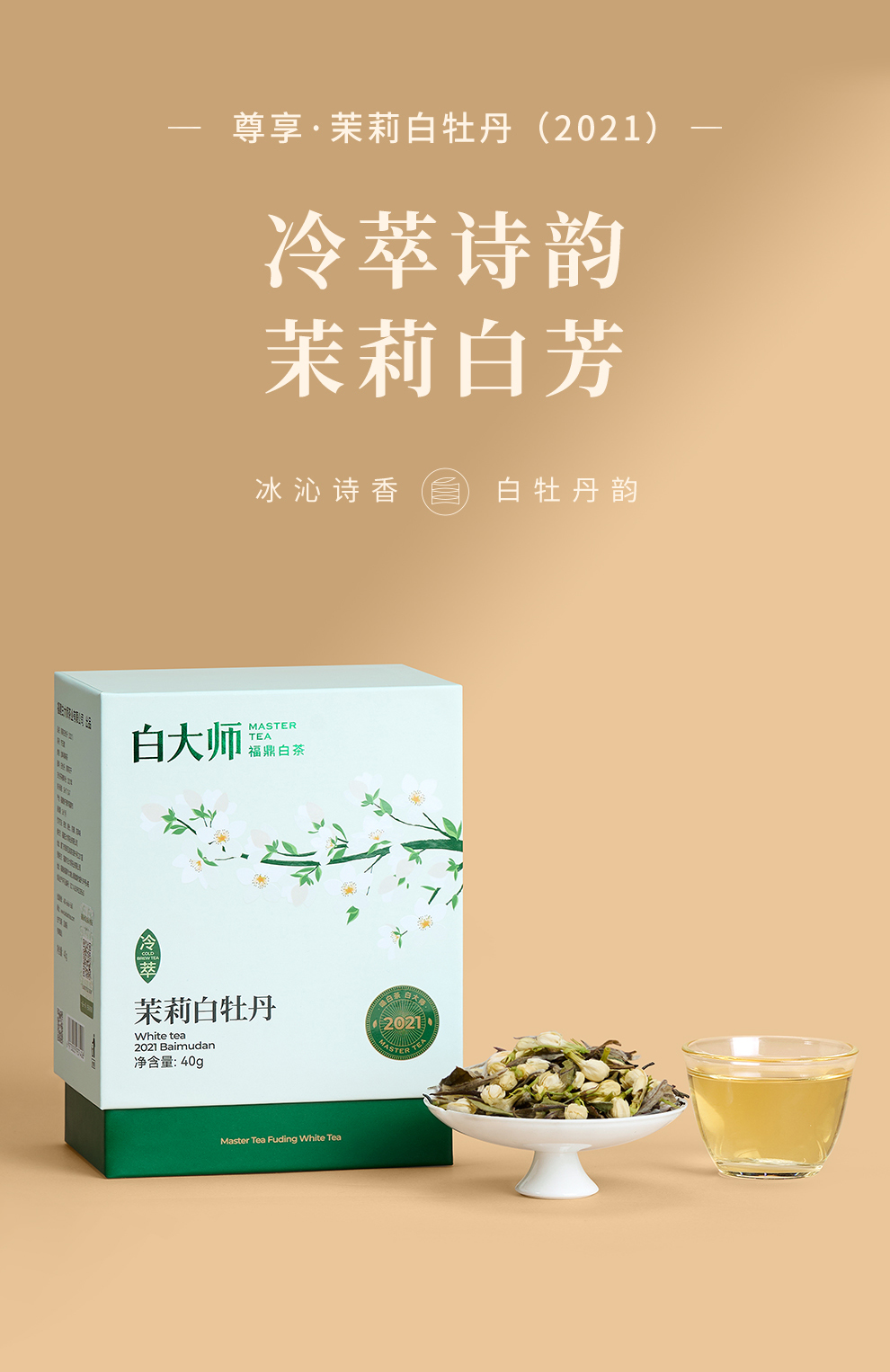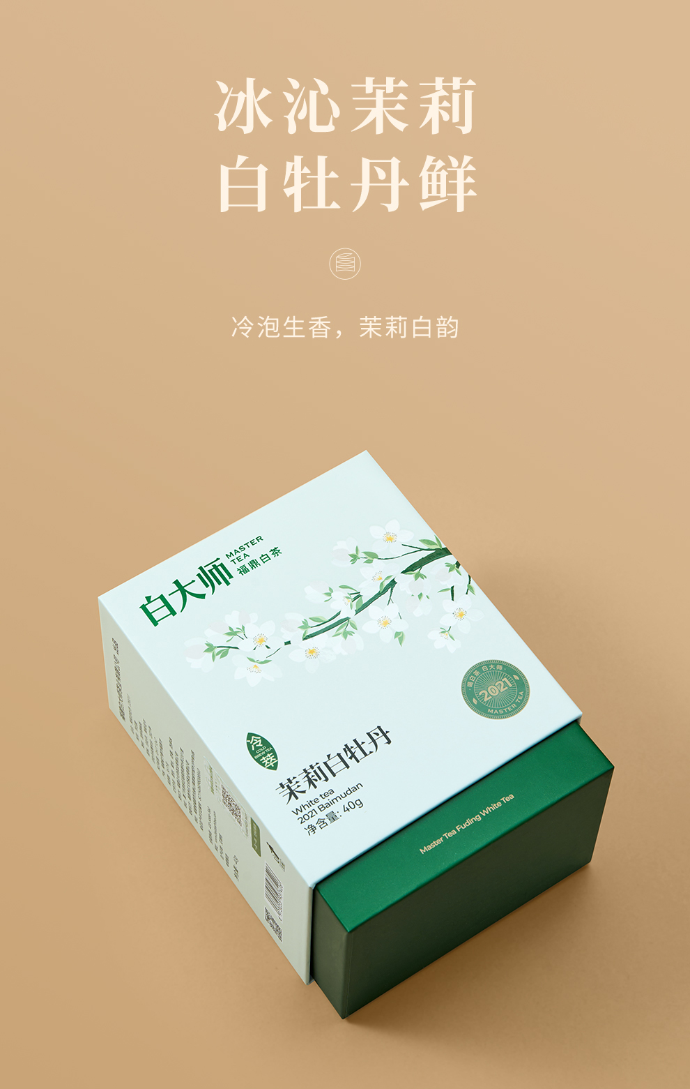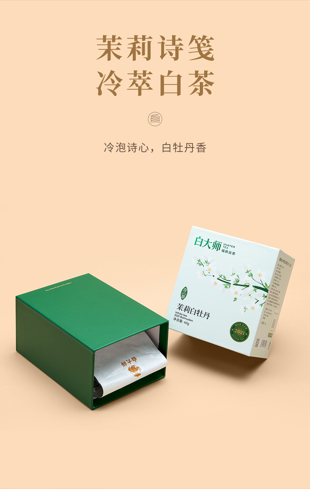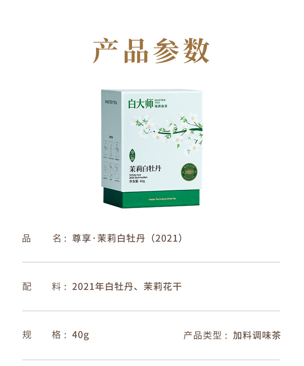 白大师白茶正宗福鼎白茶2021年冷萃茉莉白牡丹散茶80g