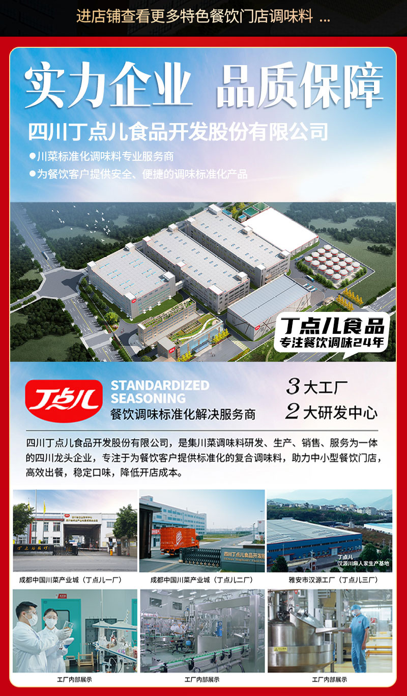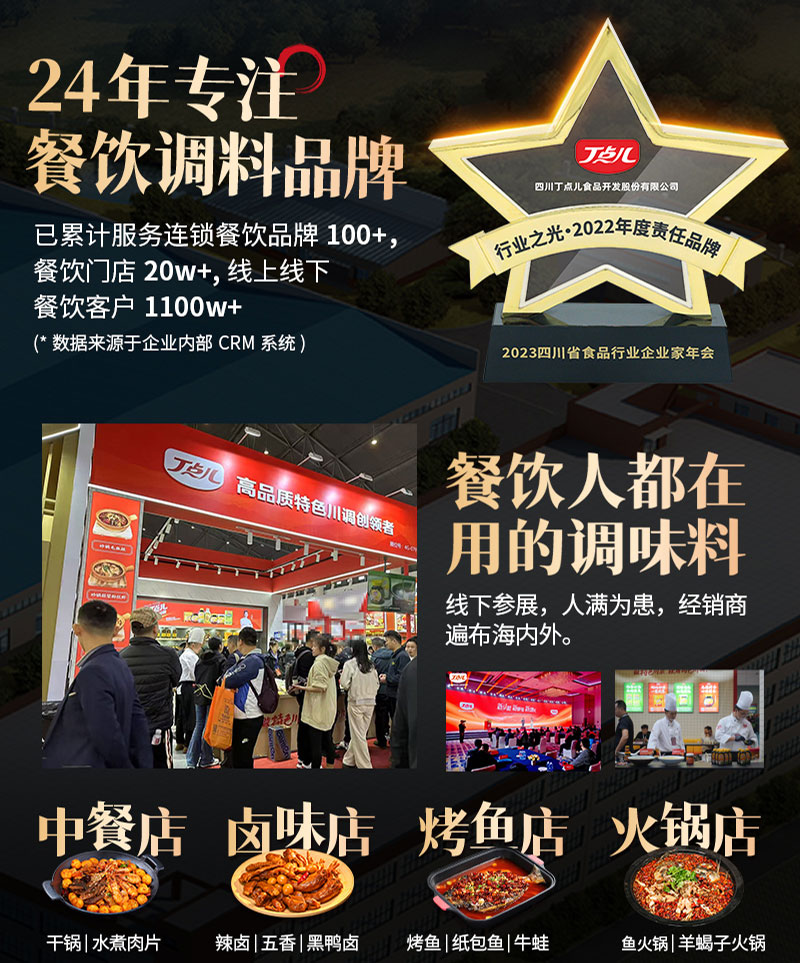 四川丁点儿食品开发股份有限公司,是集川菜调味料研发、生产、销售、服务为一体的现代化企业,专注为餐饮客户提供川菜调味解决方案。公司成立至今,服务了超百万家的餐饮门店以及连锁品牌。