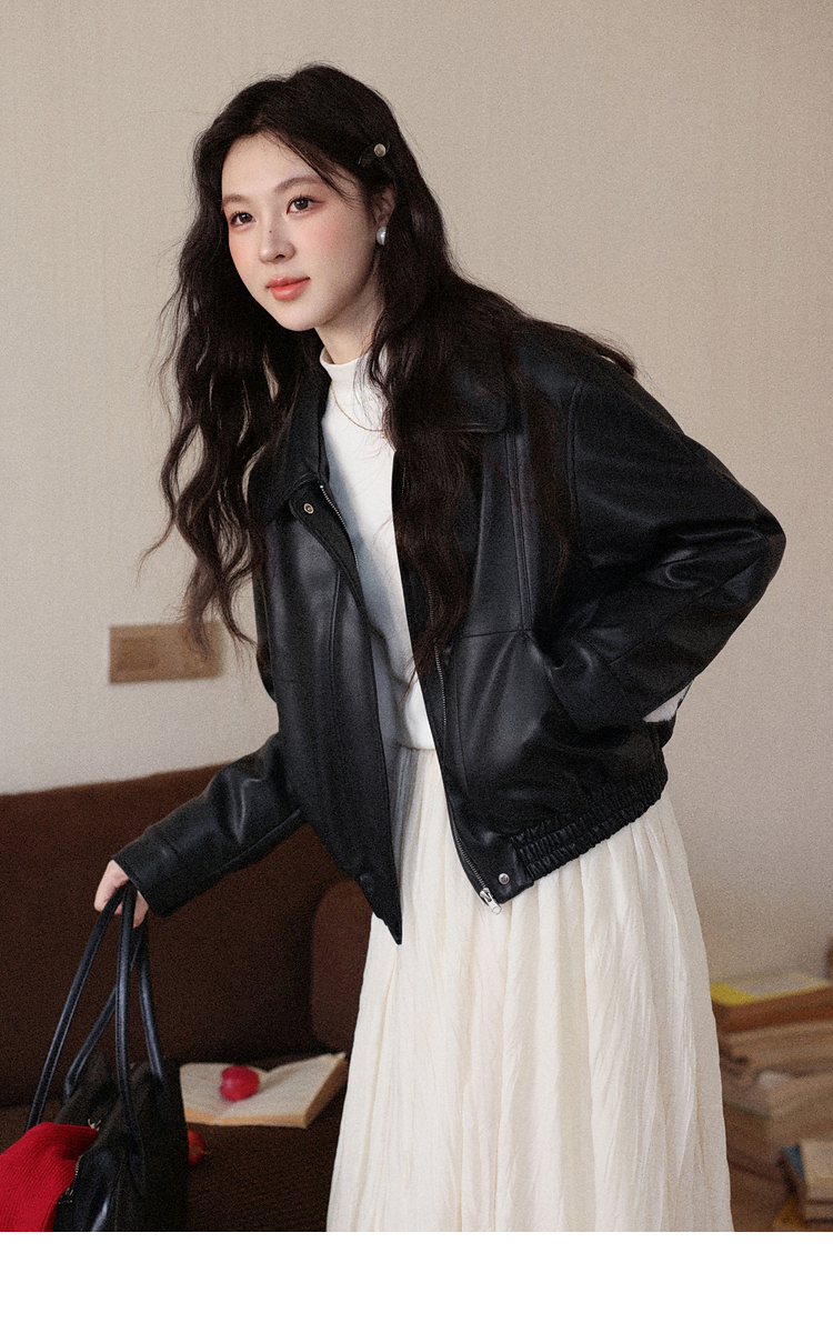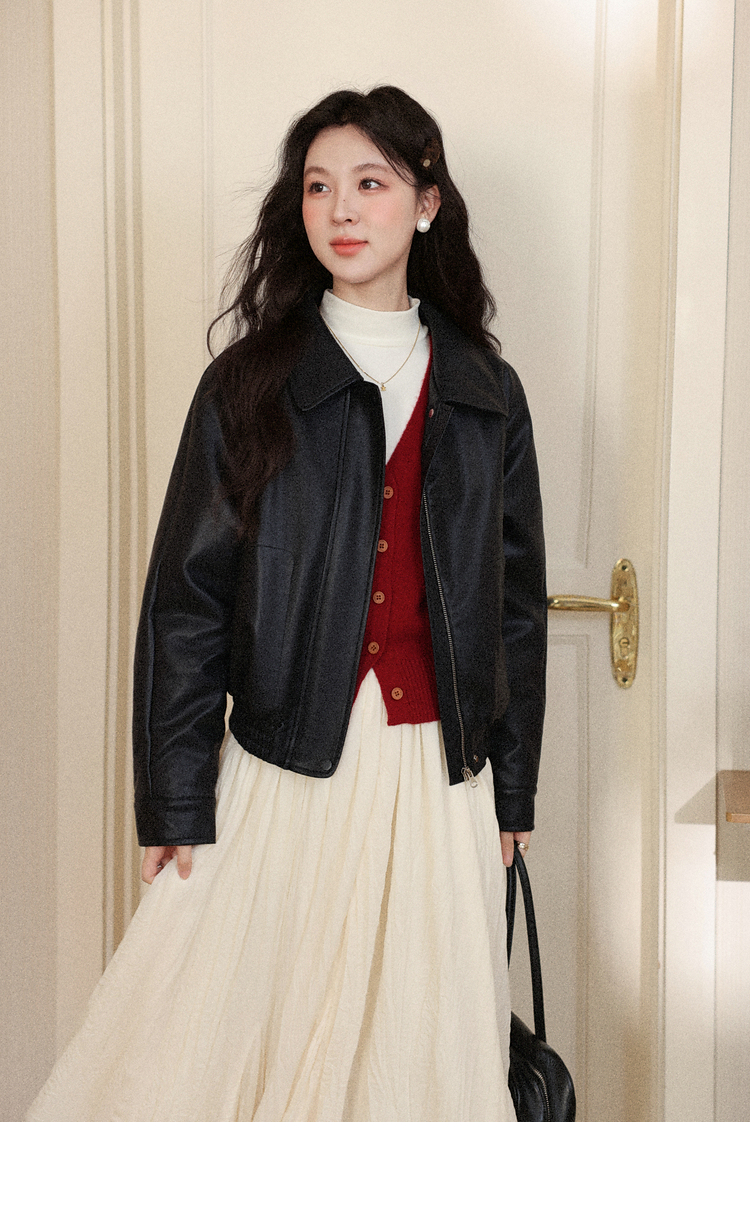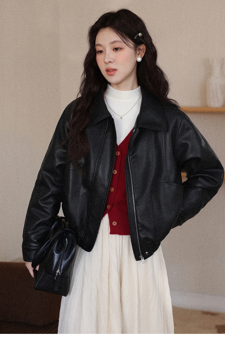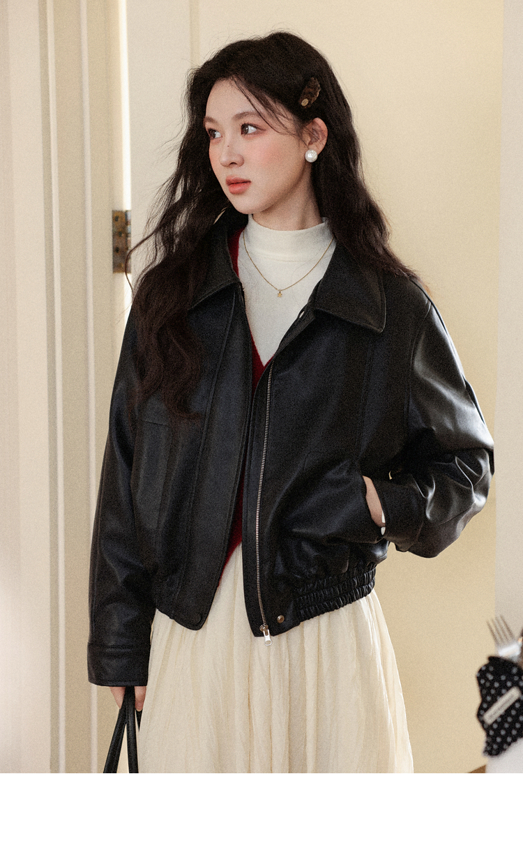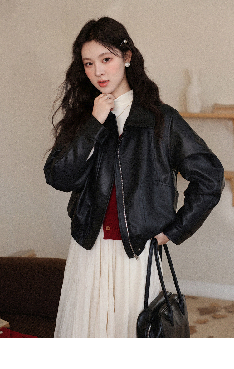 鹿向南「墨氅凝香」黑色皮衣外套女秋季款独特高级翻领加绒夹克女