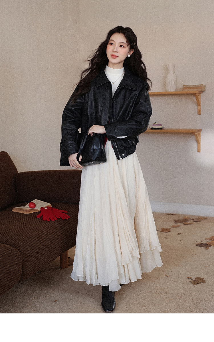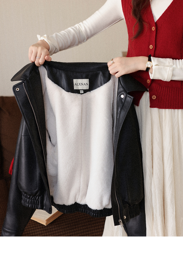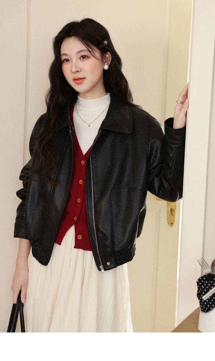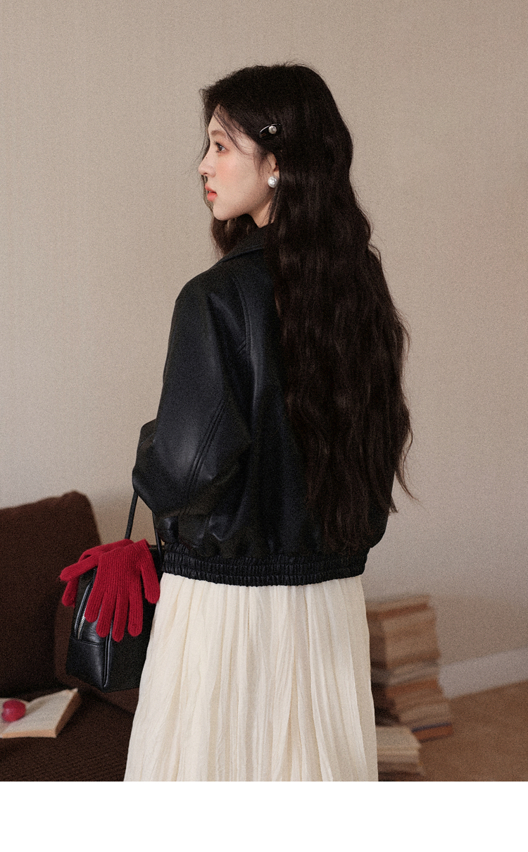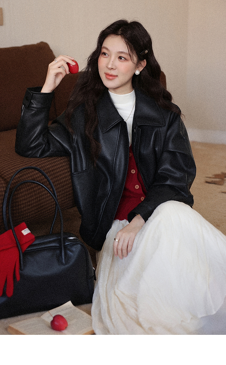 鹿向南「墨氅凝香」黑色皮衣外套女秋季款独特高级翻领加绒夹克女