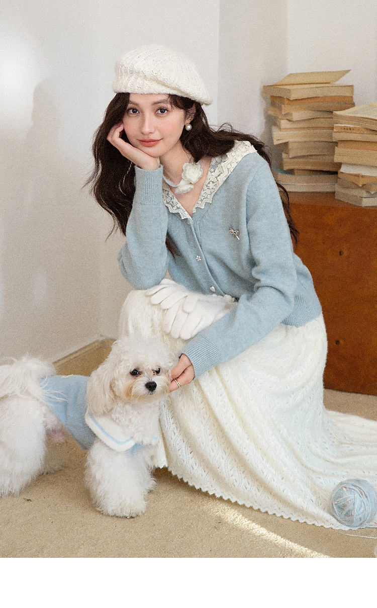 鹿向南「半糖云朵」法式蓝色蕾丝连帽针织开衫女秋冬短款毛衣上衣