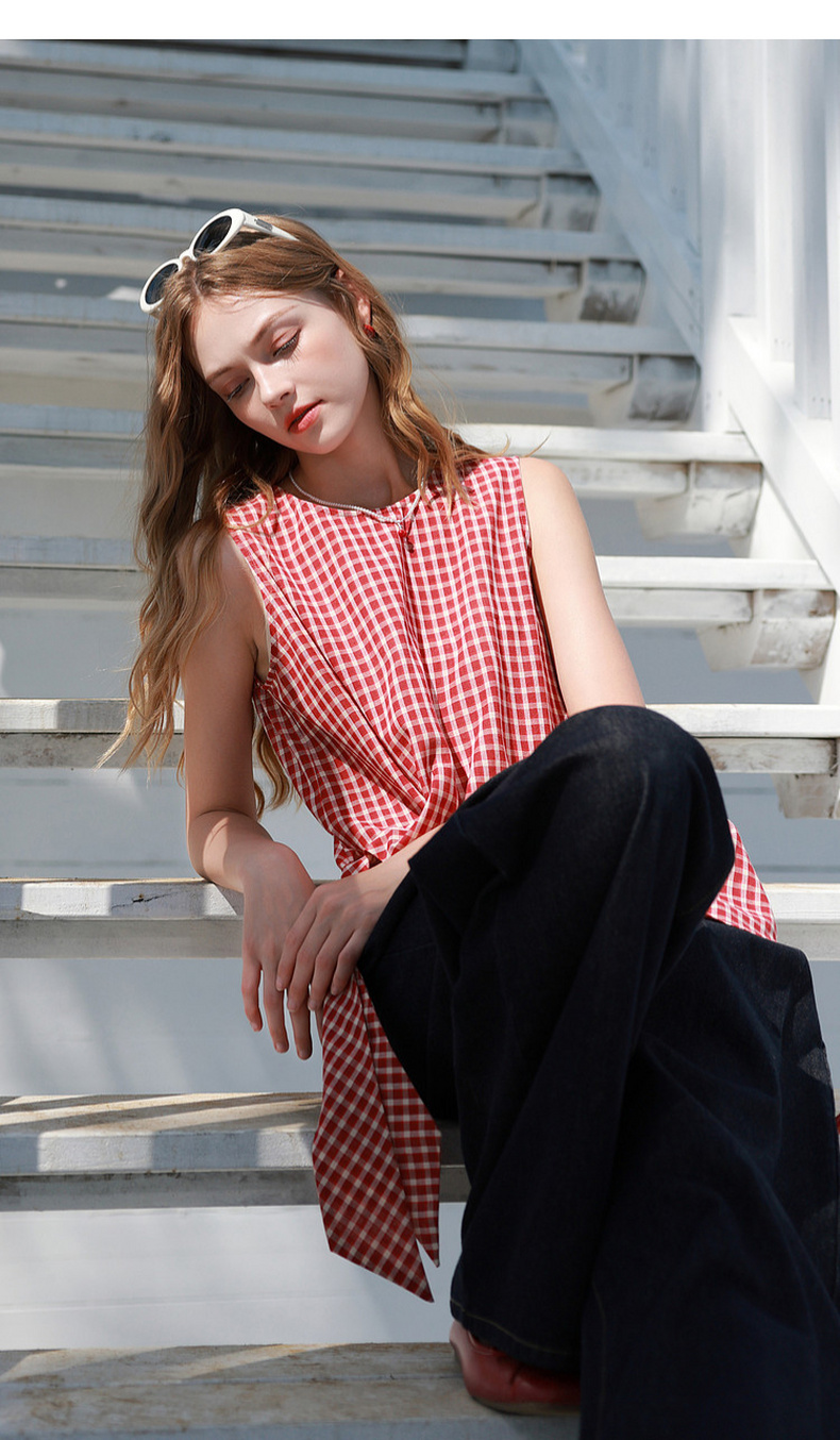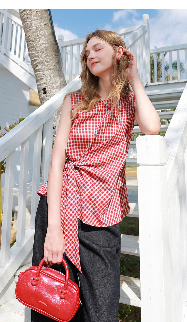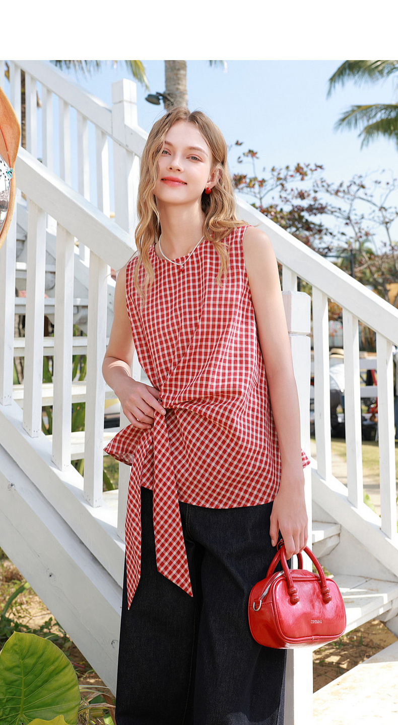 三彩2026夏季新款圆领无袖格纹上衣套头小衫套头衬衣系带收腰M