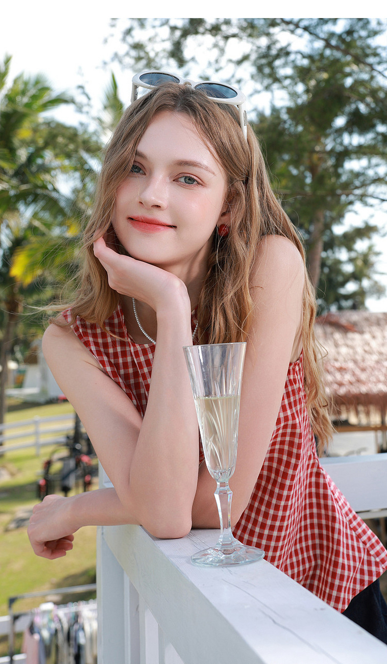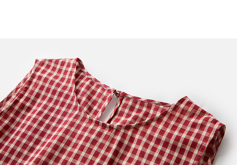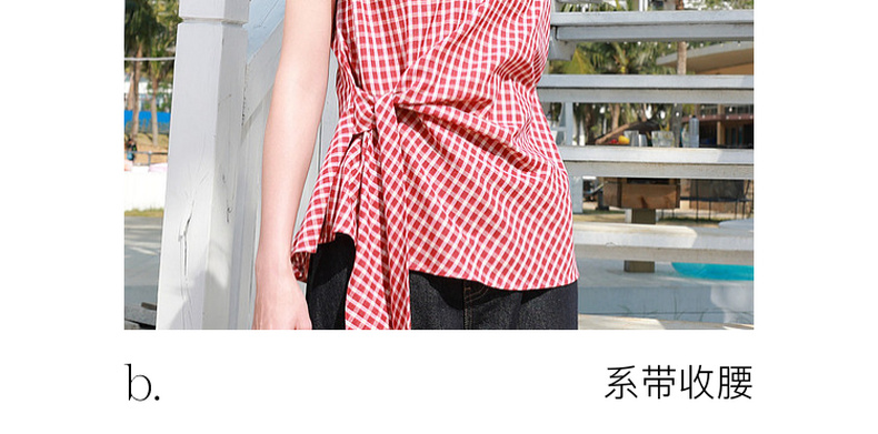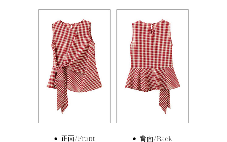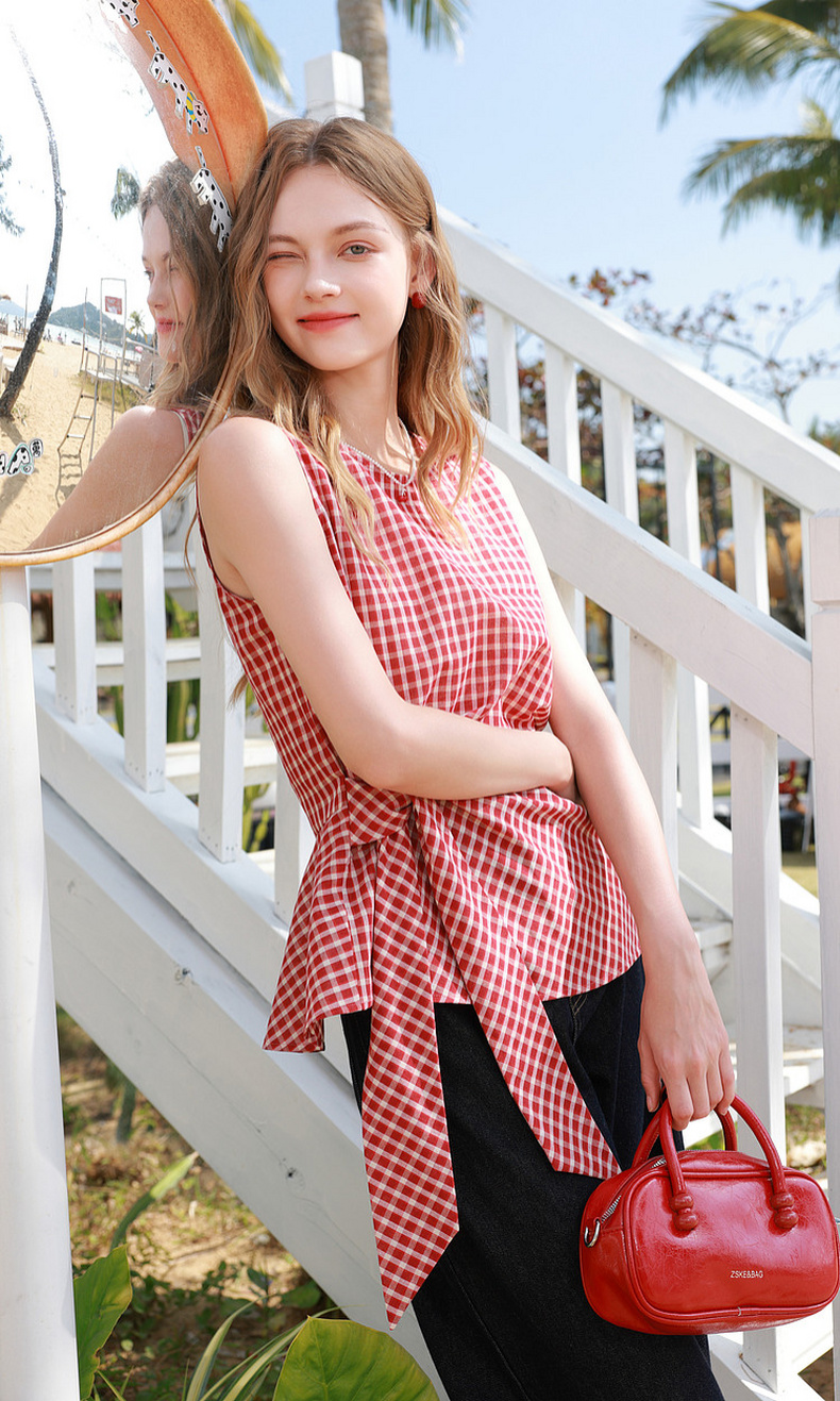 三彩2026夏季新款圆领无袖格纹上衣套头小衫套头衬衣系带收腰M
