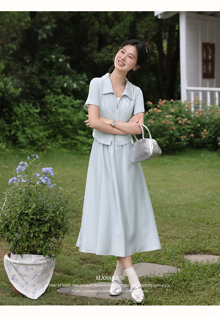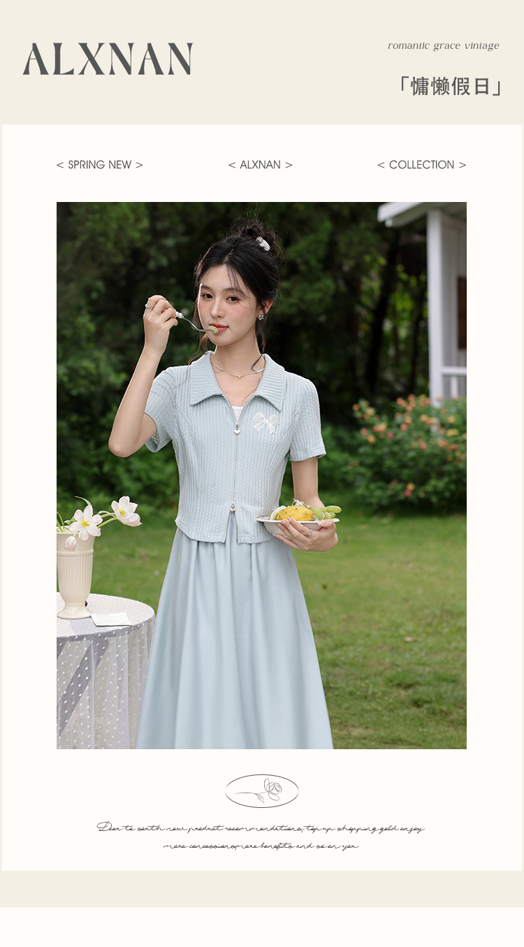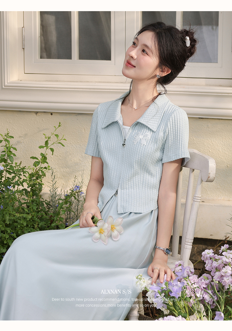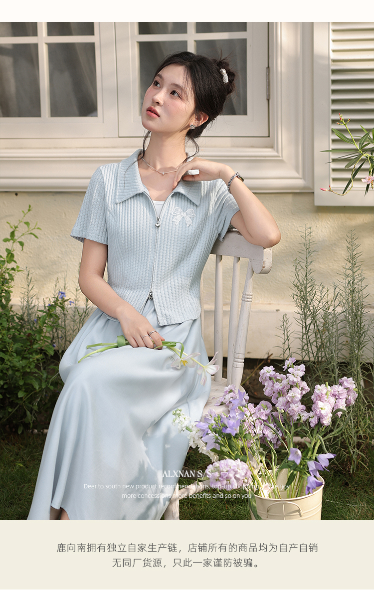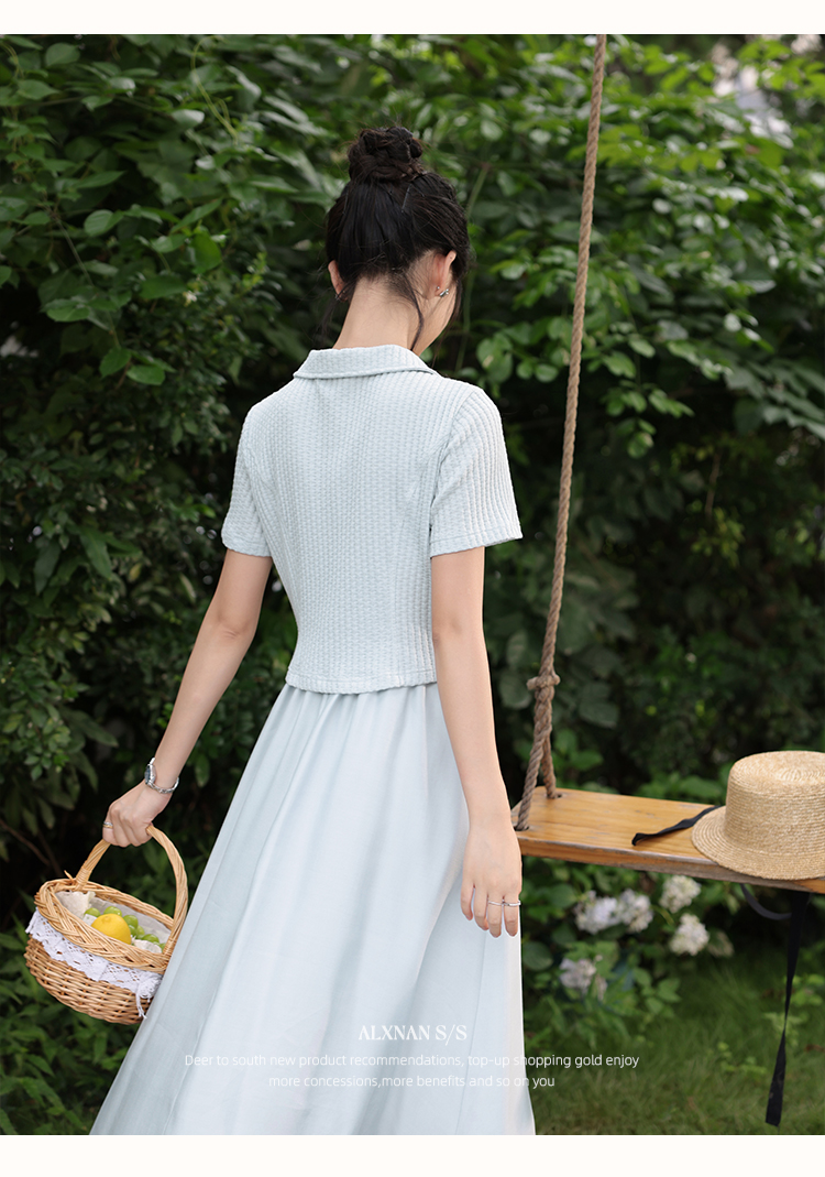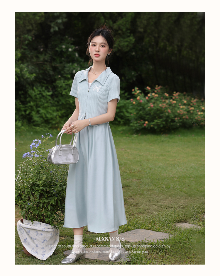 鹿向南「慵懒假日」蓝色假两件短袖连衣裙夏季新款气质时尚长裙女