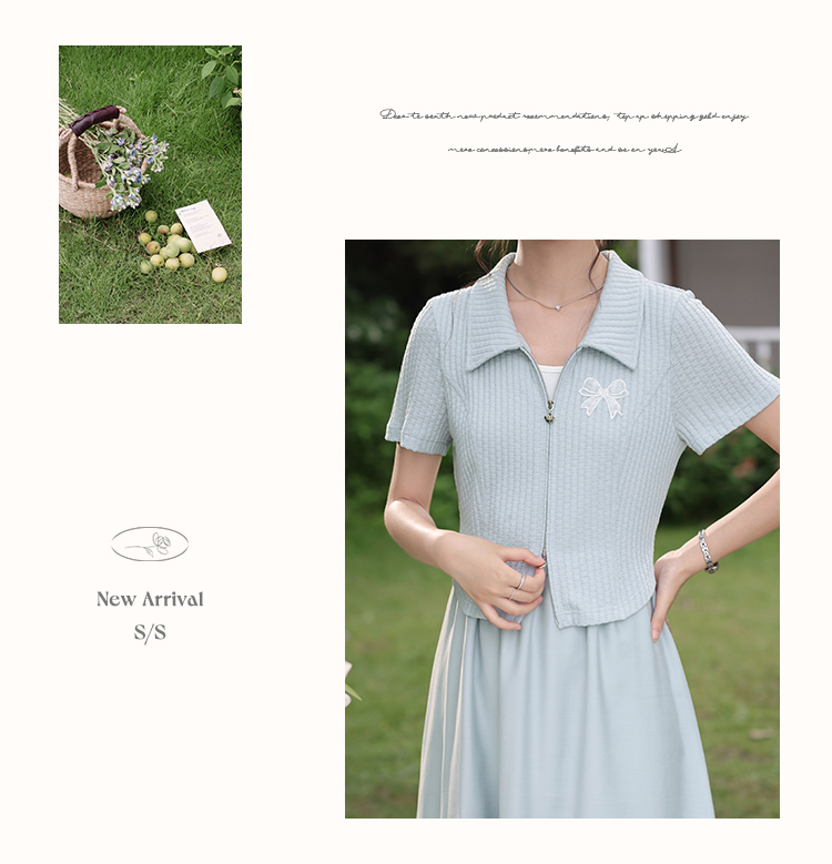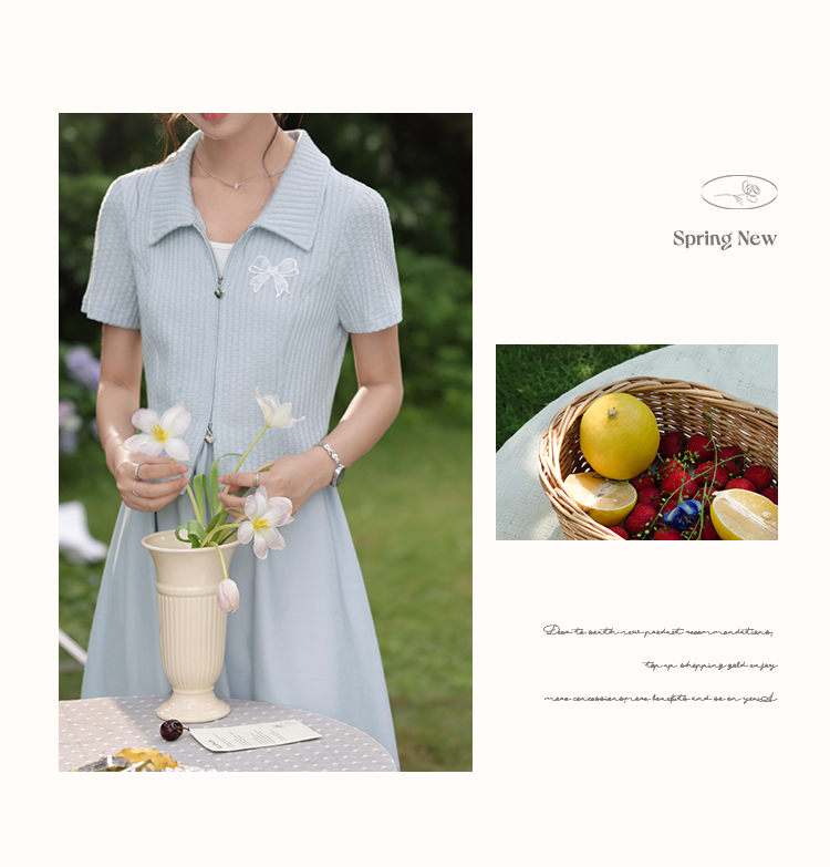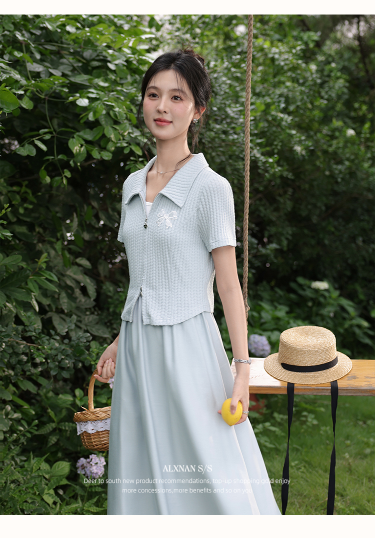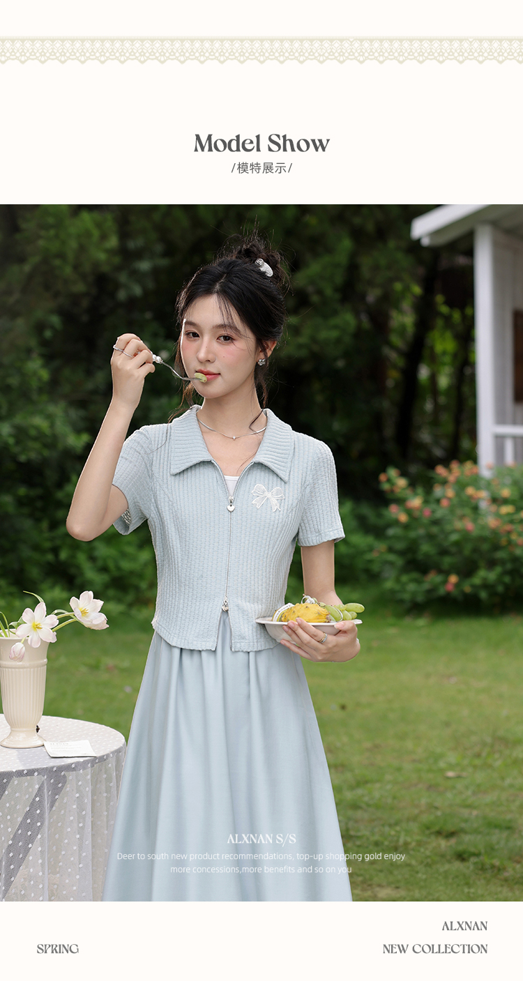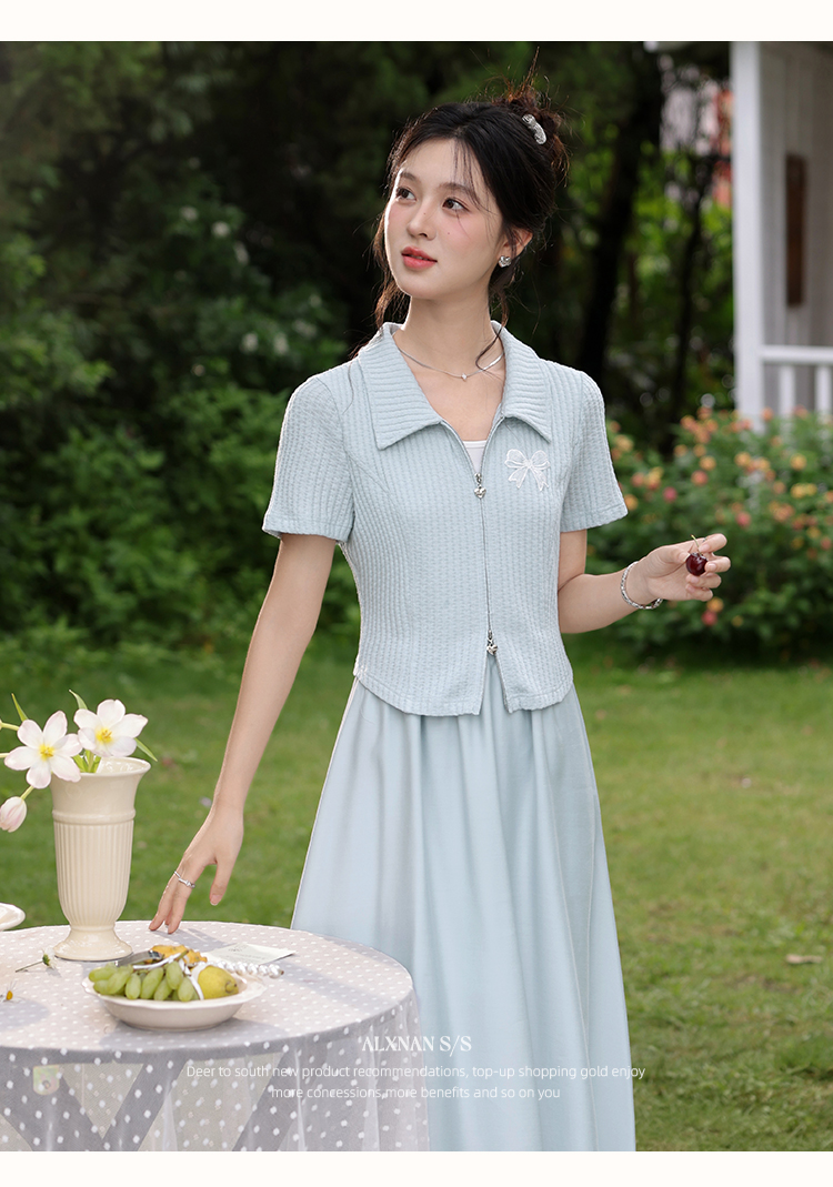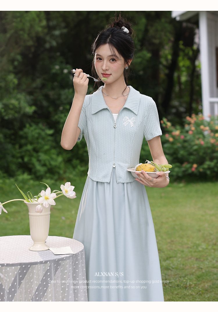 鹿向南「慵懒假日」蓝色假两件短袖连衣裙夏季新款气质时尚长裙女