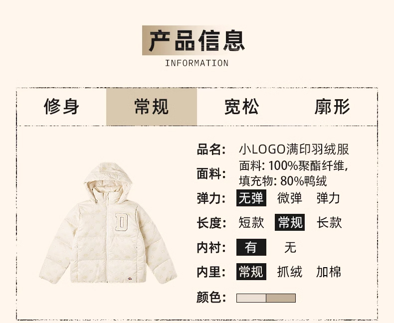 Dickies小LOGO休闲百搭舒适满印羽绒服 羽绒服女 DK0A87FB
