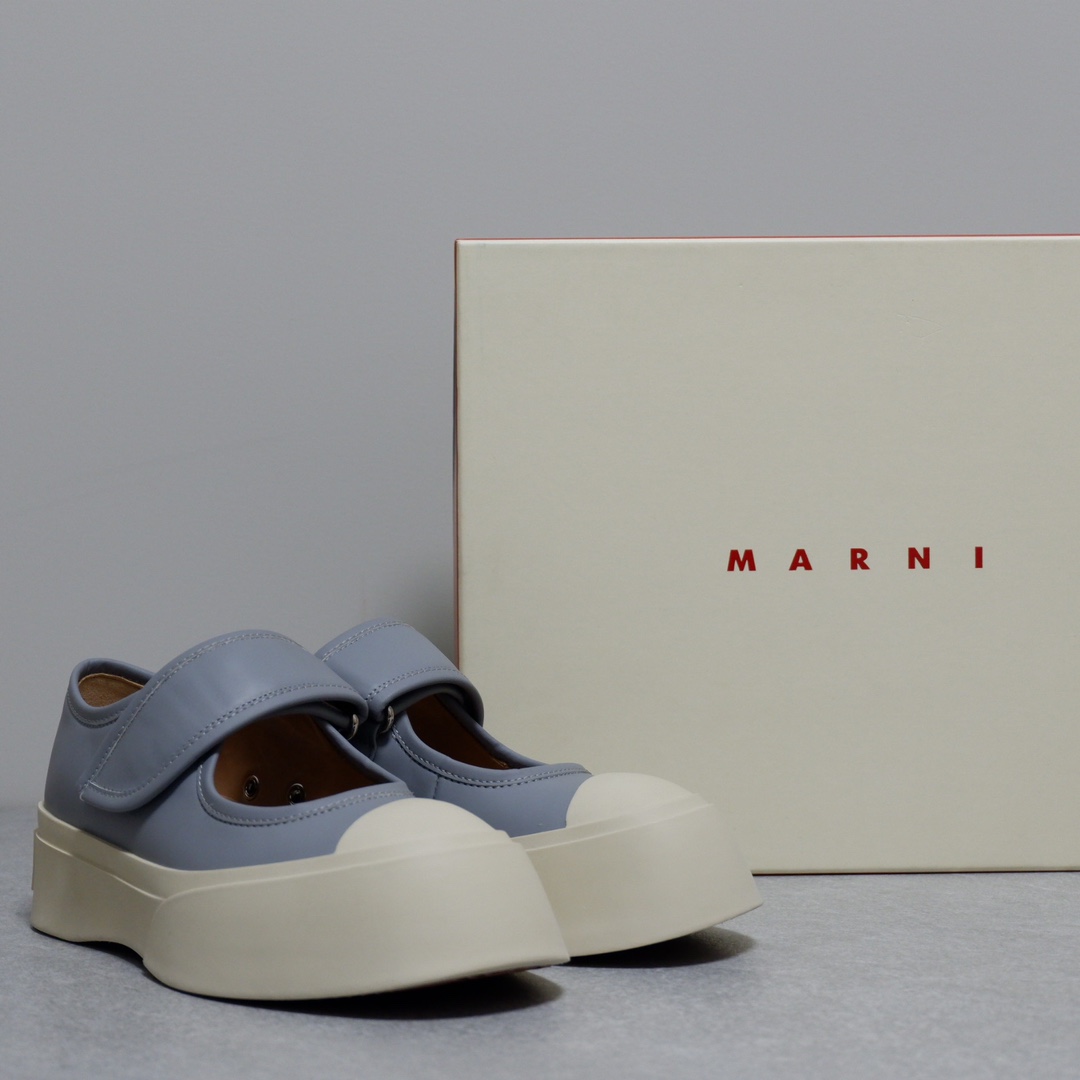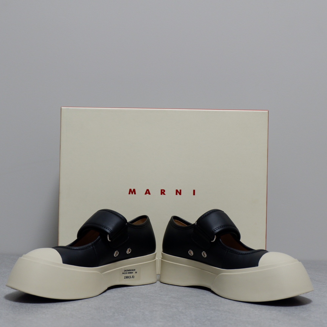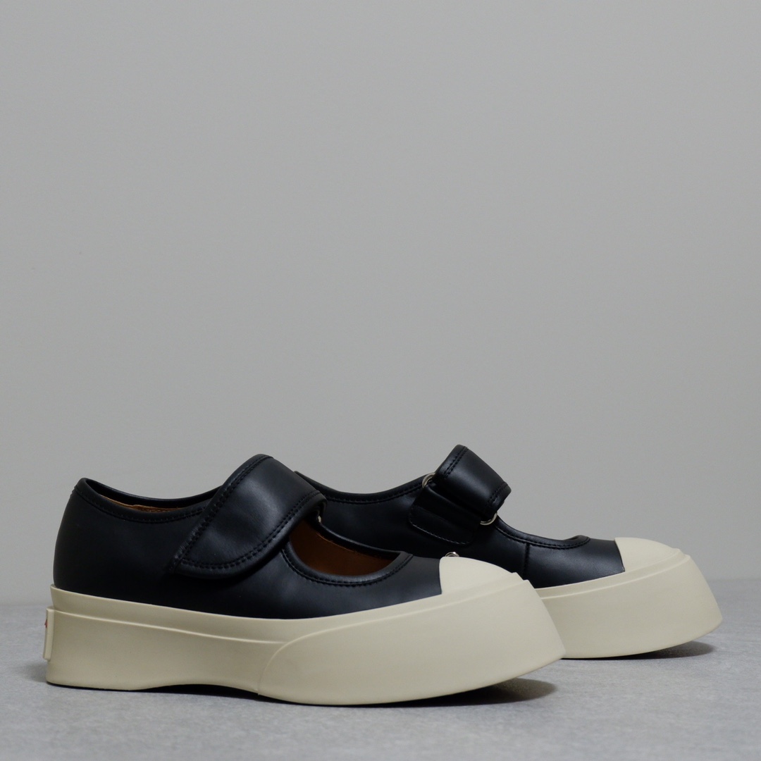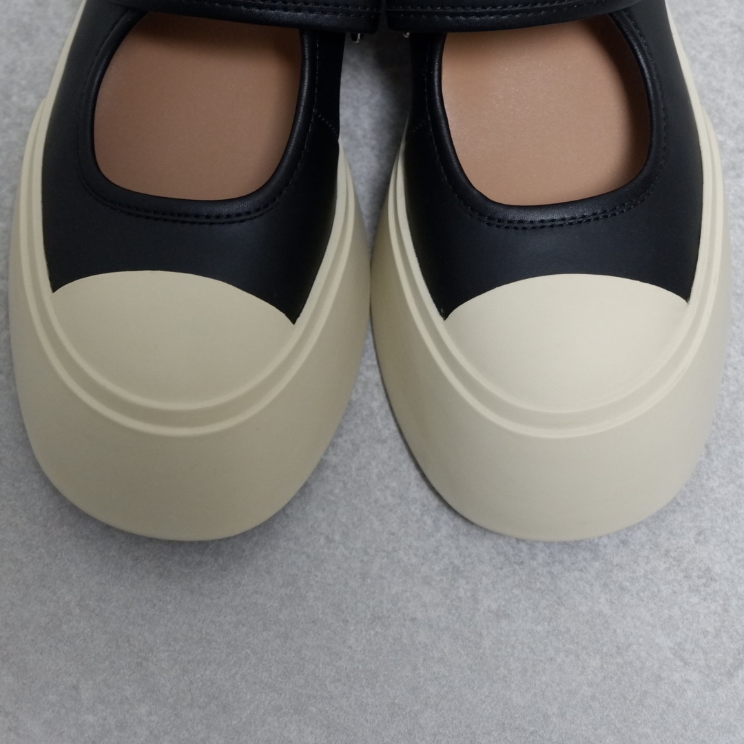 MARNI 玛尼最新款大头女鞋,非常显高档又舒适,白色黑色都好打理,脚感非常好,完全不打脚,主要是很显脚细哦!还可以增高,鞋头大大的还有一种卖萌的感觉,让人忍不住的想摸,非常百搭,没有它搭配不了的,原版特定牛皮材质,内里羊皮,鞋垫羊皮,独家开模大底 鞋头圆圆的 鞋底是增高的,搭配裙子 裤子都可以 可甜可酷 显个高 显腿瘦长。在增高的基础上,也不失去时尚感脚感很舒适,属于那种越穿越柔软的鞋。 总觉得厚底鞋会显得特别笨重,没想到上脚超级棒很秀气,而且很轻 最重要的是皮面超级好打理 湿巾纸擦擦就干净了 美美地出门看电影去