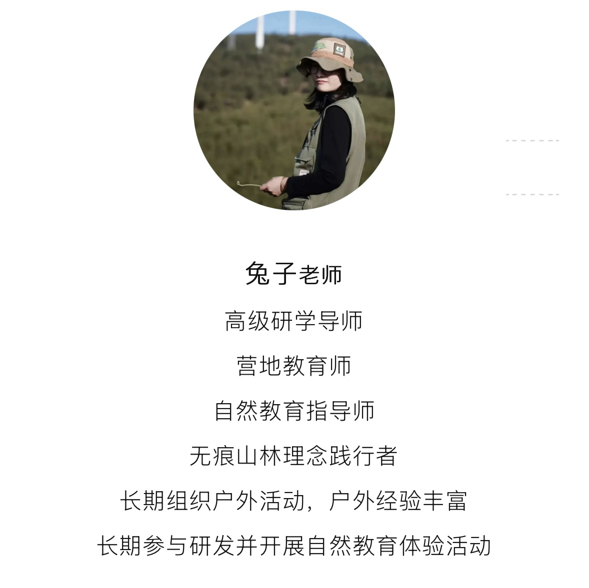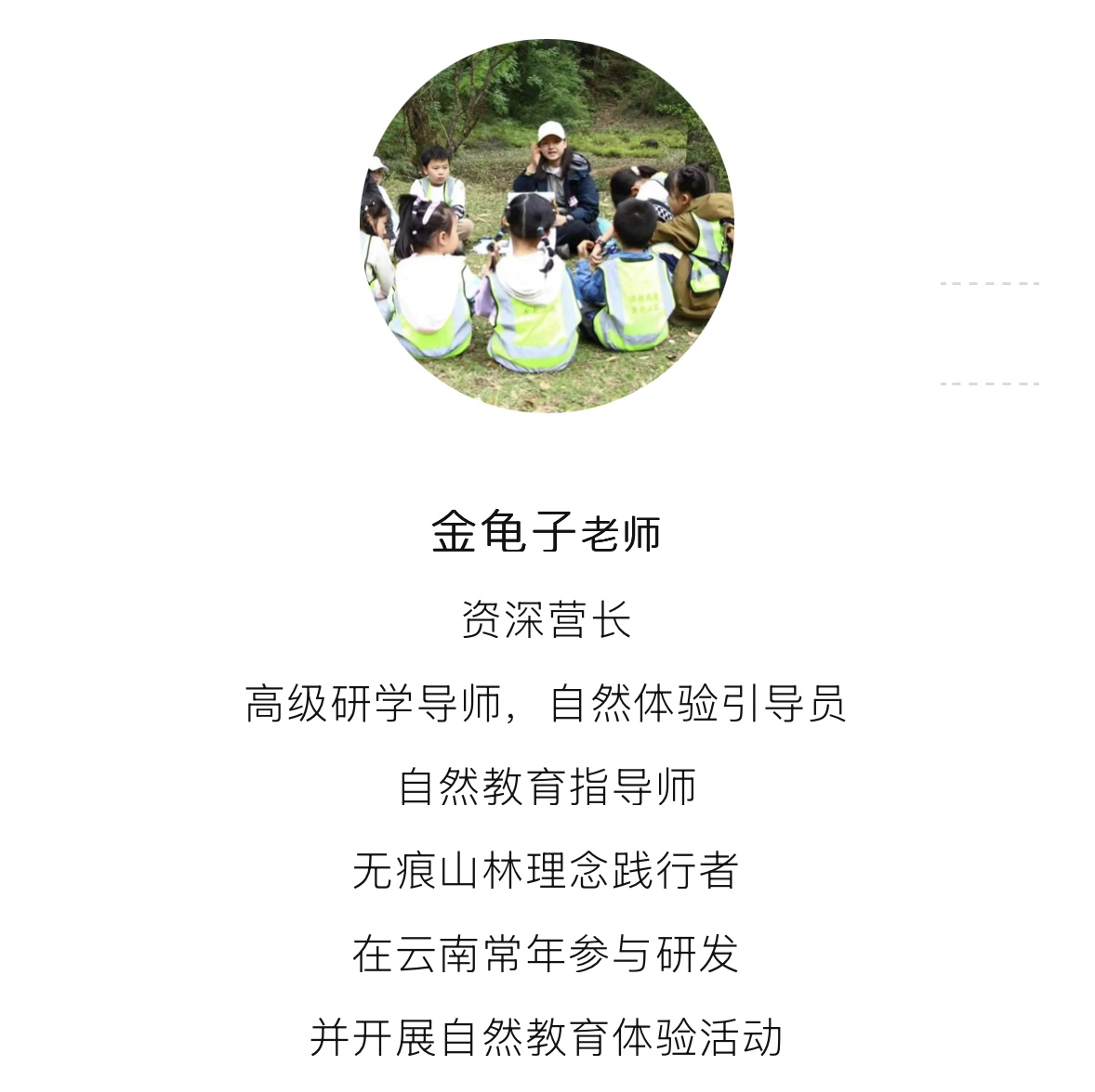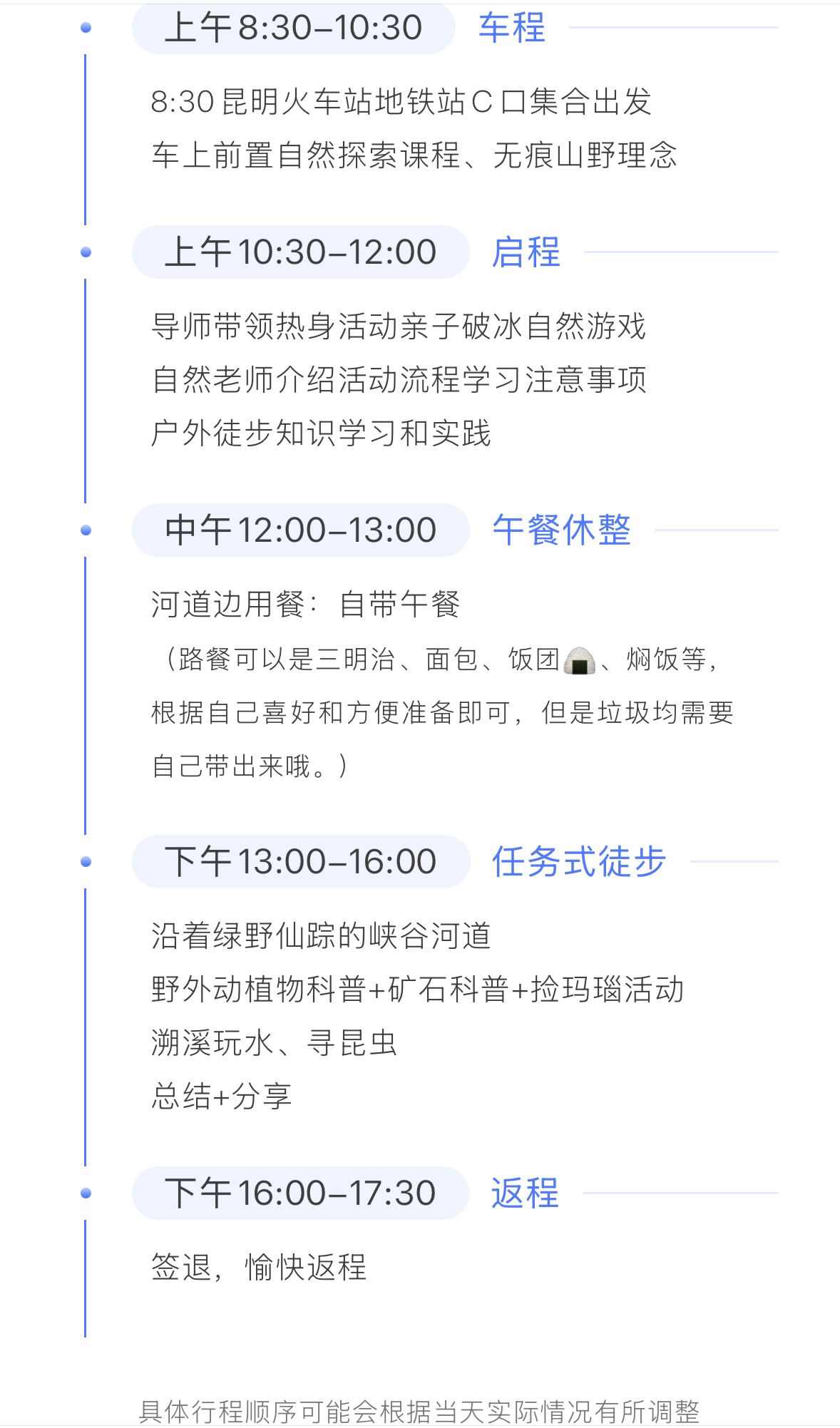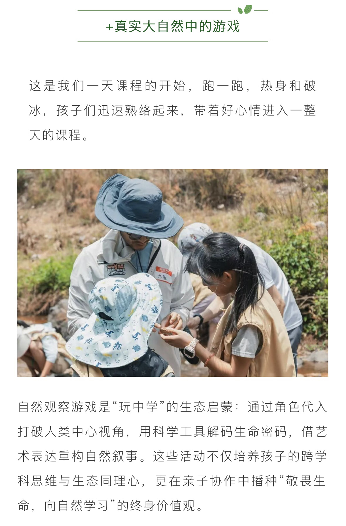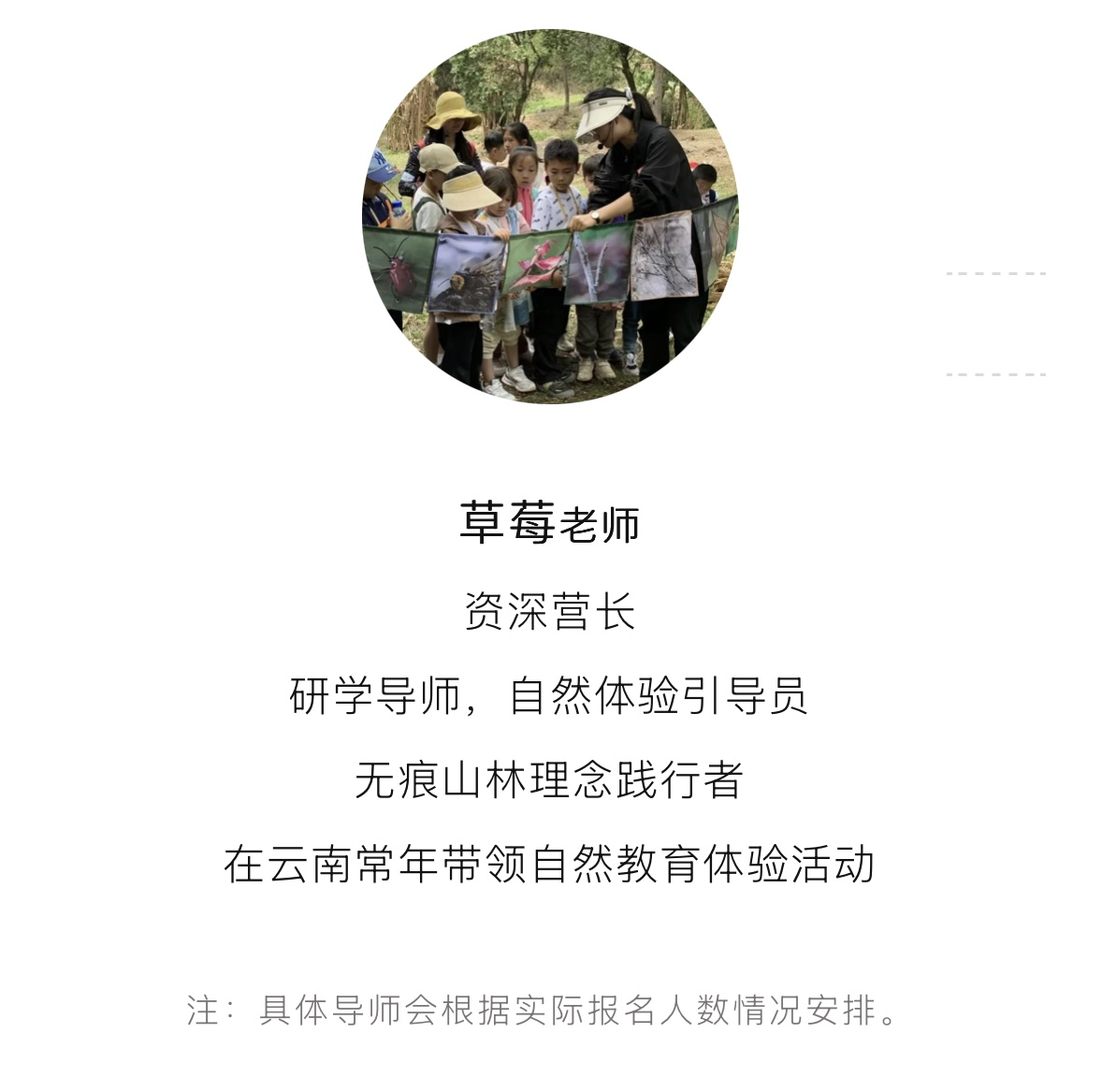 3、定制活动费用,专业领队、专业自然导师,户外课程设计与组织执行、教具物料、场地费用。