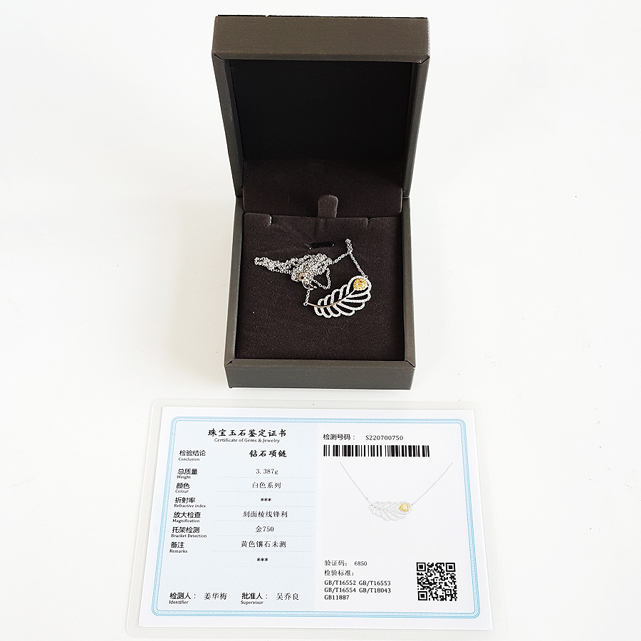 【天然正品】AU750白金时尚简约款0.190克拉羽毛造型钻石吊坠项链230824NJ11+ 现售价:3680!