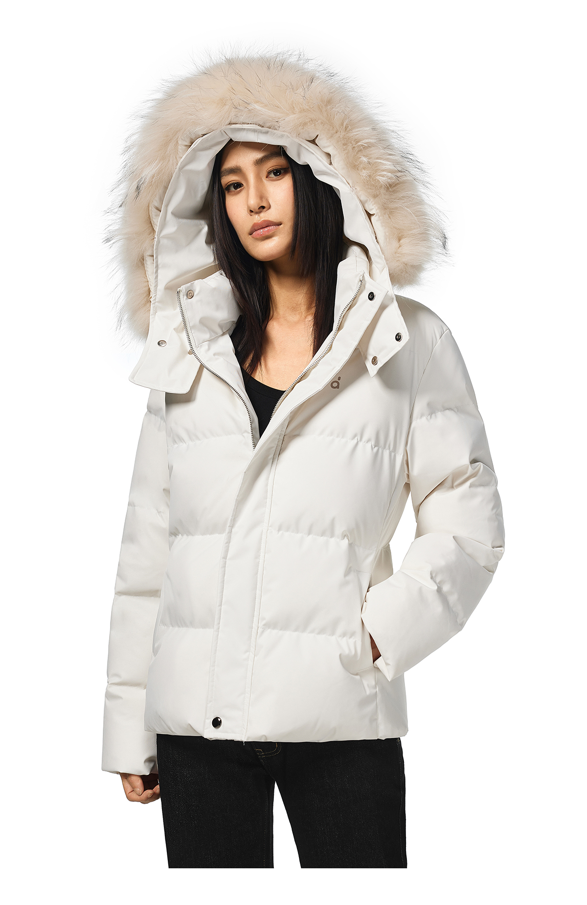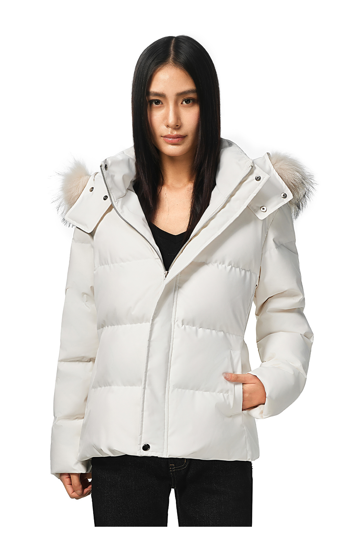 FDR官方店 2025新款白色修身貉子毛毛领外套收腰版羽绒服冬季女款