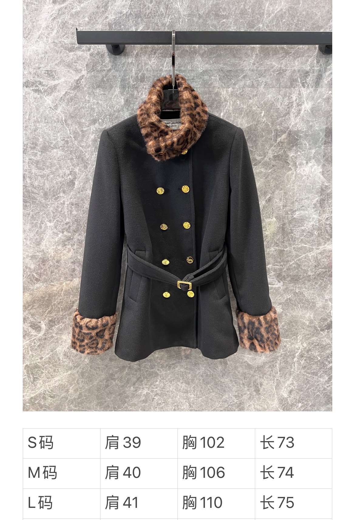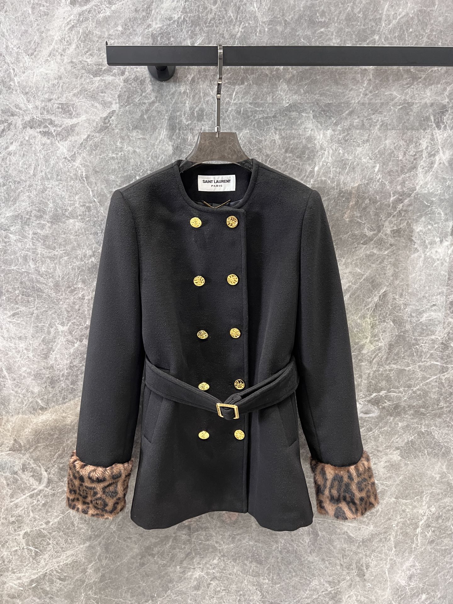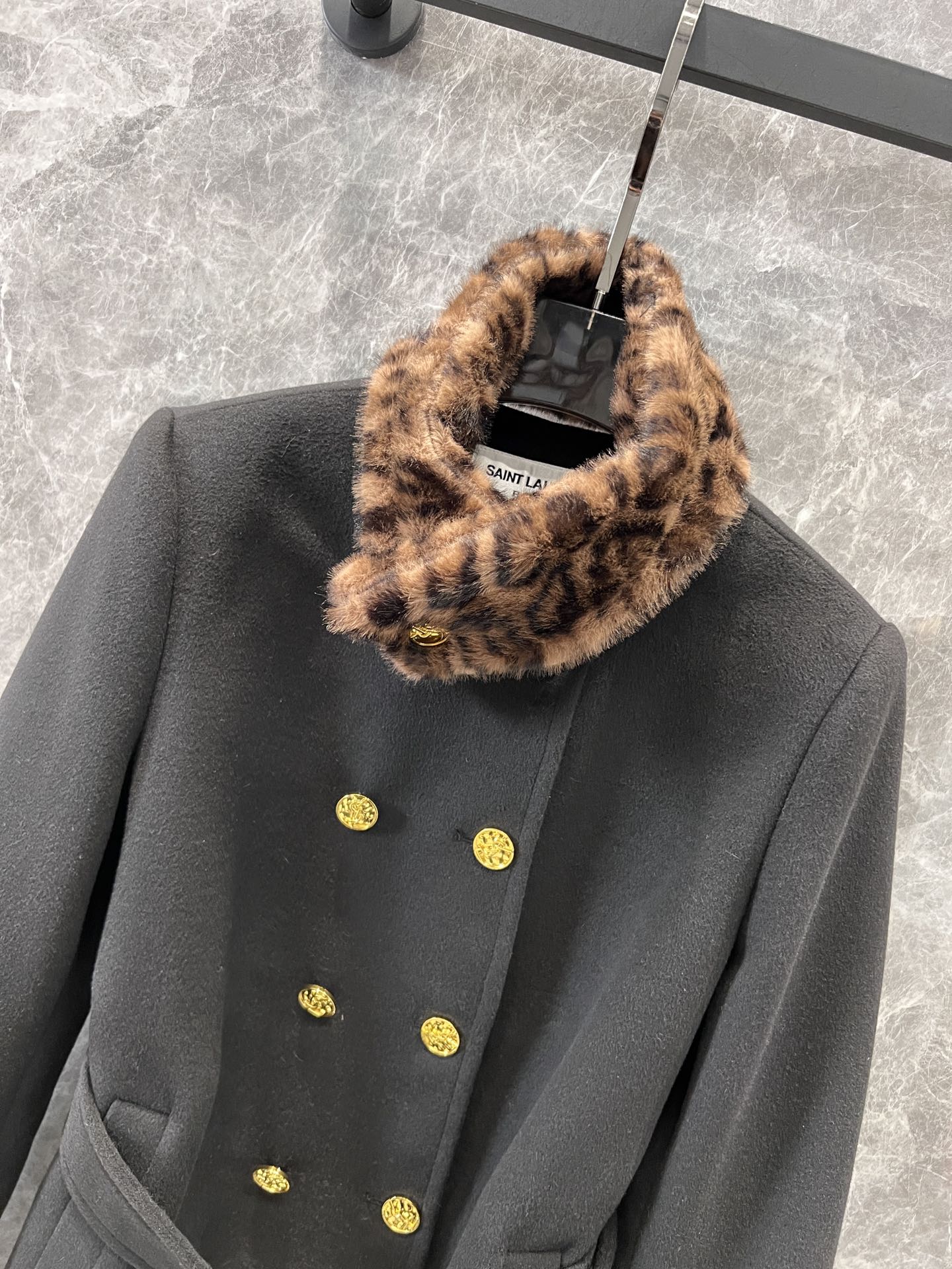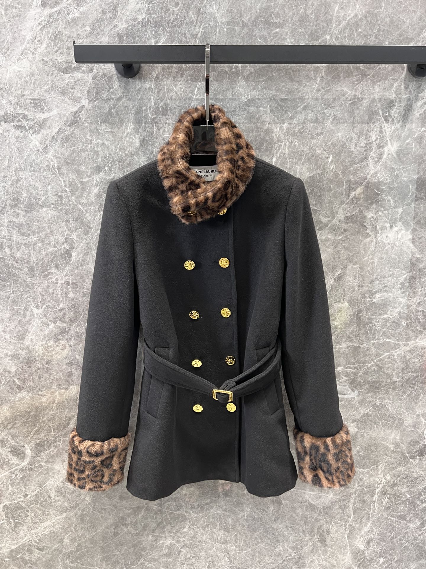 Saint Laurent 24Fw秋冬新款 豹纹拼接围脖设计感双排扣呢大衣腰带外套