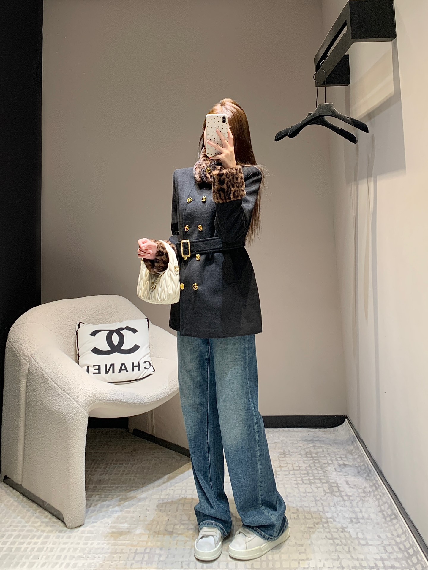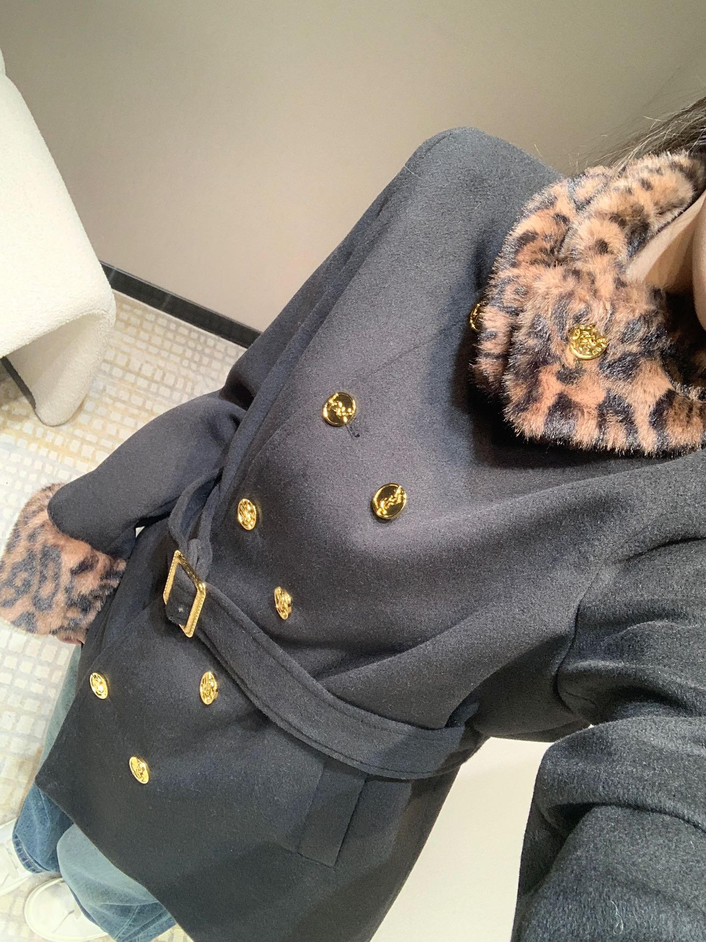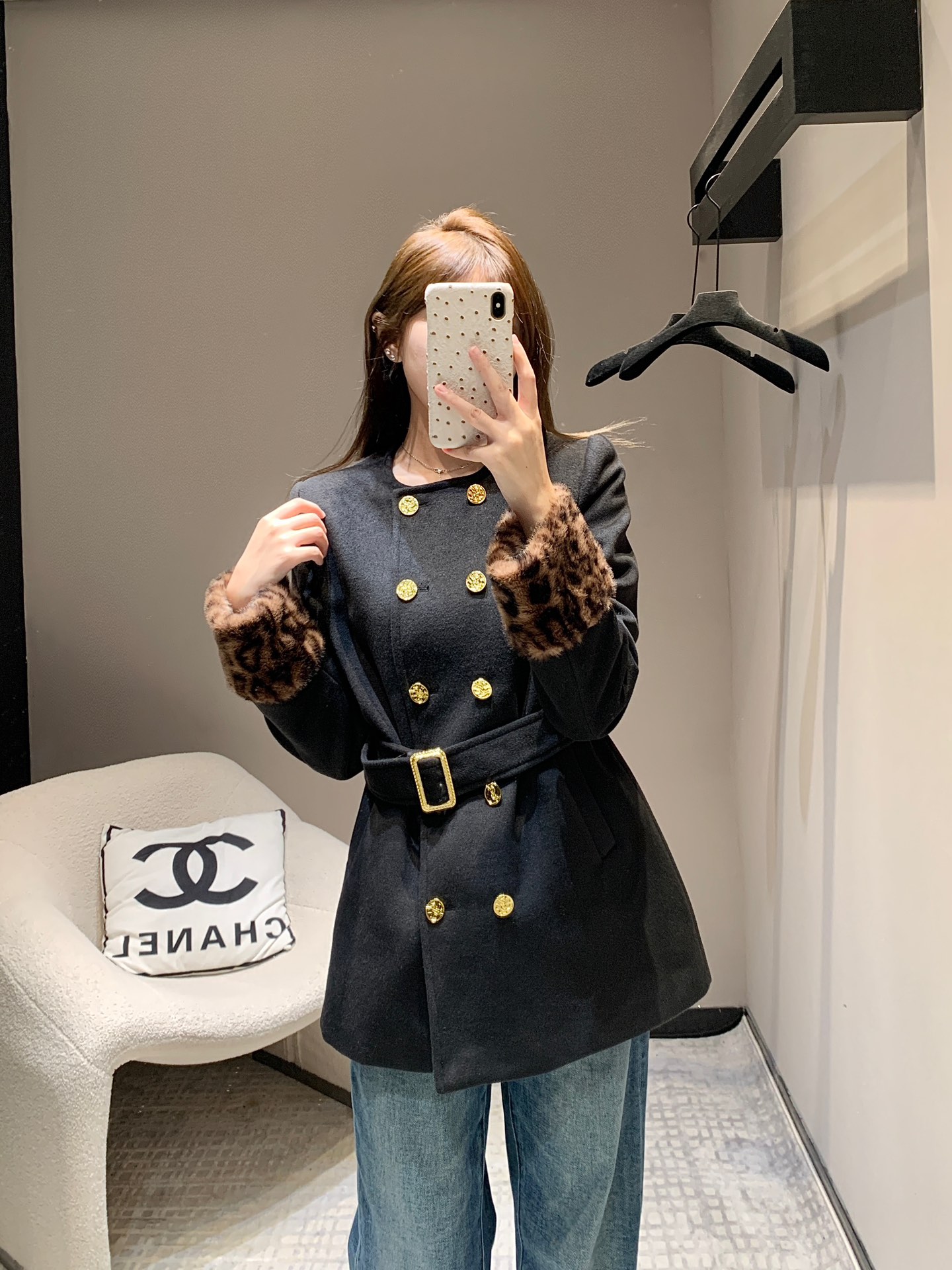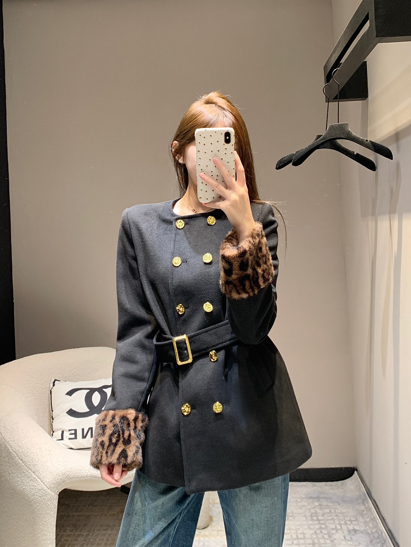 Saint Laurent 24Fw秋冬新款 豹纹拼接围脖设计感双排扣呢大衣腰带外套