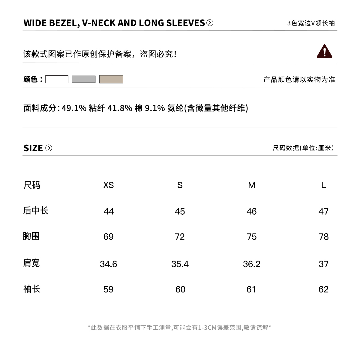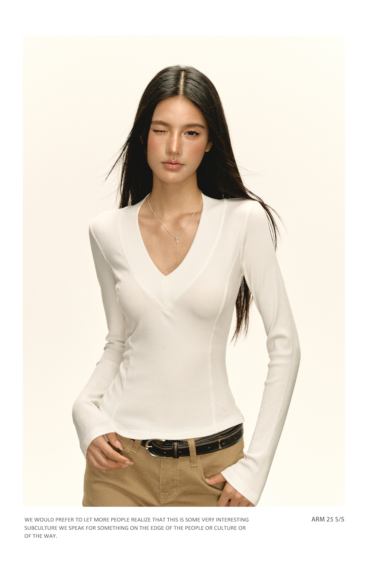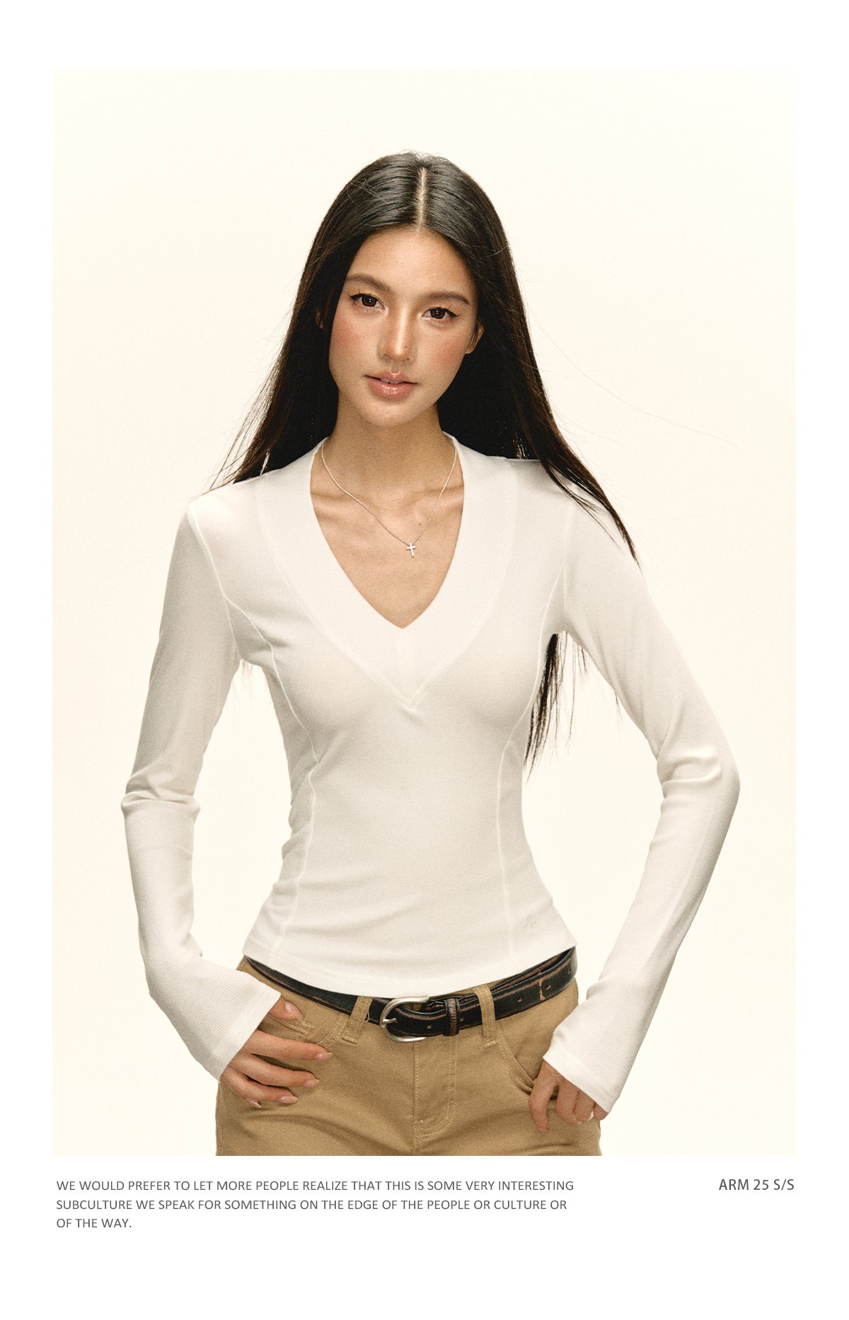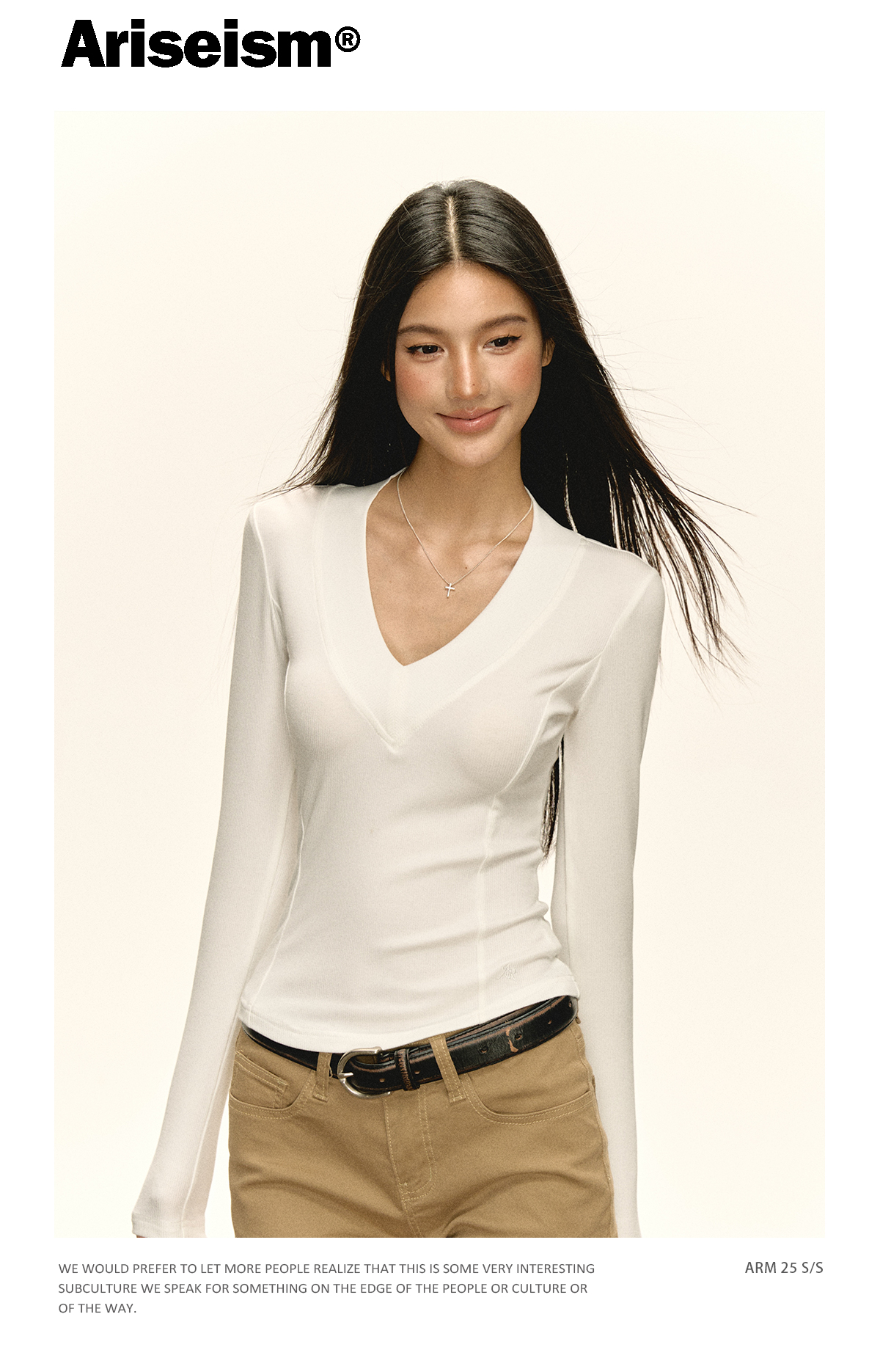 Ariseism 美式复古V领宽边白色长袖t恤女秋季新款修身上衣