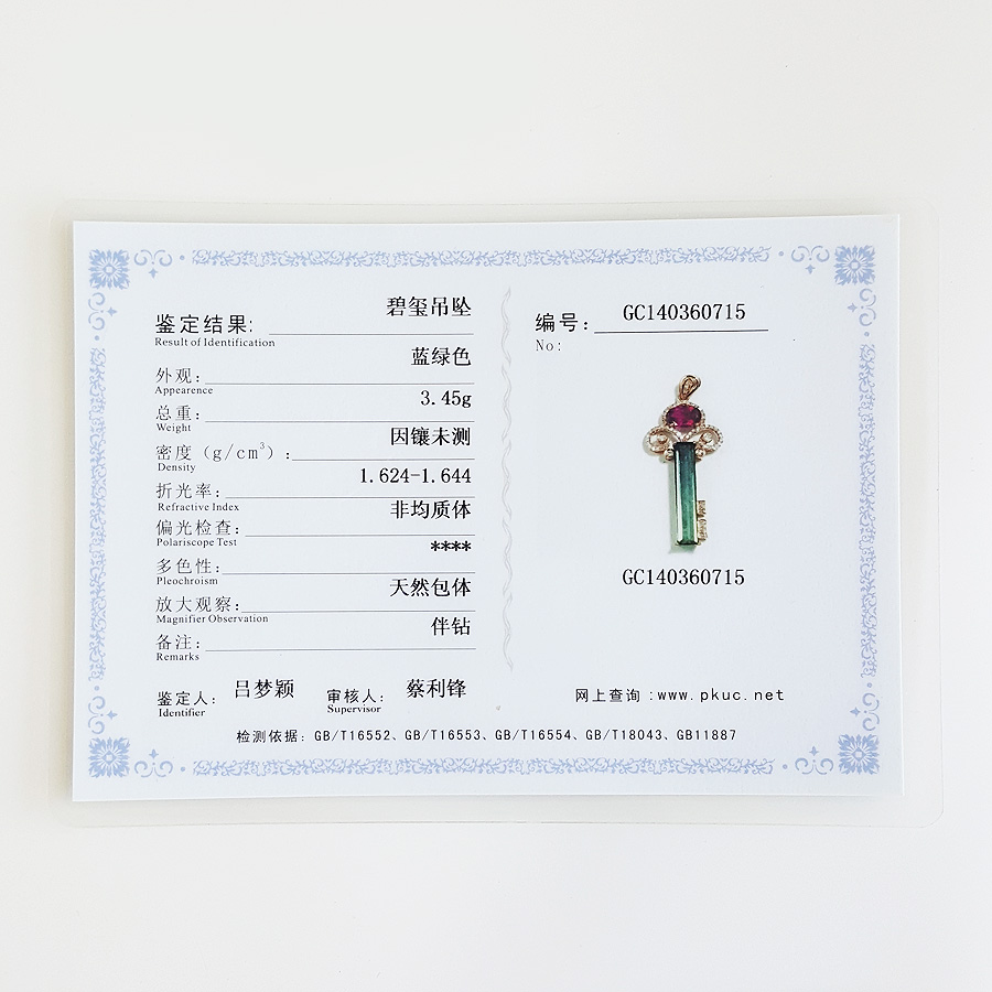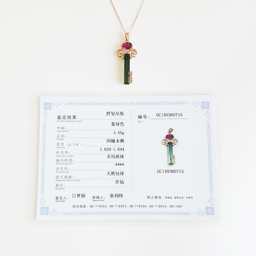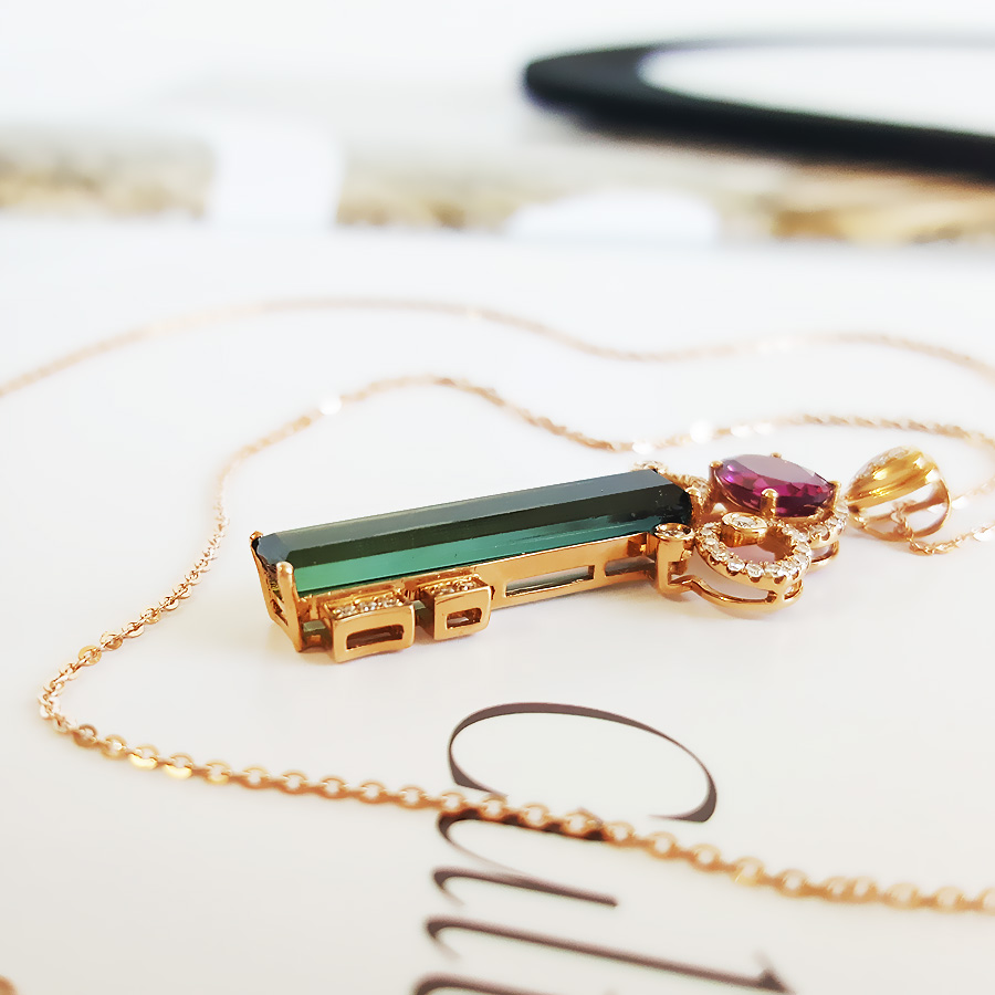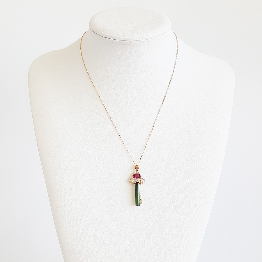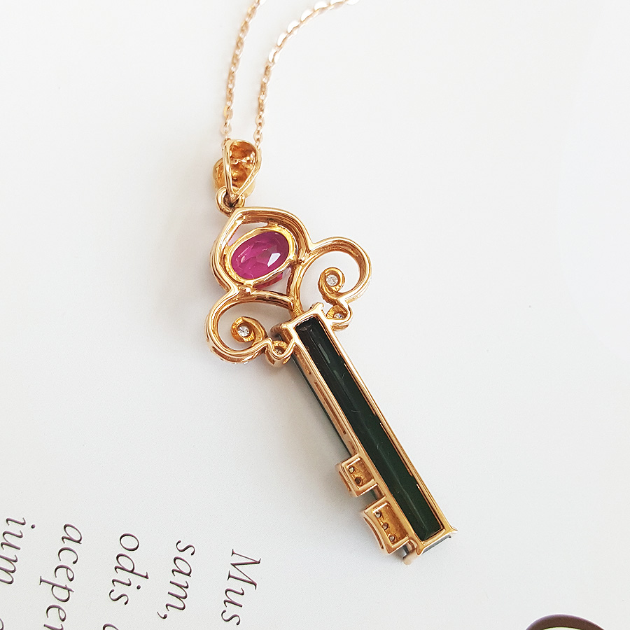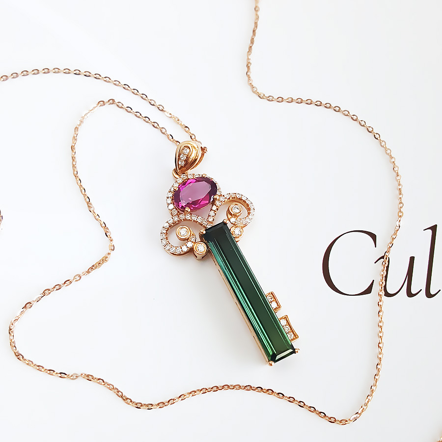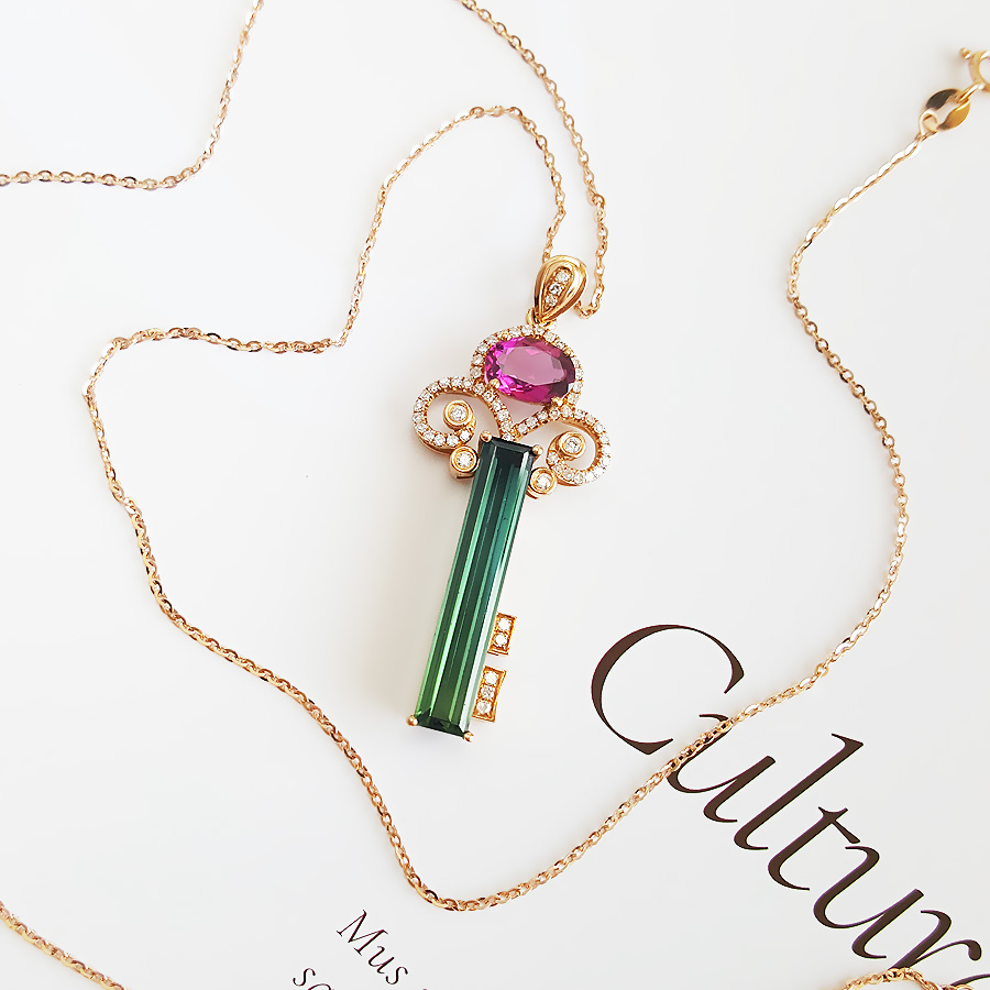 名称 | AU750收藏级玫瑰金镶钻镶天然西瓜碧玺配色钥匙造型吊坠项链 |